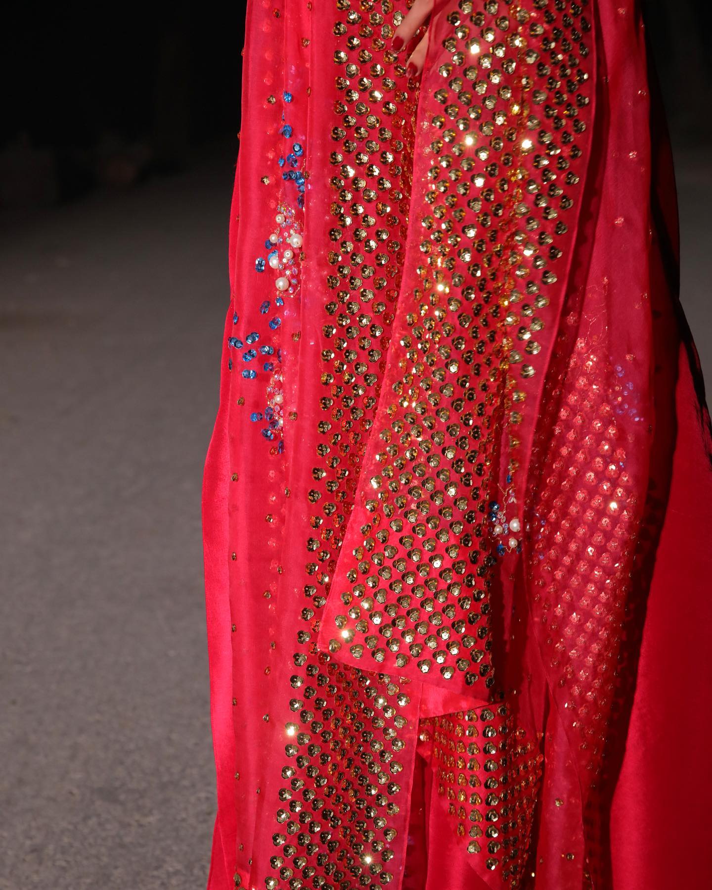 A sensational red silk three-piece set that features a silk top with delicate hand-embellished spaghetti straps and high-side slits, a flattering V-neckline from the back, embellished wide-legged pants, and beautiful sheer embellished dupatta with multi-colored sequins and crystals.