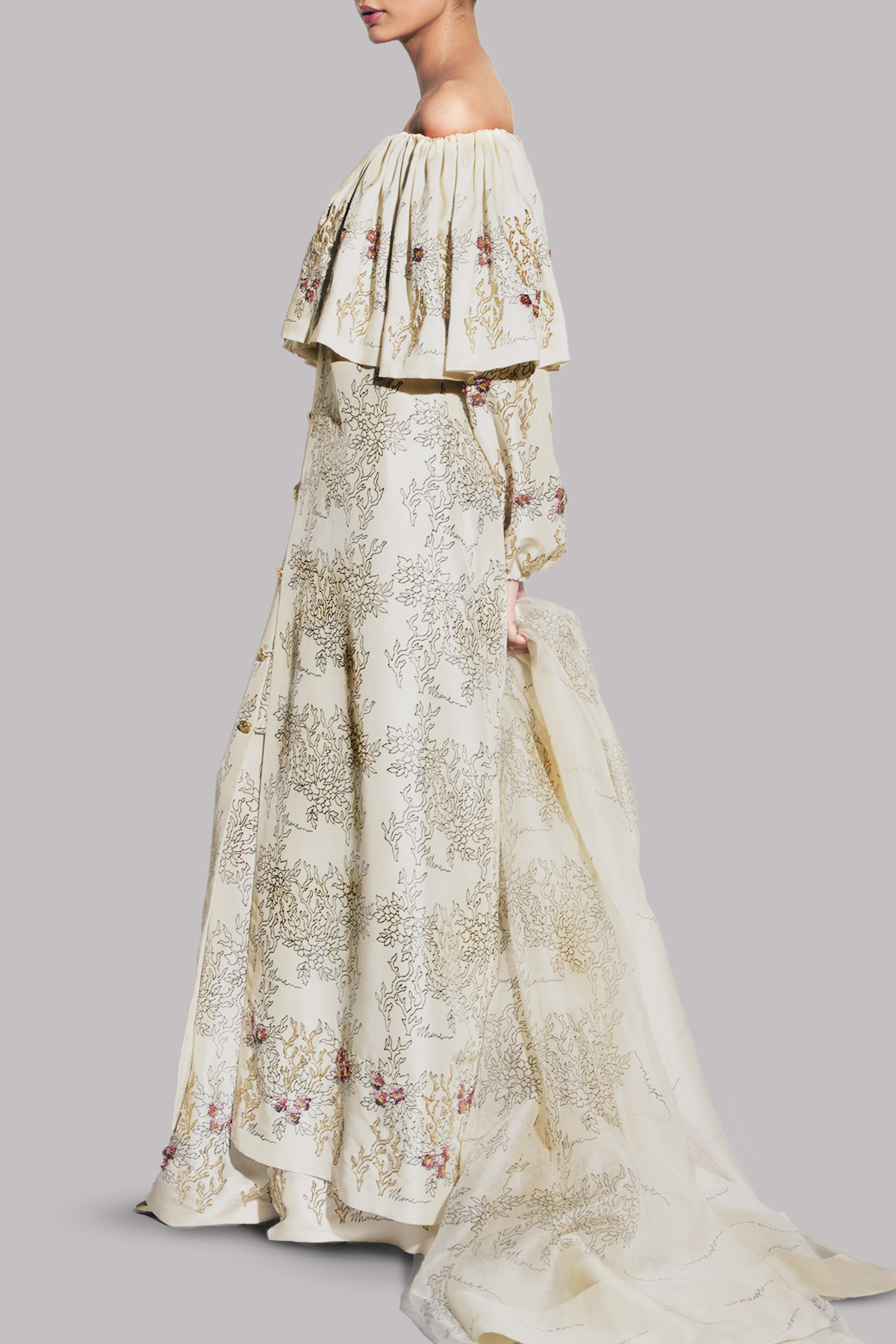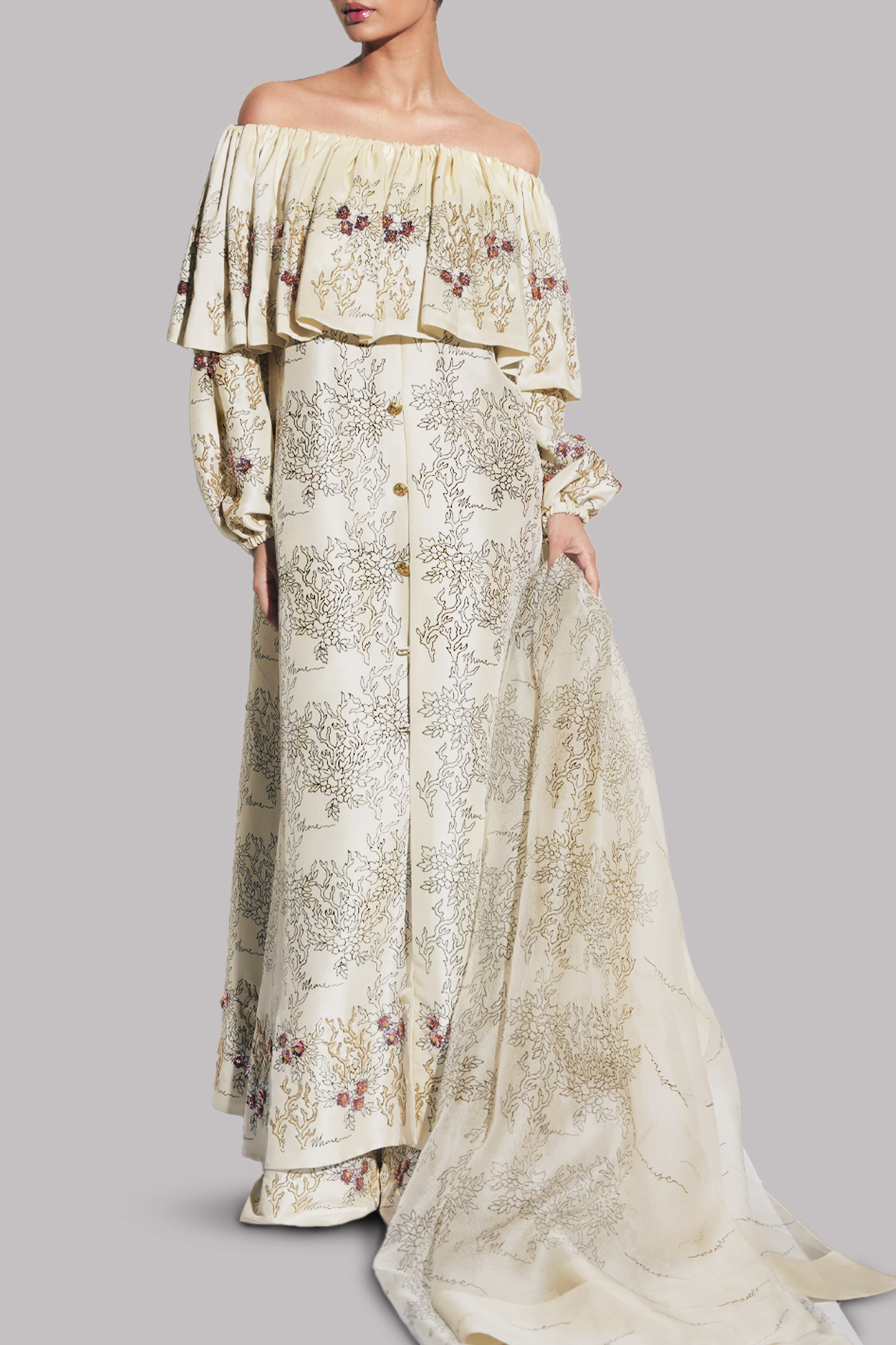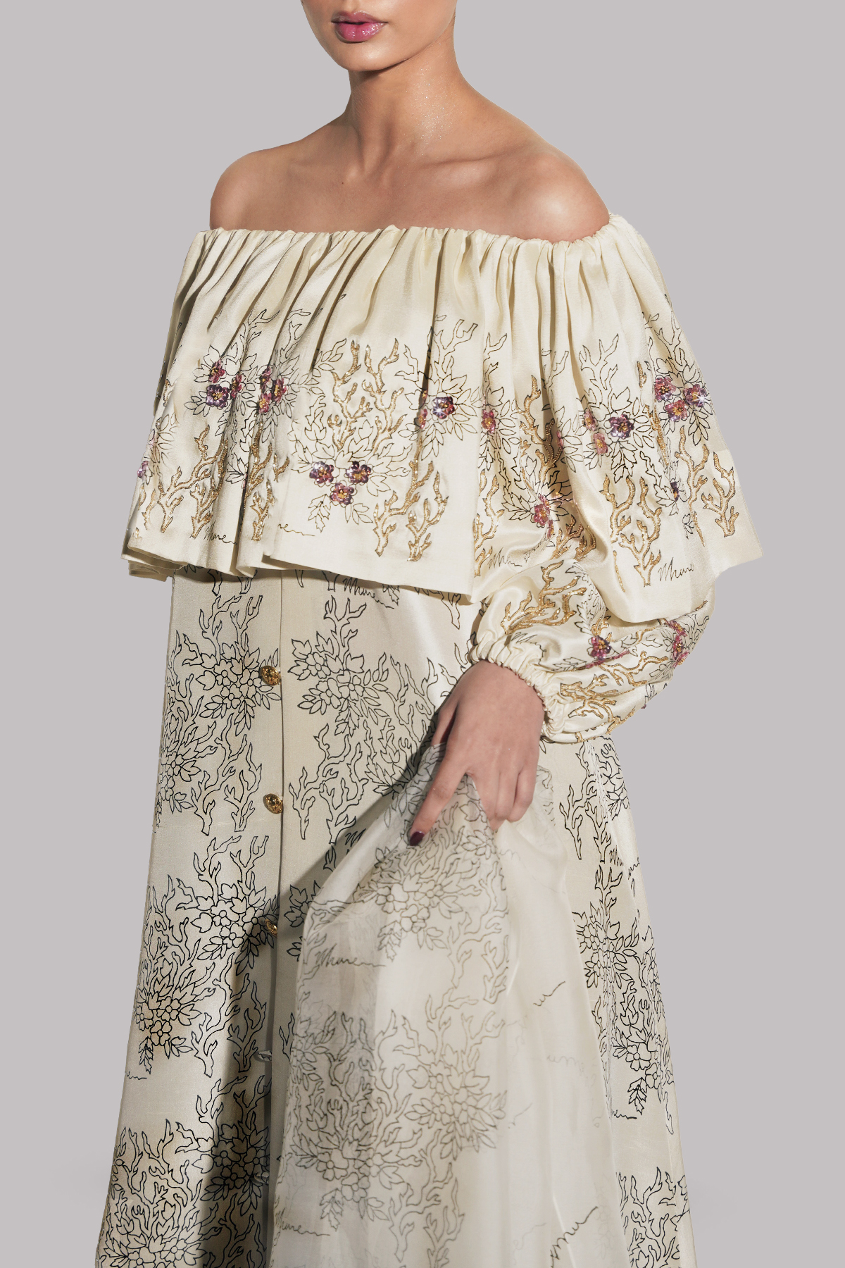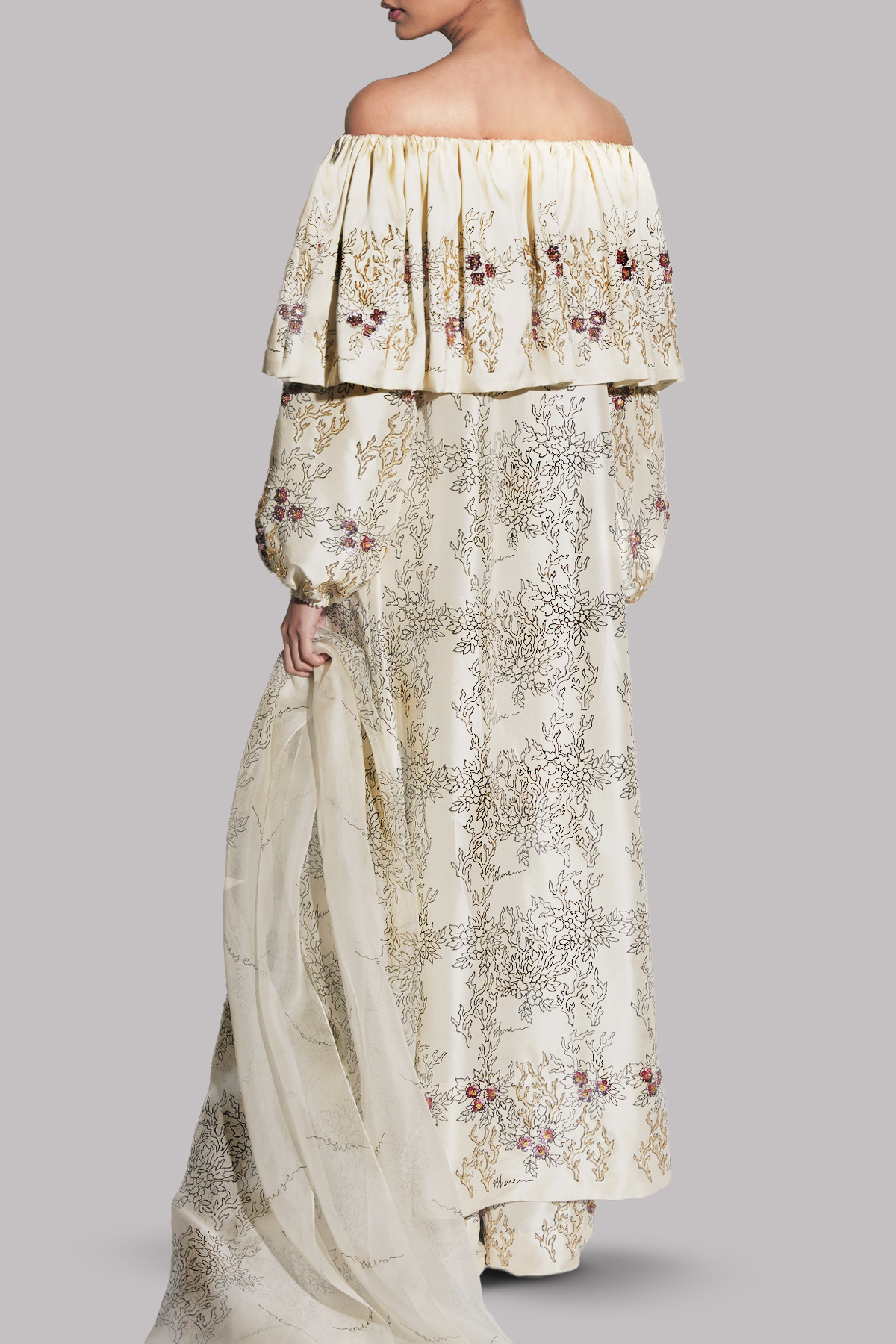 This Afterglow off-shoulder raw silk tunic features a single-layer ruffled neckline, hand block print and delicate embellishments, finished with refined French gold buttons. Paired with a lightly embellished matching palazzo pants and a block-printed organza dupatta.