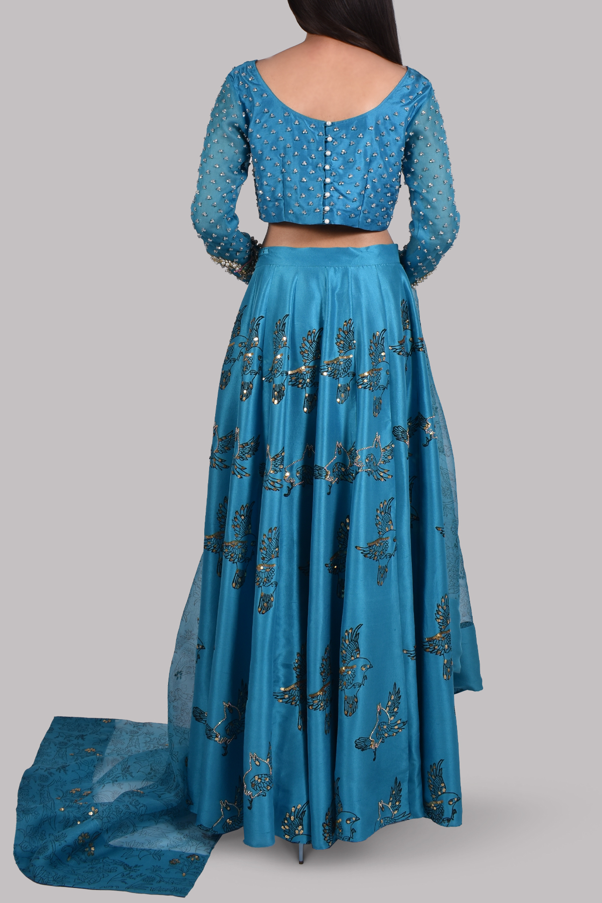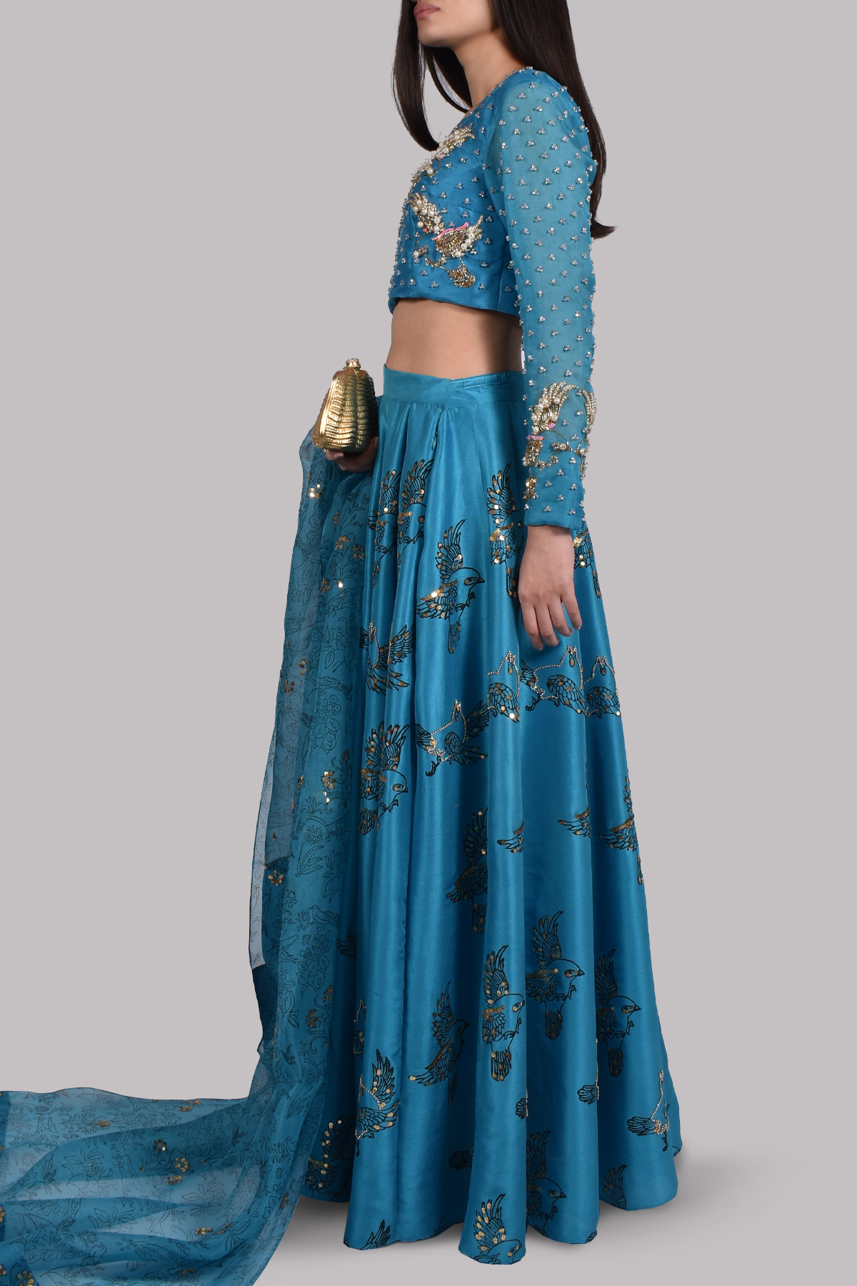 Algiers blue embellished dupion cropped top, dupion skirt, and an organza scarf/dupatta. The cropped top, skirt, and scarf are all hand-embellished with fresh-water pearls and gold paillets in signature MUSE floral motifs. The pleated skirt is 46″ long.