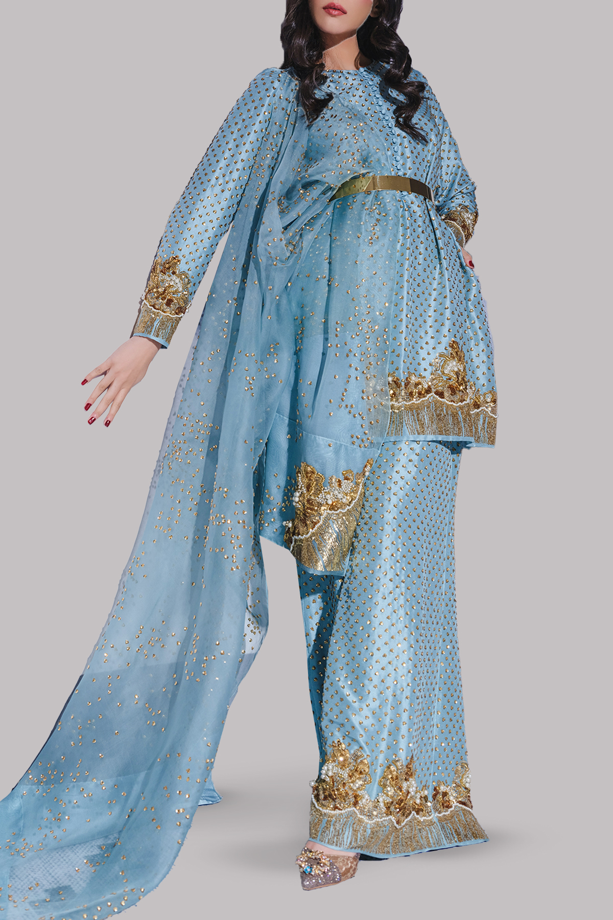 Aqua oversized dupion silk top, hand embellished with gold sequins, beads, and freshwater pearls. Matching embellished raw silk shalwar pants and embellished organza dupatta.