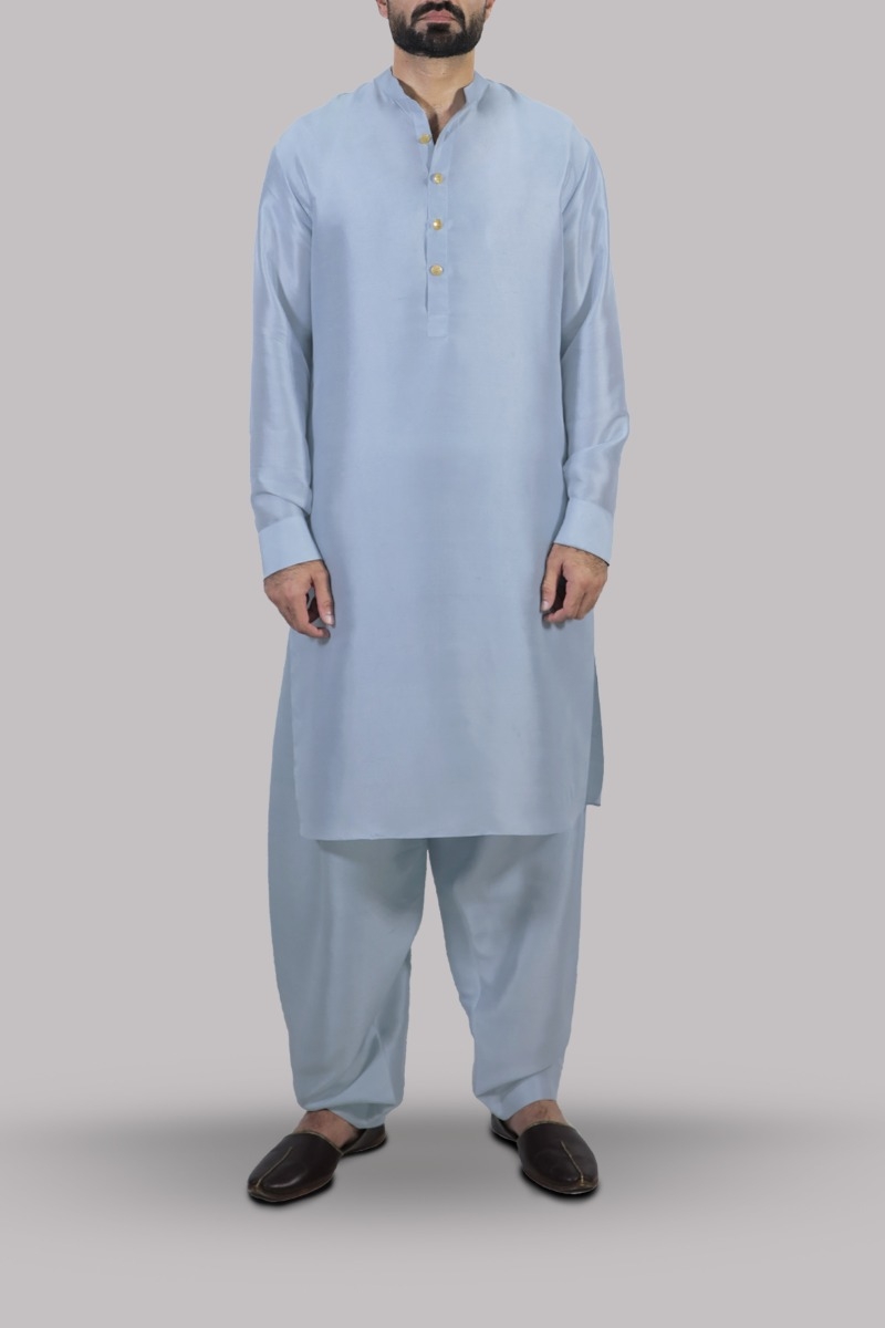 Aquamarine oversized raw silk collared shirt adorned with French buttons. It’s impeccably tailored with matching raw silk shalwar pants.