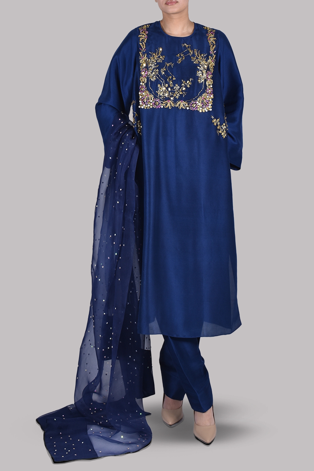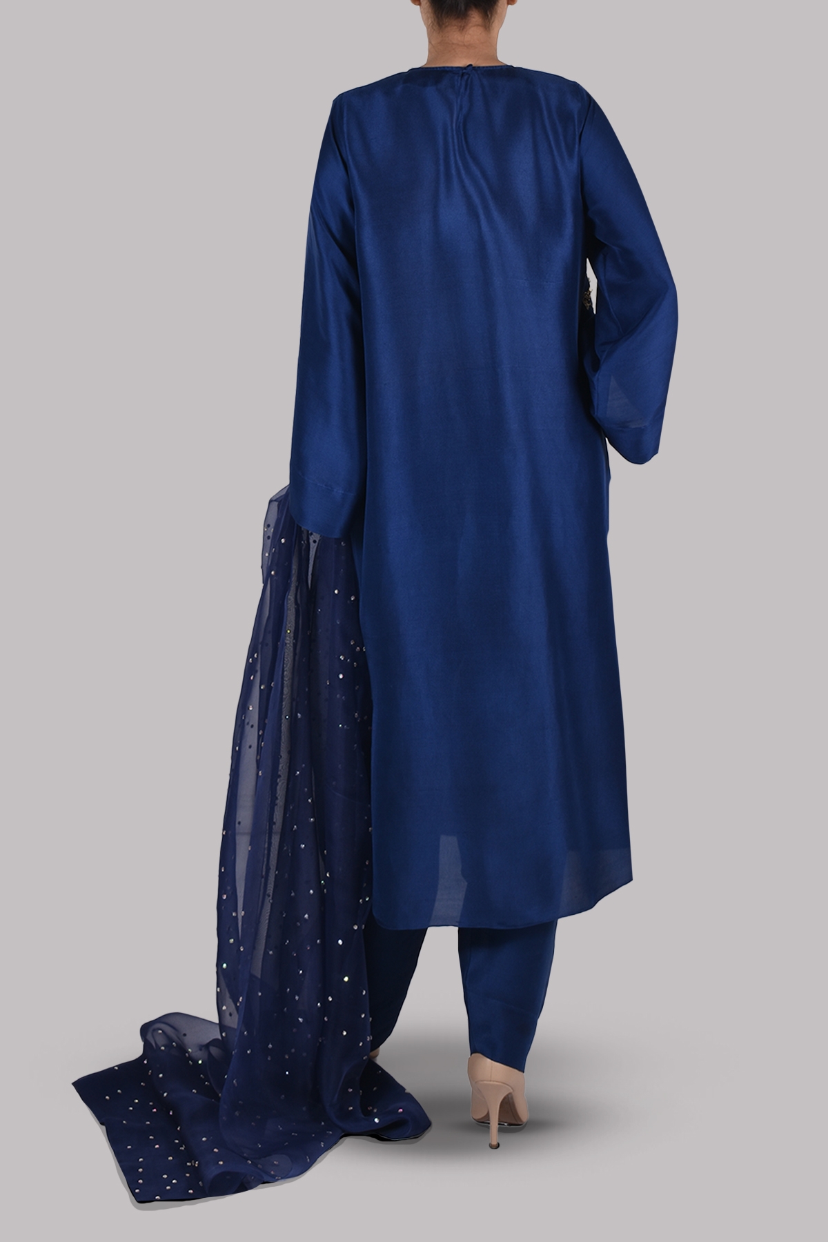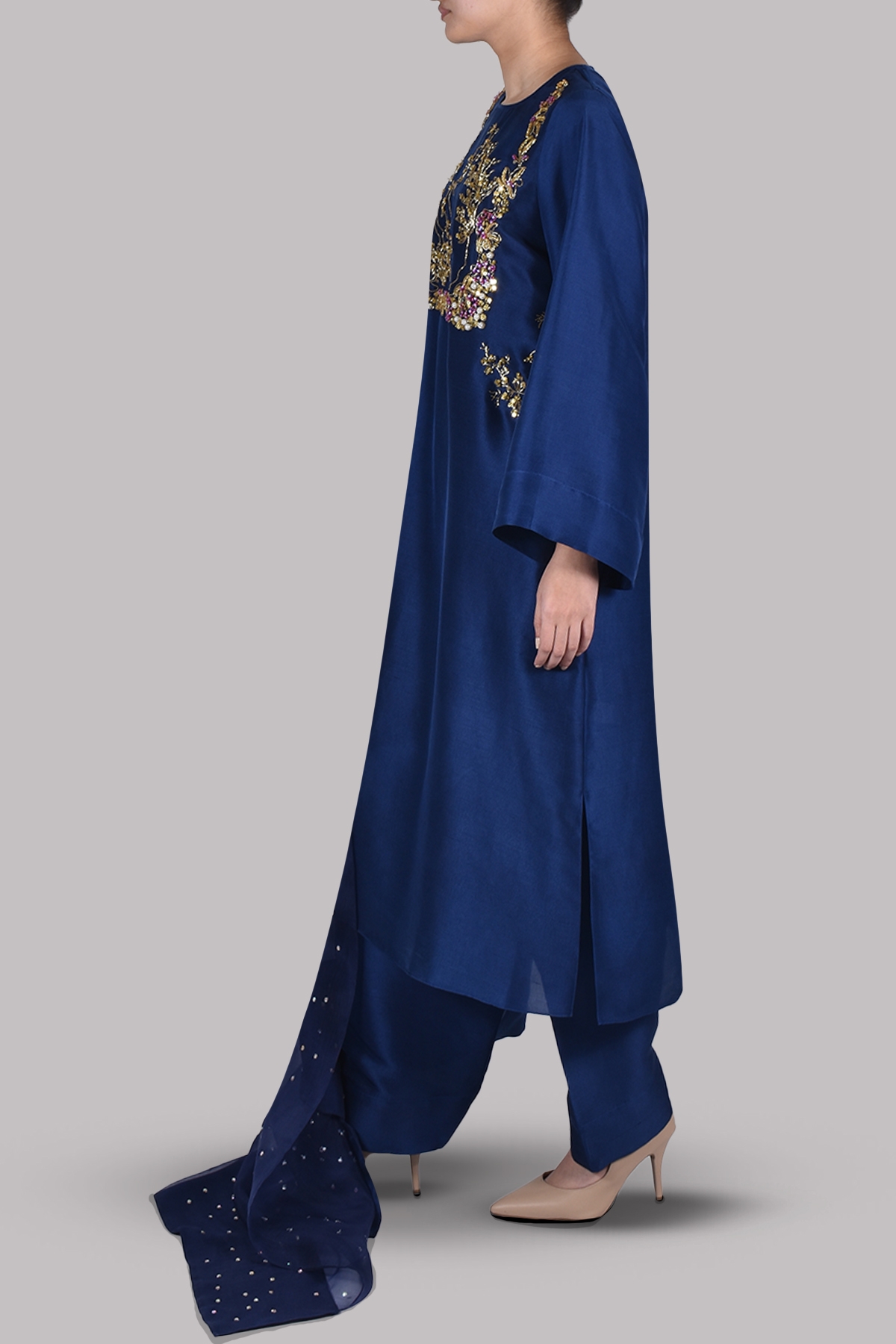 Astral aura embellished tunic, shalwar and dupatta set, crafted from the finest silk. The shirt has wide sleeves and is paired with a tailored shalwar and a lightly embellished dupatta. Perfect for a formal gathering.