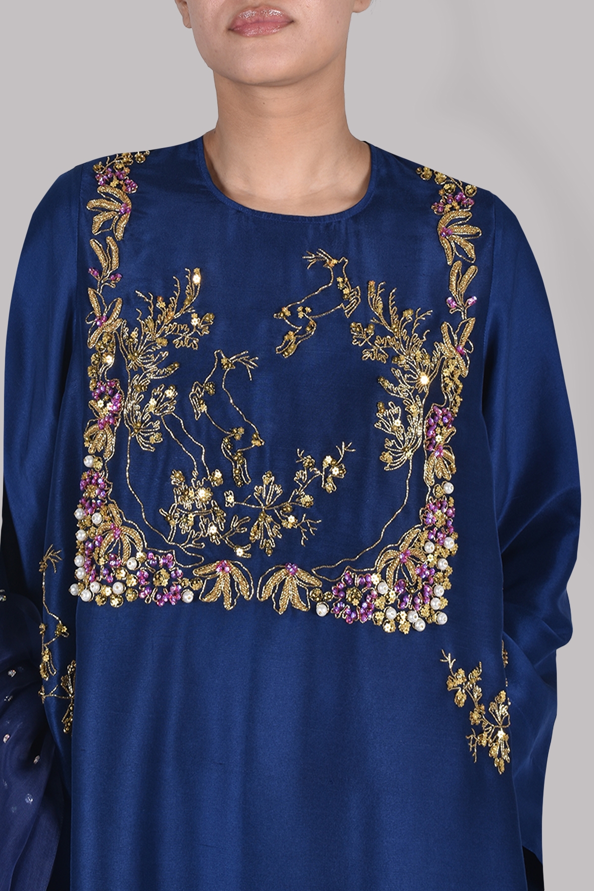 • We have provided the tunic measurements below. The dupatta is 3 yards long. The Shalwar is 41.5 inches long.