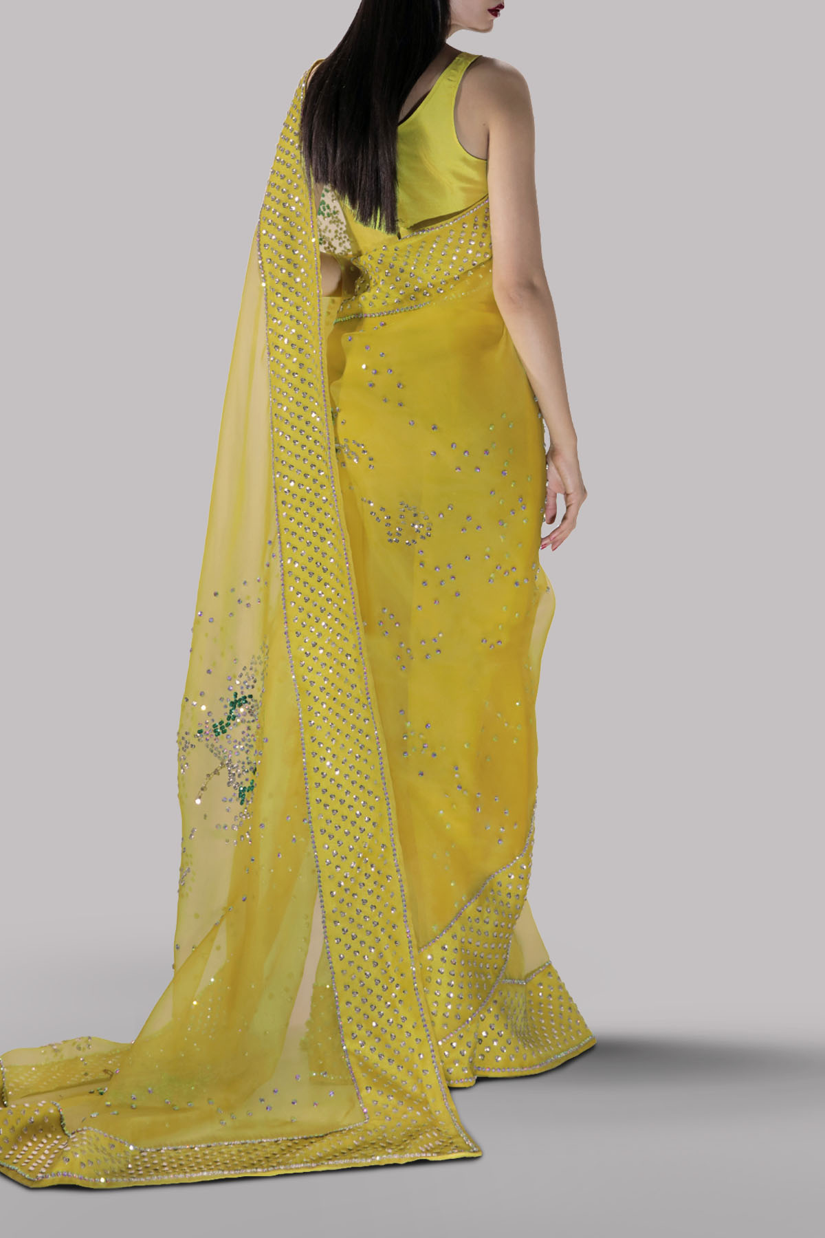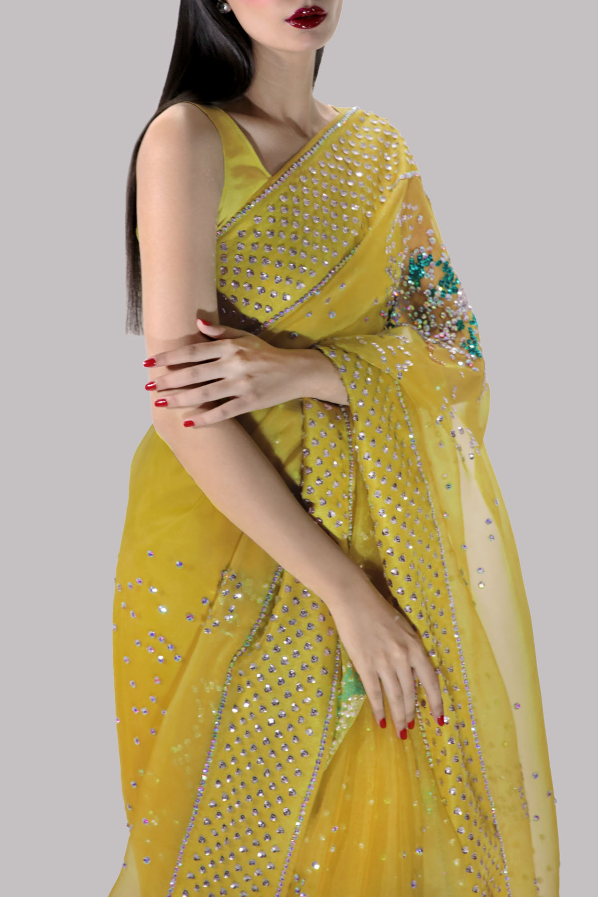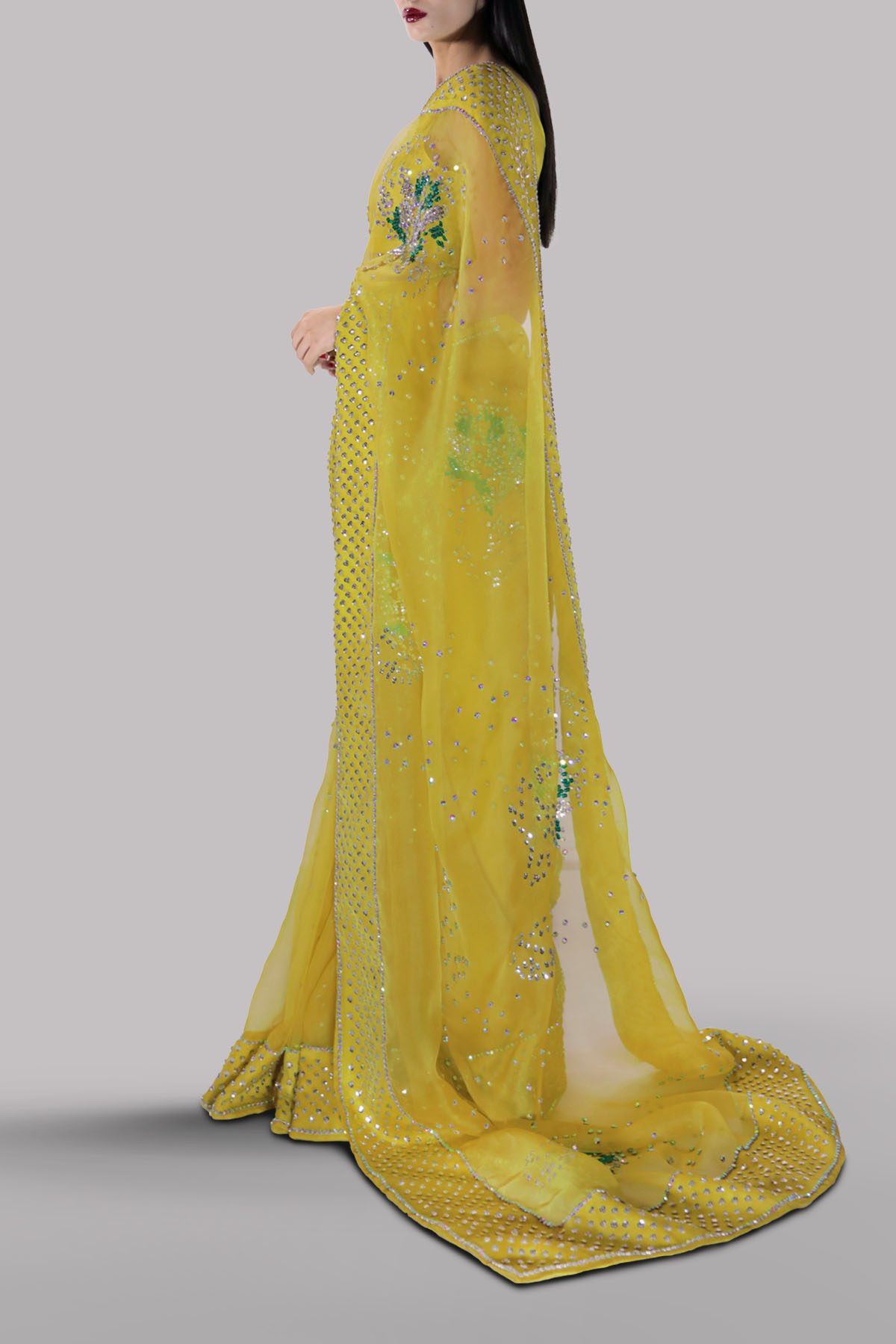 Aurora yellow organza sari and cropped blouse, hand embellished with intricate embellishments of freshwater pearls, dazzling crystals, and multi-coloured glittering sequins. A sophisticated and modern take on the traditional sari. The sari has stitched pleats for ease of wearing. Matching stitched underskirt included.
