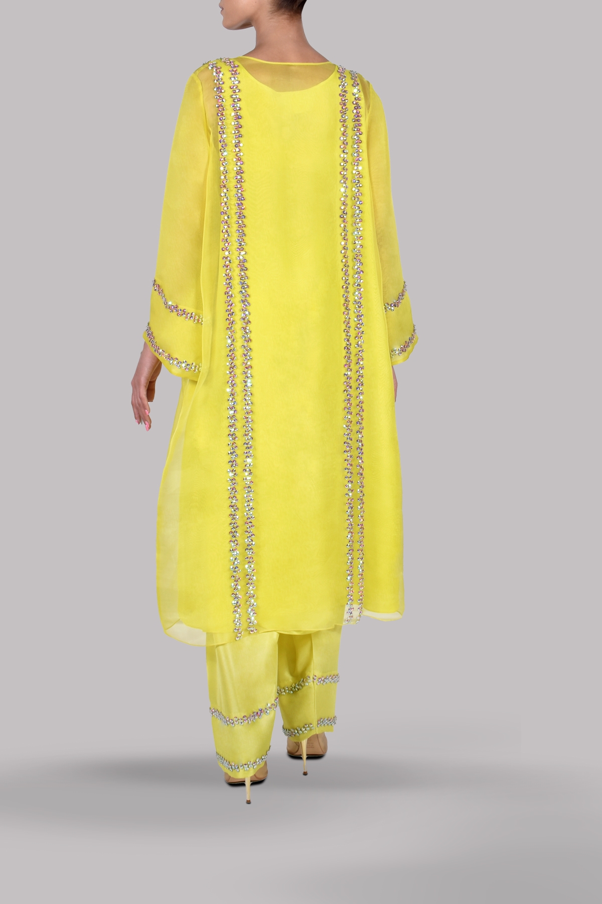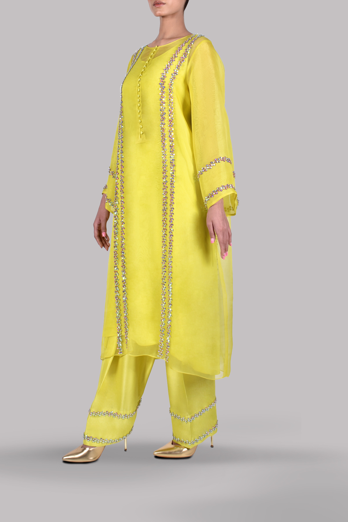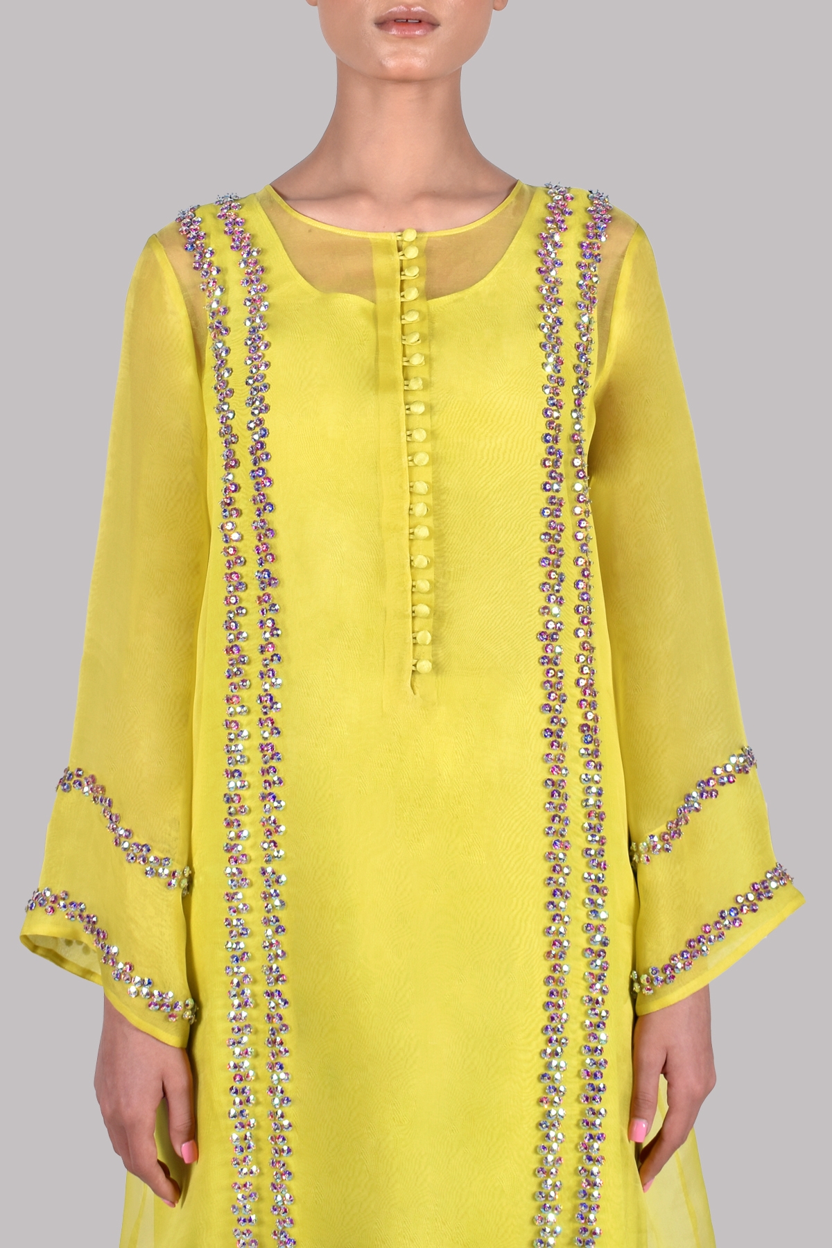 Aurora Yellow close neck organza tunic decorated with sparkling crystals with perfect cut and extravagant details, it’s impeccably tailored with matching embellished raw silk shalwar pants.