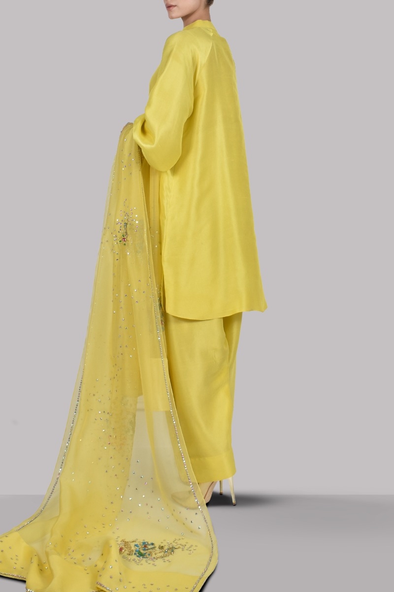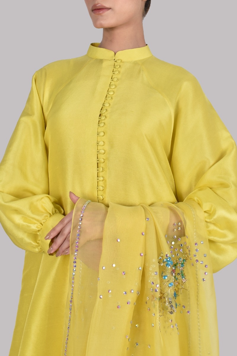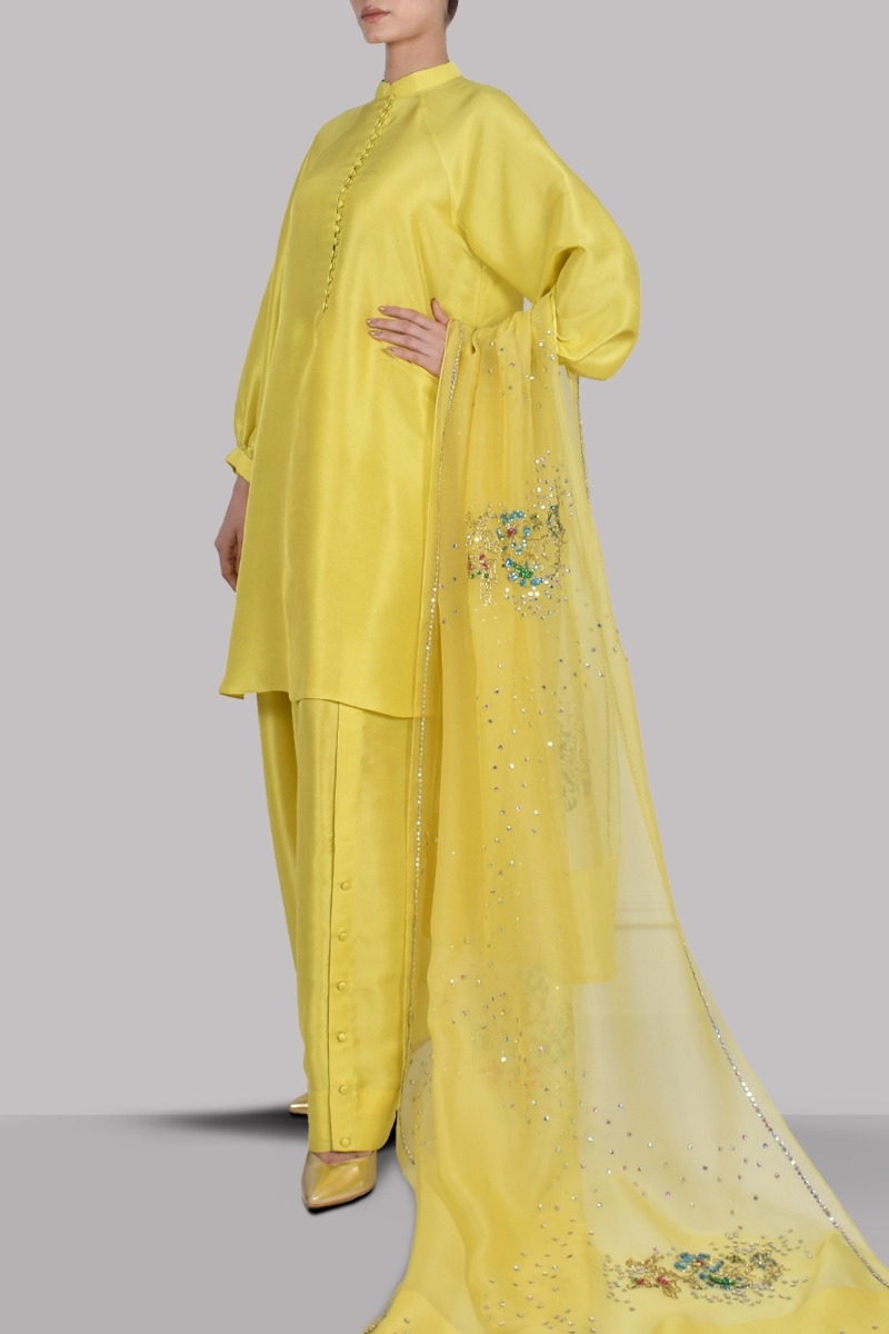 Aurora Yellow raw silk shirt, It’s impeccably tailored with matching raw silk shalwar pants finished with fabric buttons paired with embellished organza dupatta.