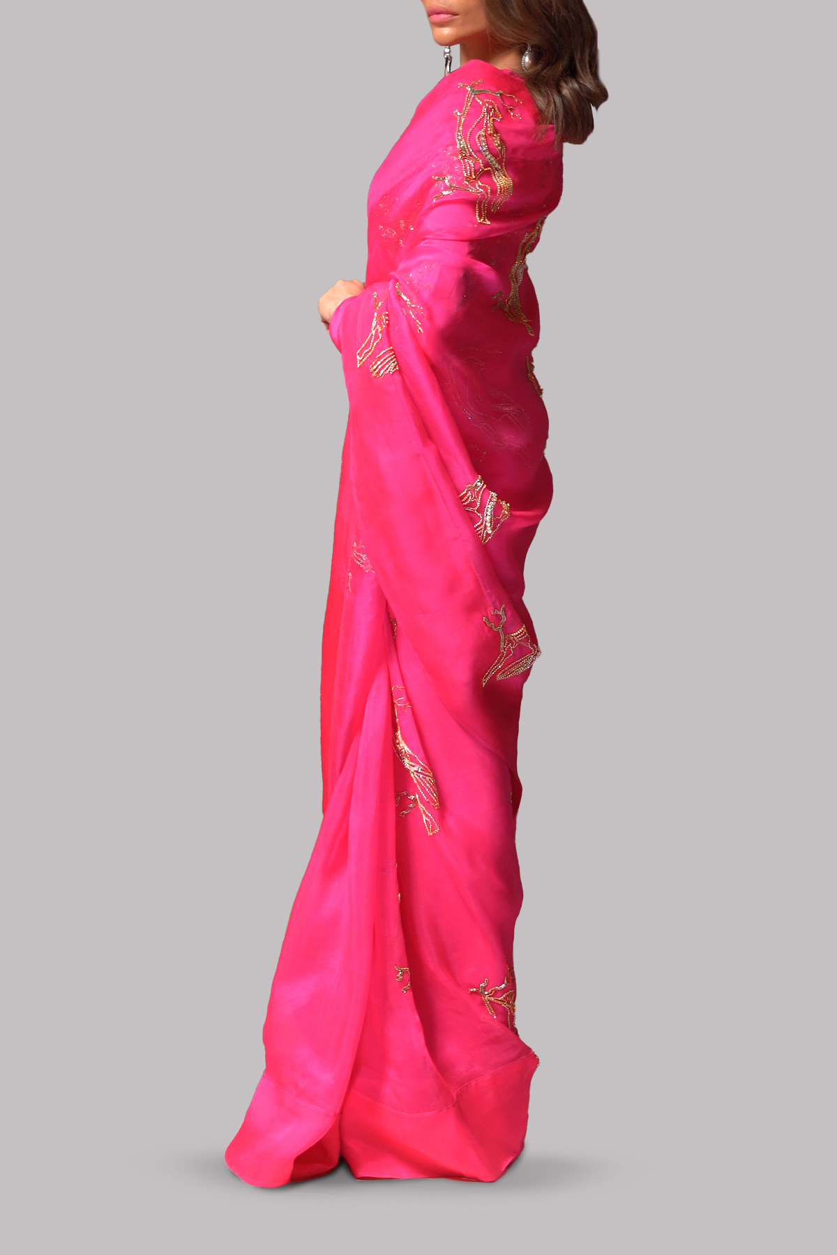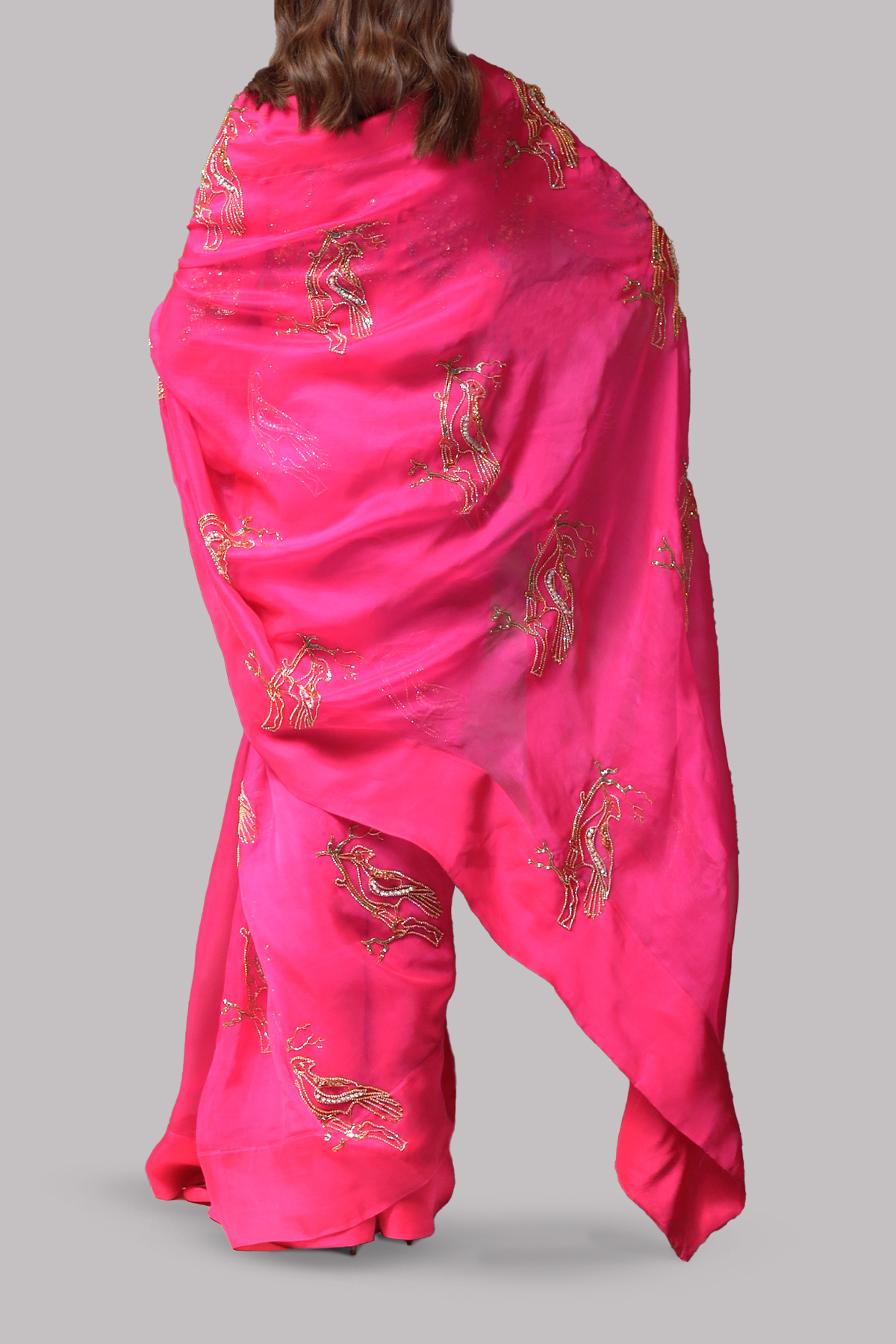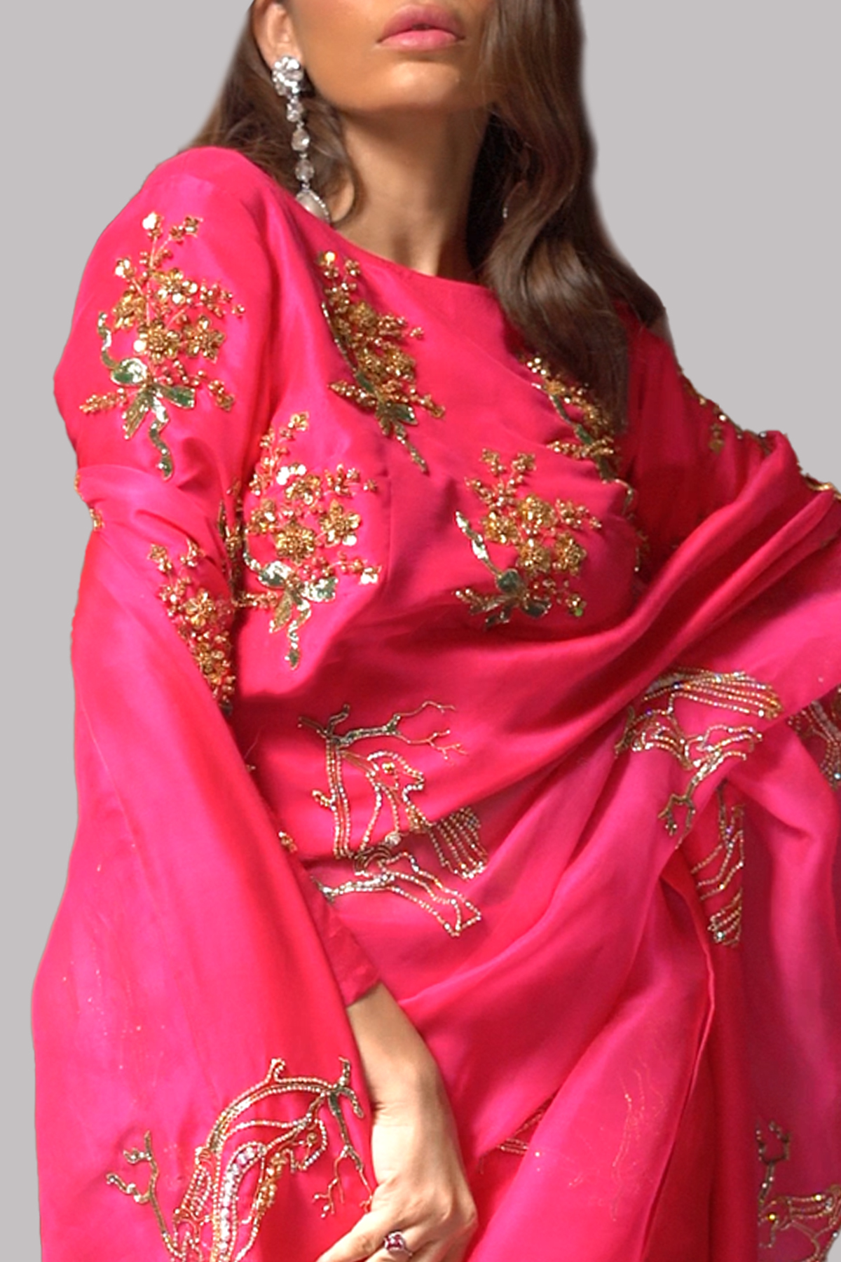 Grace meets glamour in this Beetroot Purple embellished sari, crafted from lightweight fabric for an elegant drape. Paired with a richly adorned raw silk blouse, featuring intricate embroidery and sequin detailing.