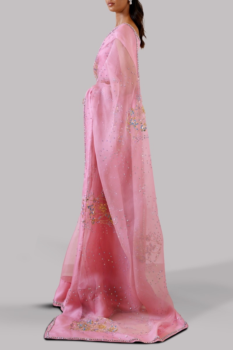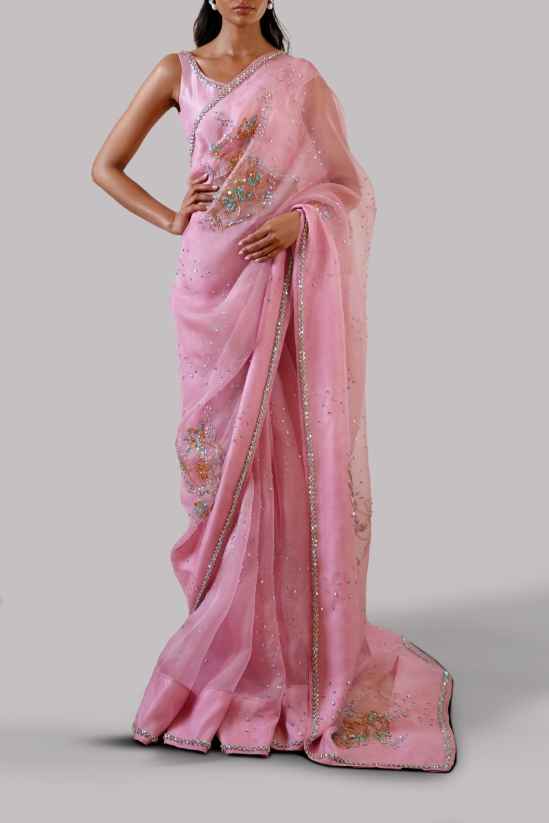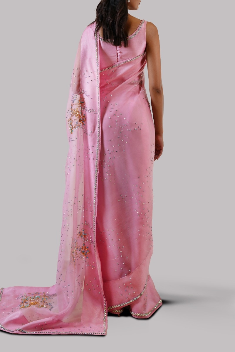 Begonia Pink organza sari and blouse hand embellished with intricate embellishments of dazzling crystals and multi coloured glistening sequins. Matching sleeveless cropped blouse. This is a stylish and perfect three piece look. The sari has stitched pleats for ease of wearing. Matching stitched underskirt included.
