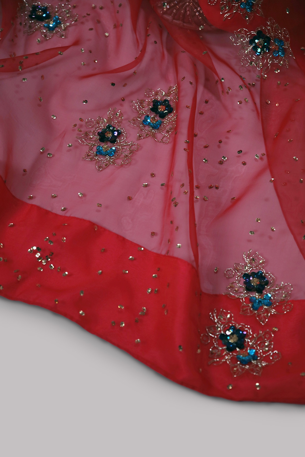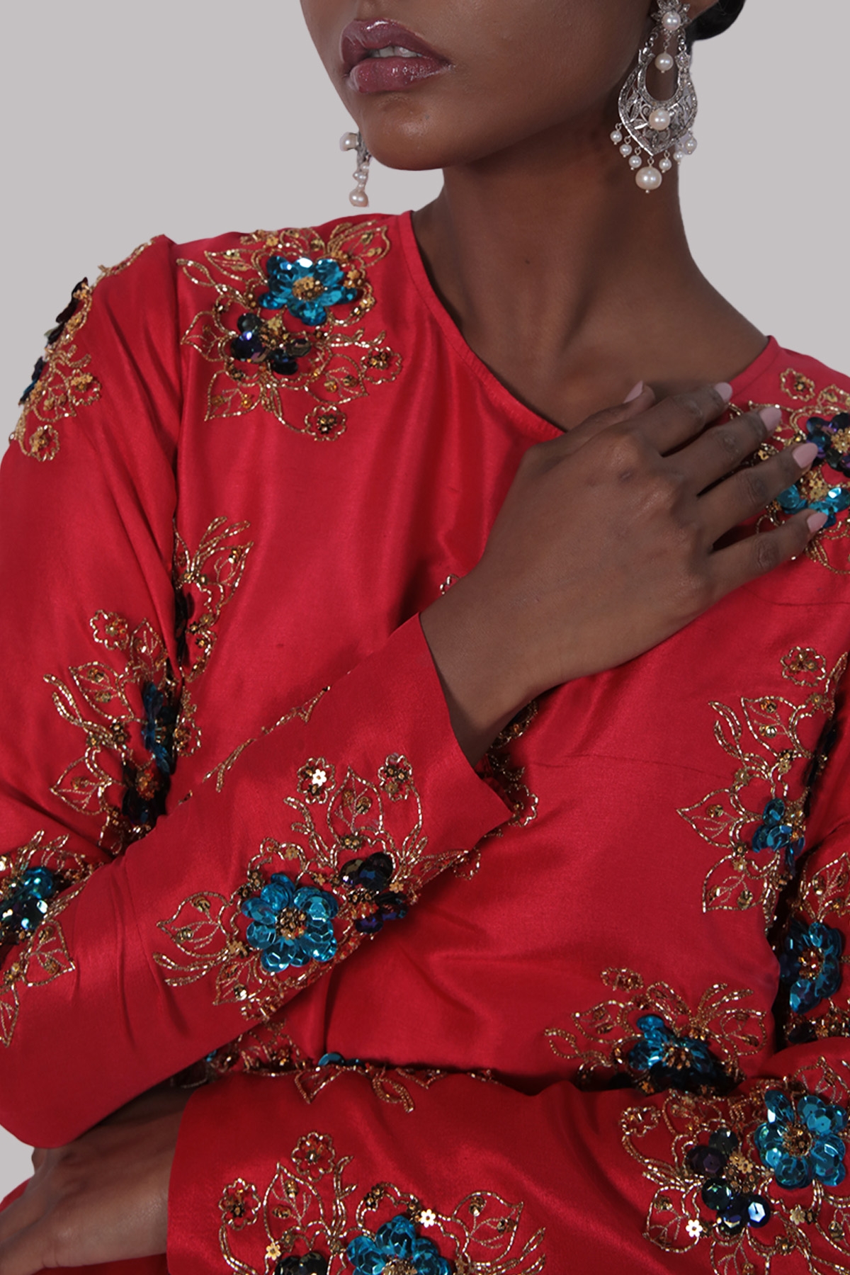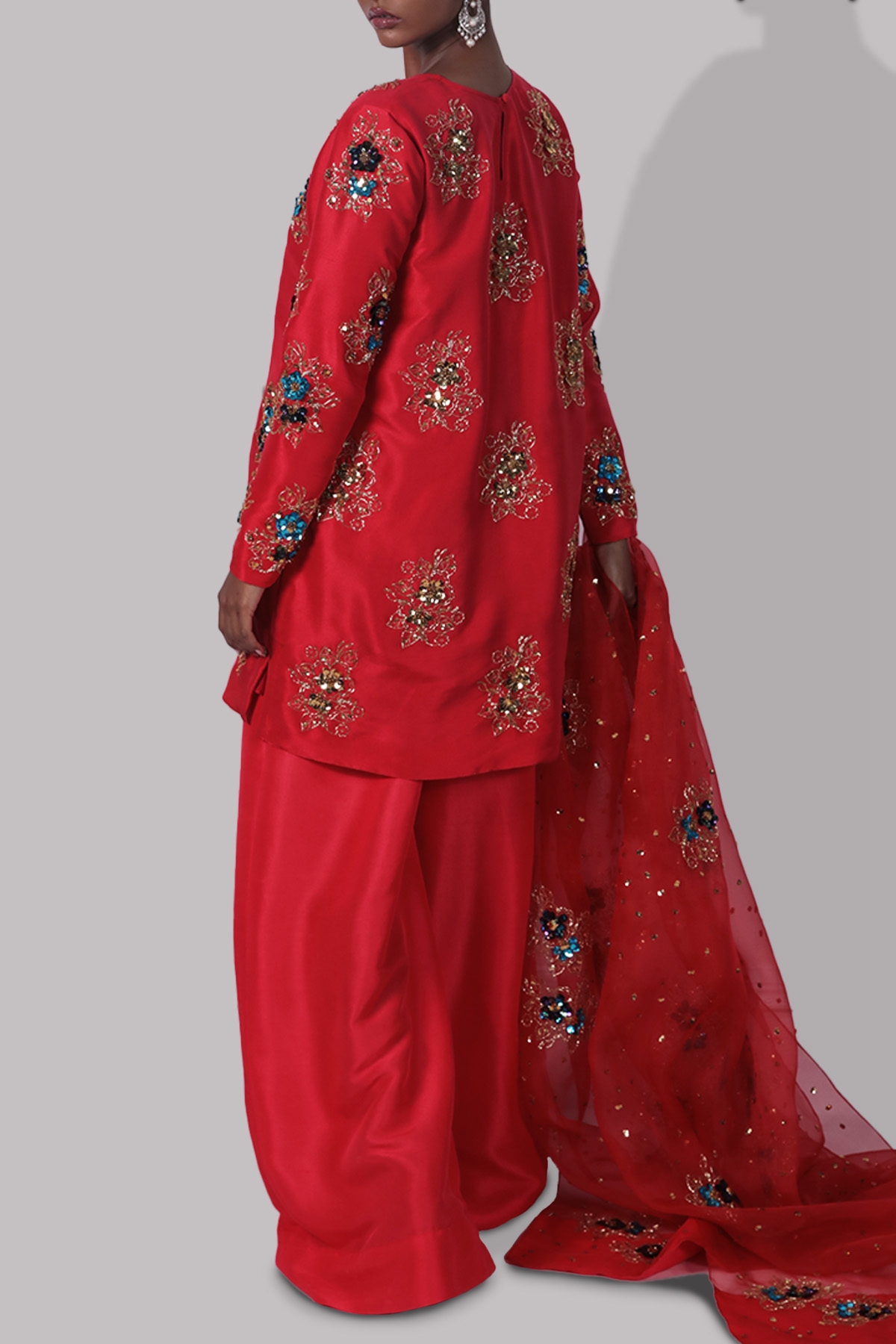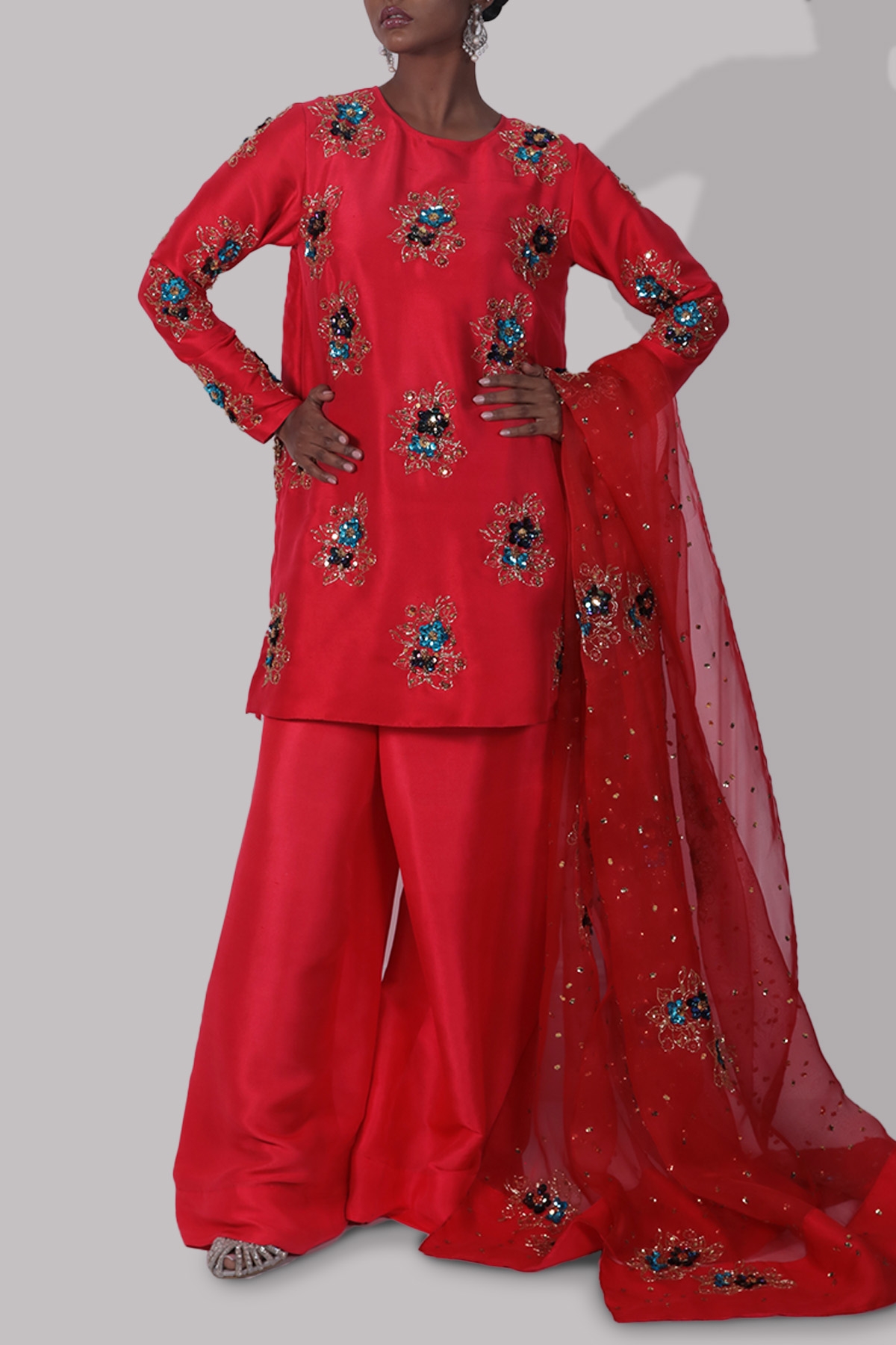 Bittersweet, close neck raw silk shirt, hand embellished with multi-coloured French and Italian sequins. Matching raw silk wide legged pants and embellished organza dupatta.