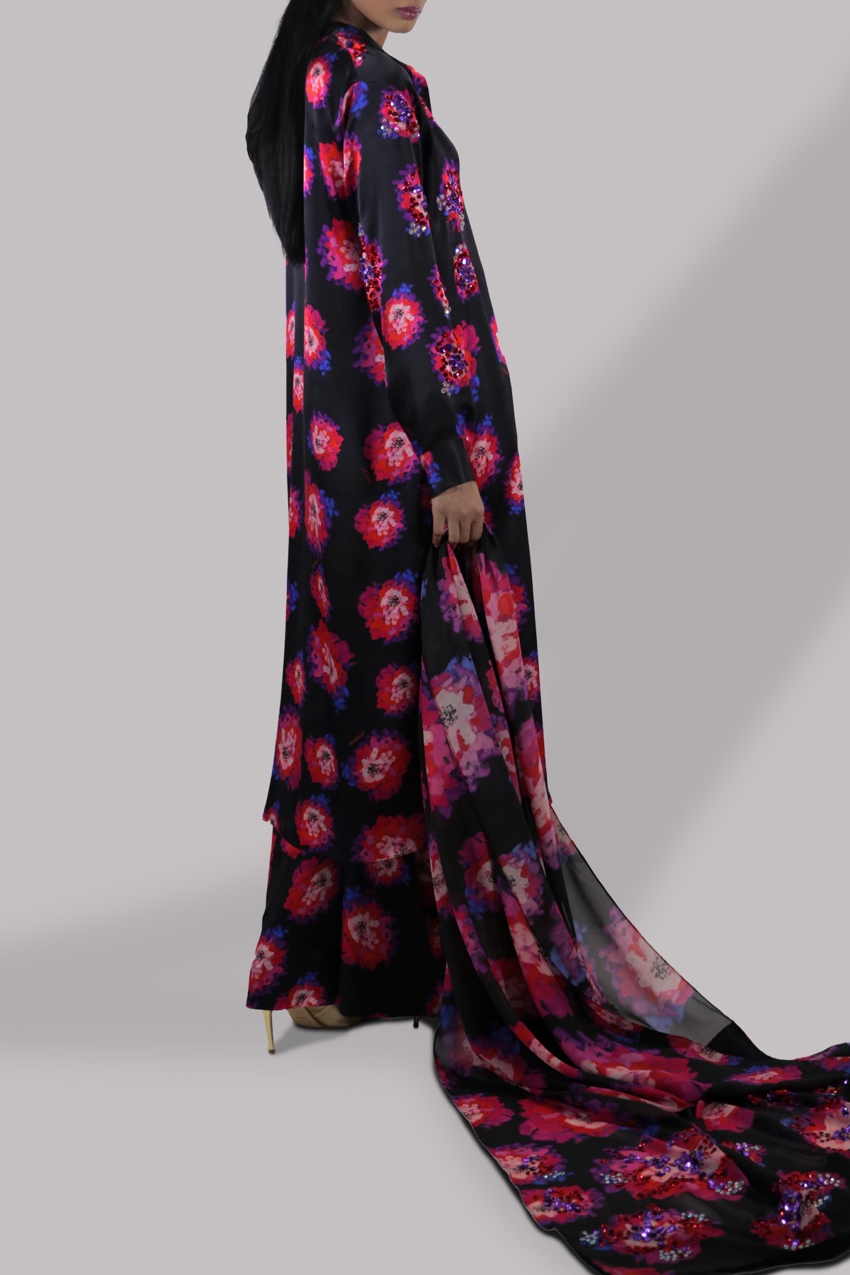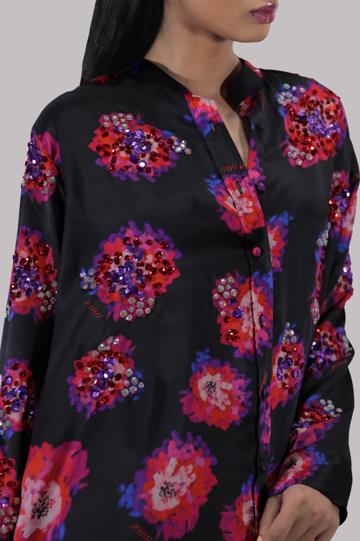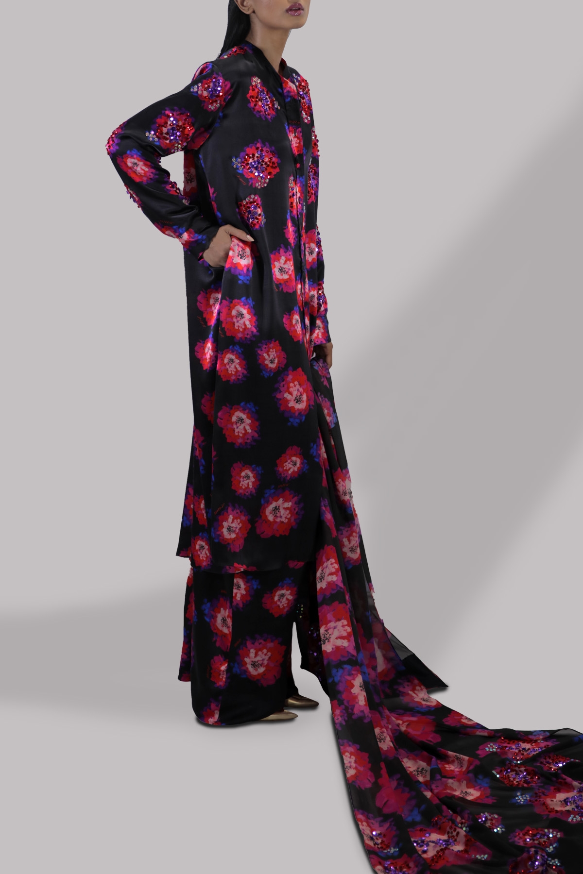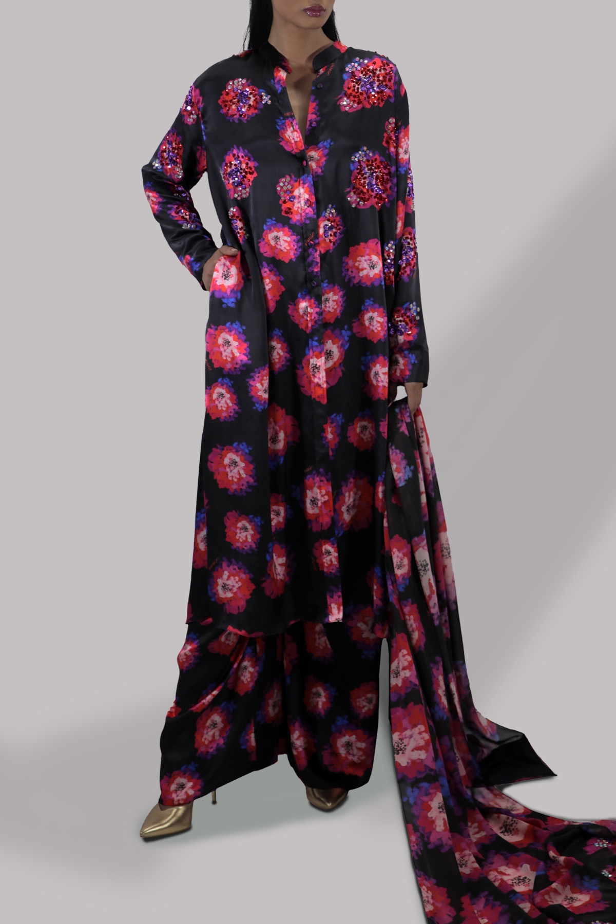 BLACK AND RED DIGITAL PRINT OVERSIZED SATIN SILK COLLARED AND BUTTONED SHIRT, ADORNED WITH GOLD FRENCH BUTTONS AND EXQUISITELY EMBELLISHED WITH FRENCH AND ITALIAN SEQUINS. MATCHING SATIN SILK WIDE LEGGED PANTS AND GEORGETTE DUPATTA, HAND EMBELLISHED WITH MULTI-COLOURED SEQUINS. THIS LOOSE BREEZY SET WITH RICH COLOR PALETTE IS FLAWLESS FOR BALMY DAYS AND PERFECT FOR EVENING OCCASIONS.