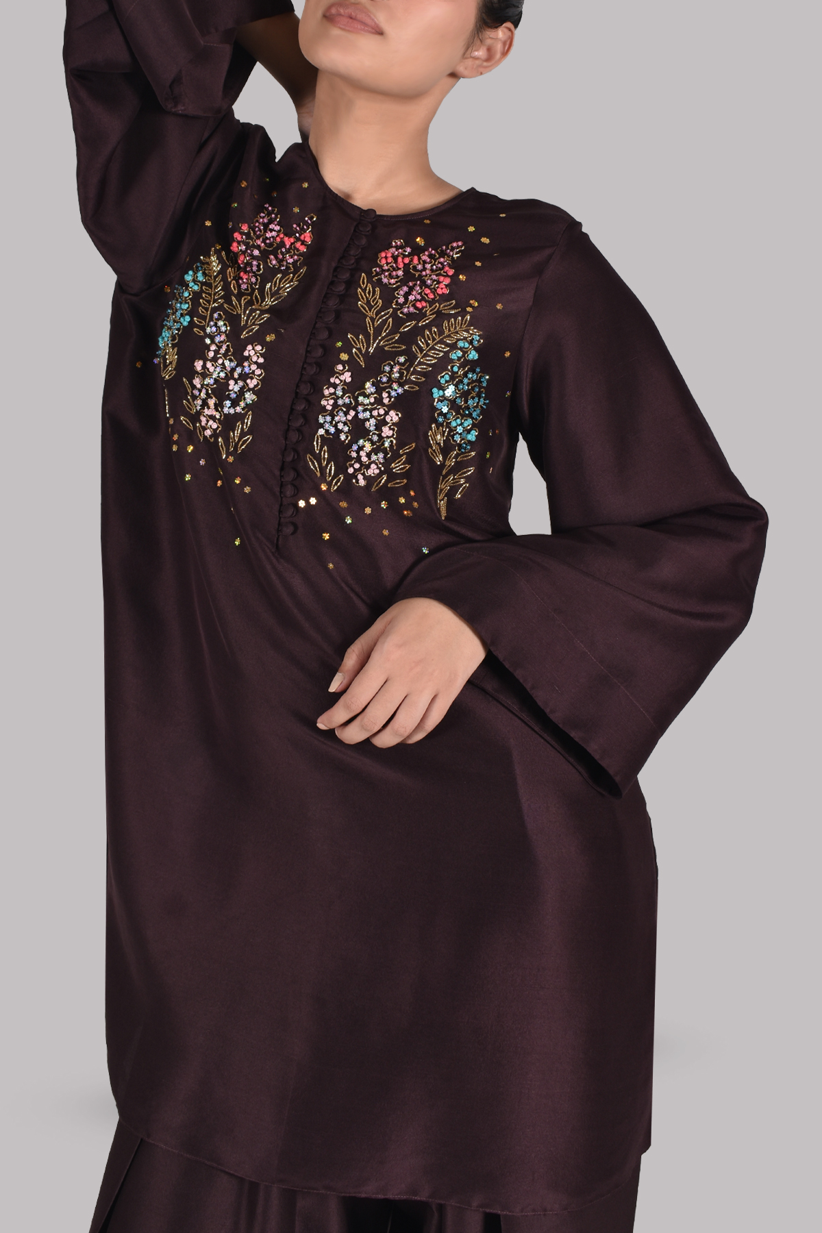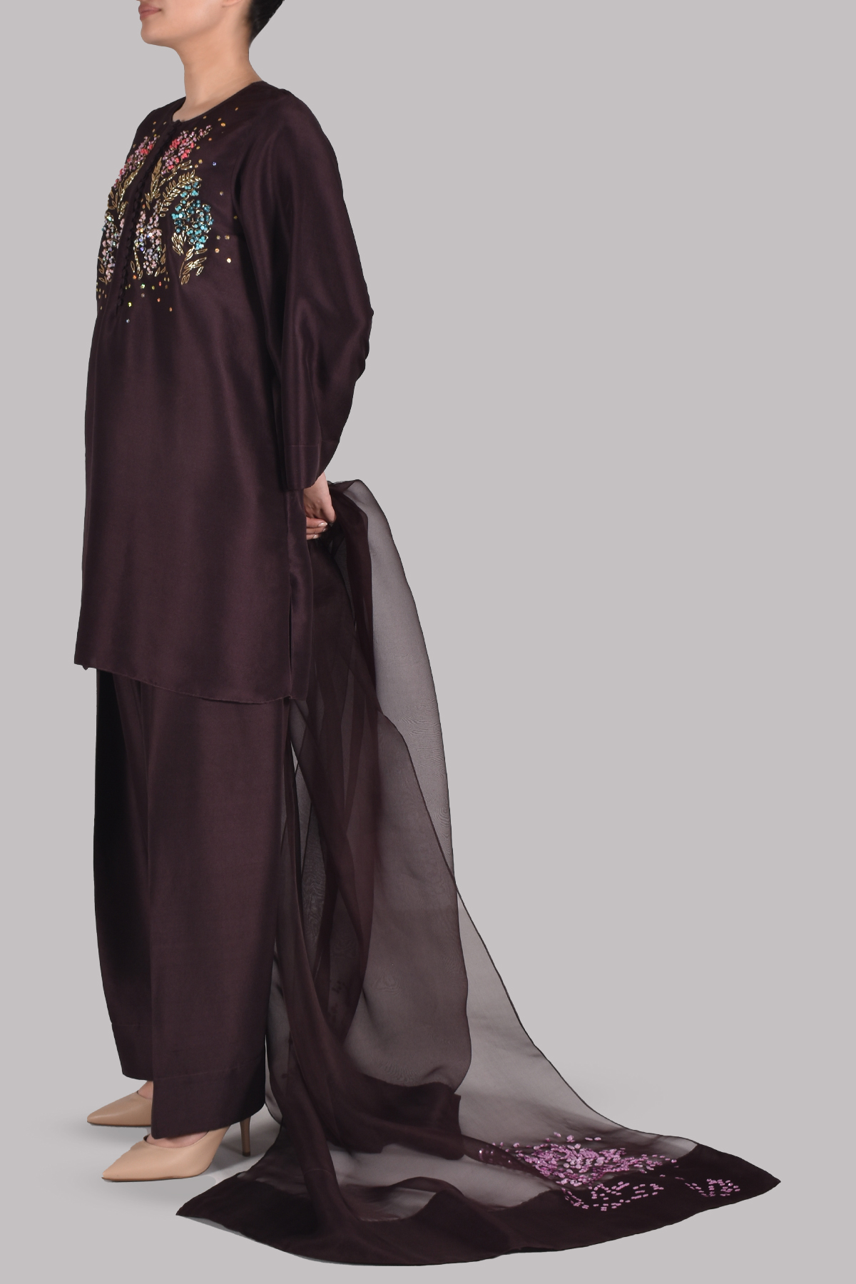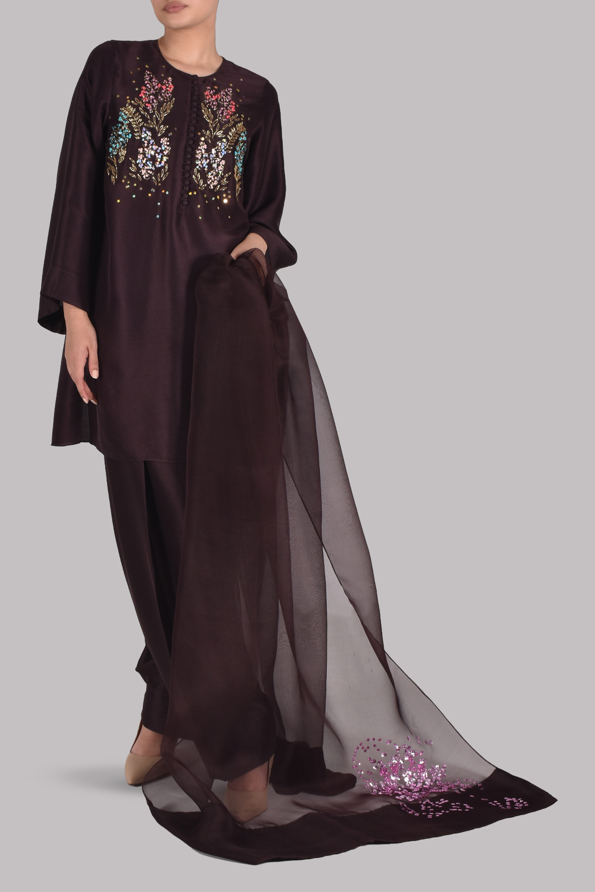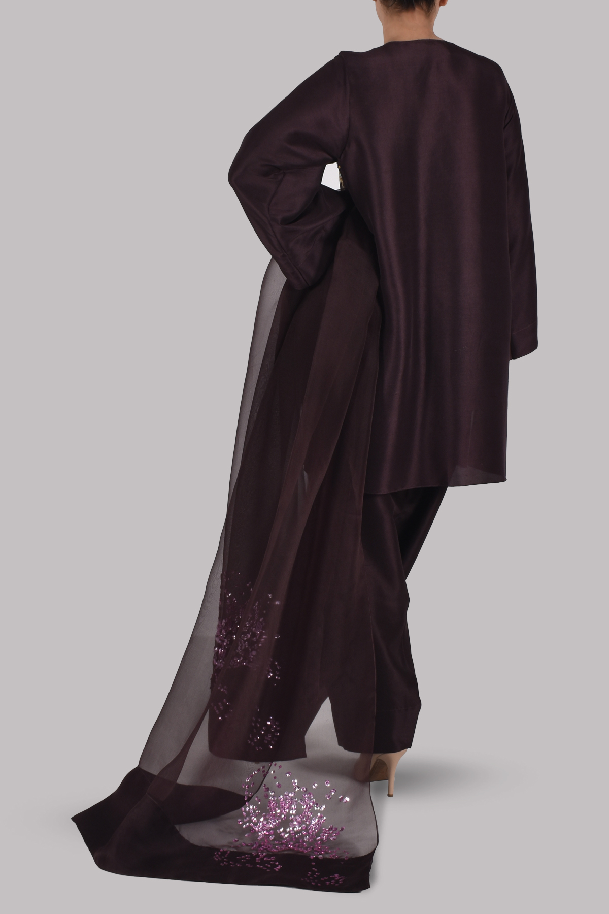 Rich and refined, this ensemble features a black coffee-hued raw silk tunic adorned with delicate sequin detailing along the neckline. Paired with a matching shalwar and a beautifully embellished organza dupatta, this set offers effortless sophistication with a subtle touch of shimmer.