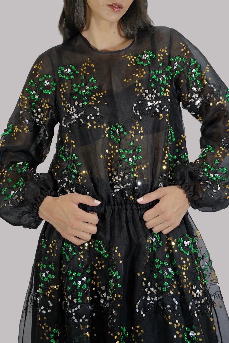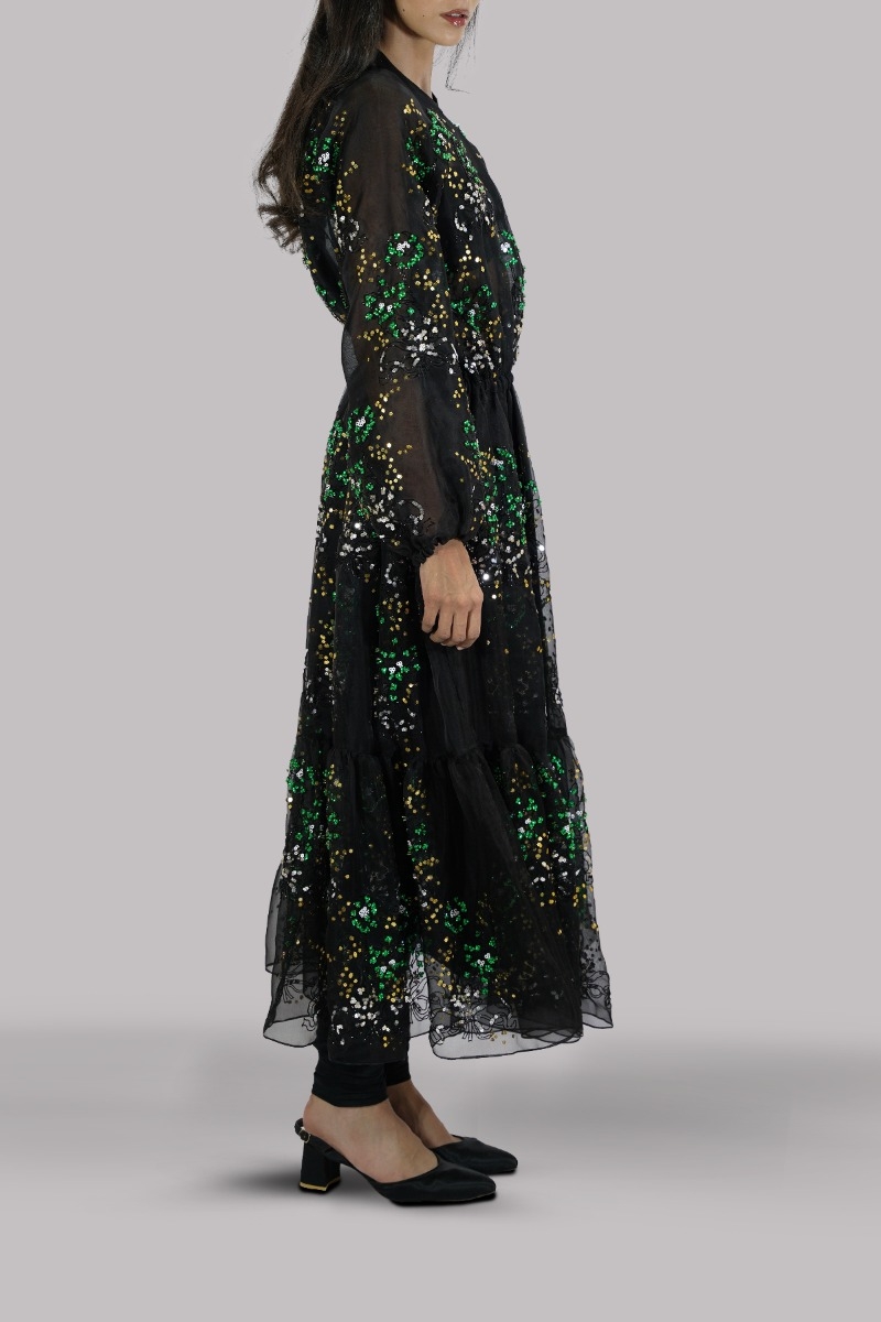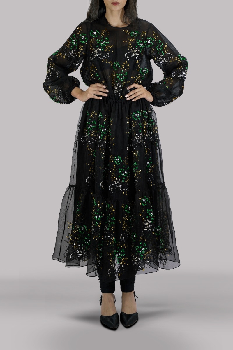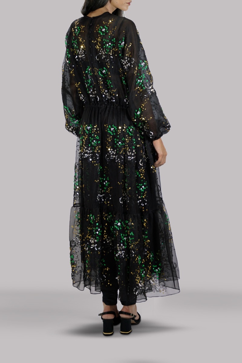 Black, Oversized and flowing close neck ruffled organza dress, intricate hand embellished dress with multi-colored glittering French and Italian sequins with black raw silk churidaar.