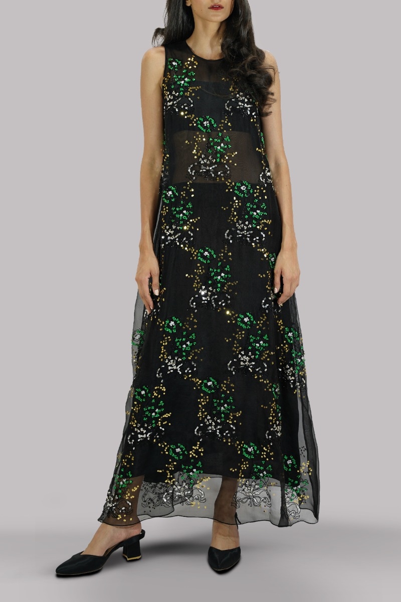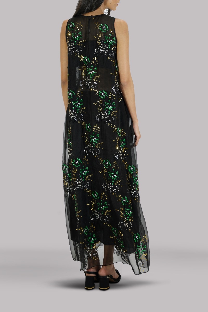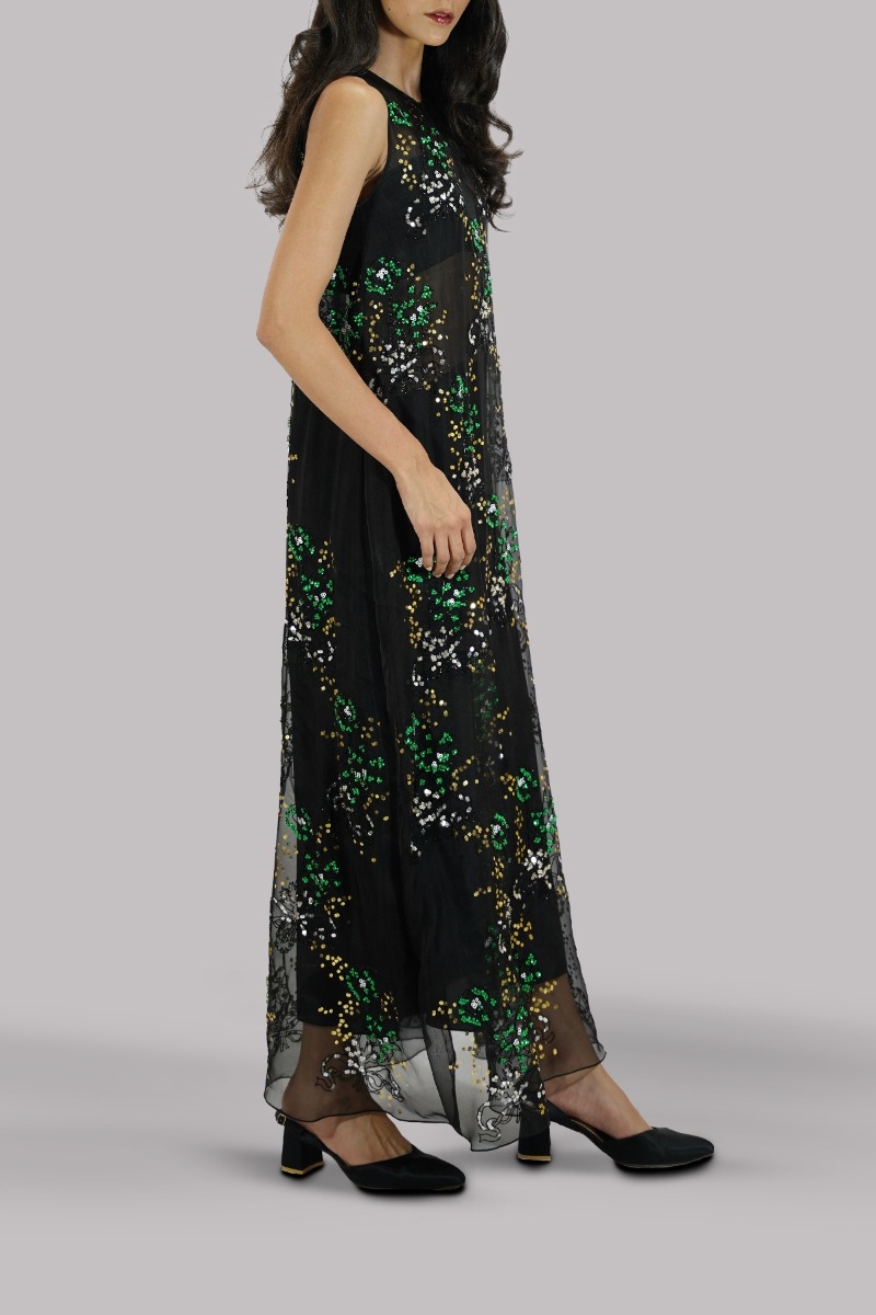 Black, Oversized and flowing close neck straight organza maxi dress, intricate hand embellished maxi with multi-coloured glittering French and Italian sequins.