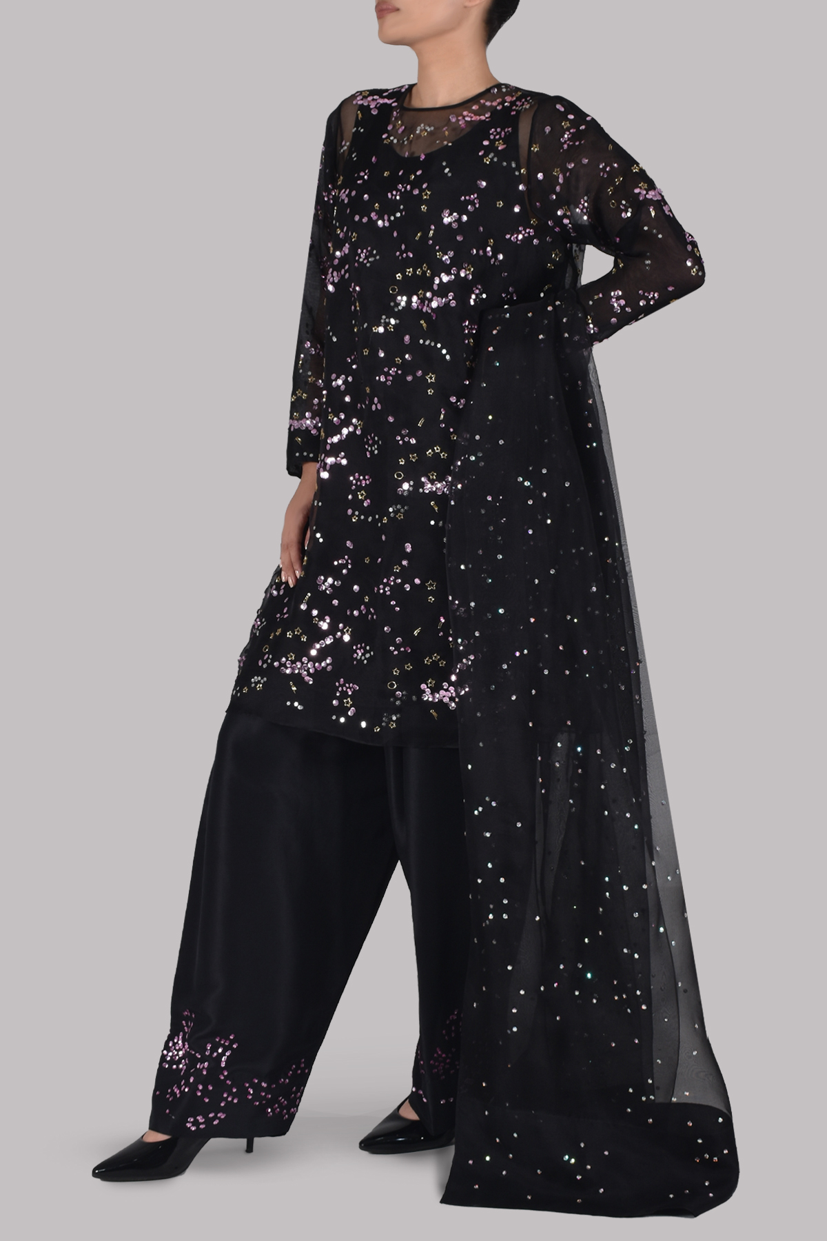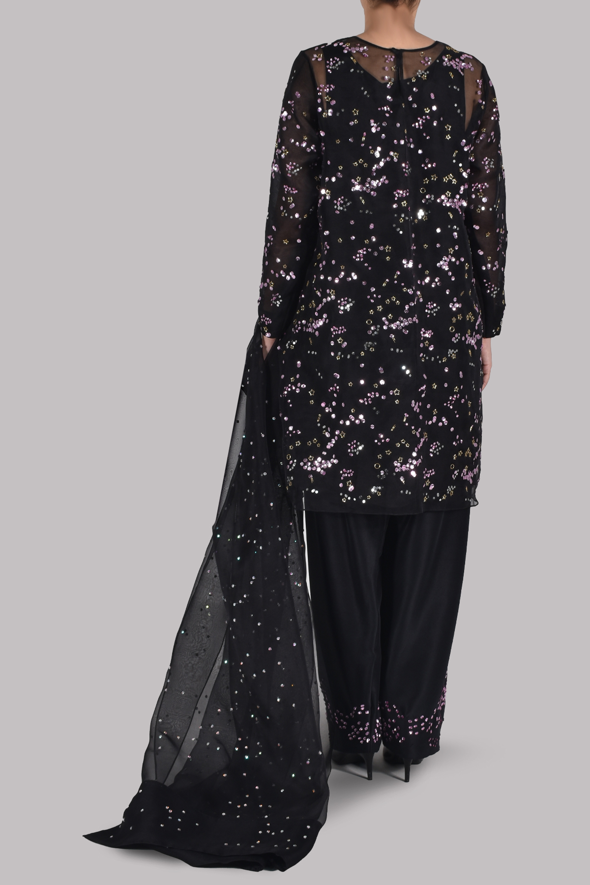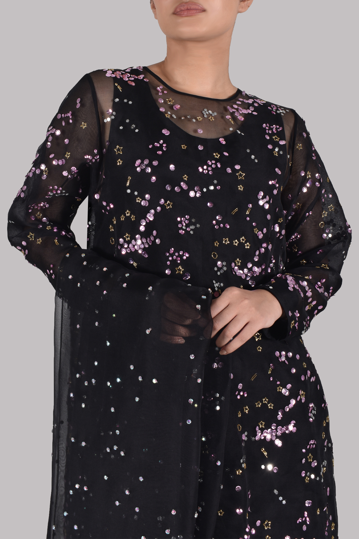 Elegant black organza tunic adorned with shimmering sequins, paired with an embellished shalwar. The look is completed with a delicate organza dupatta featuring sparkling stone detailing.