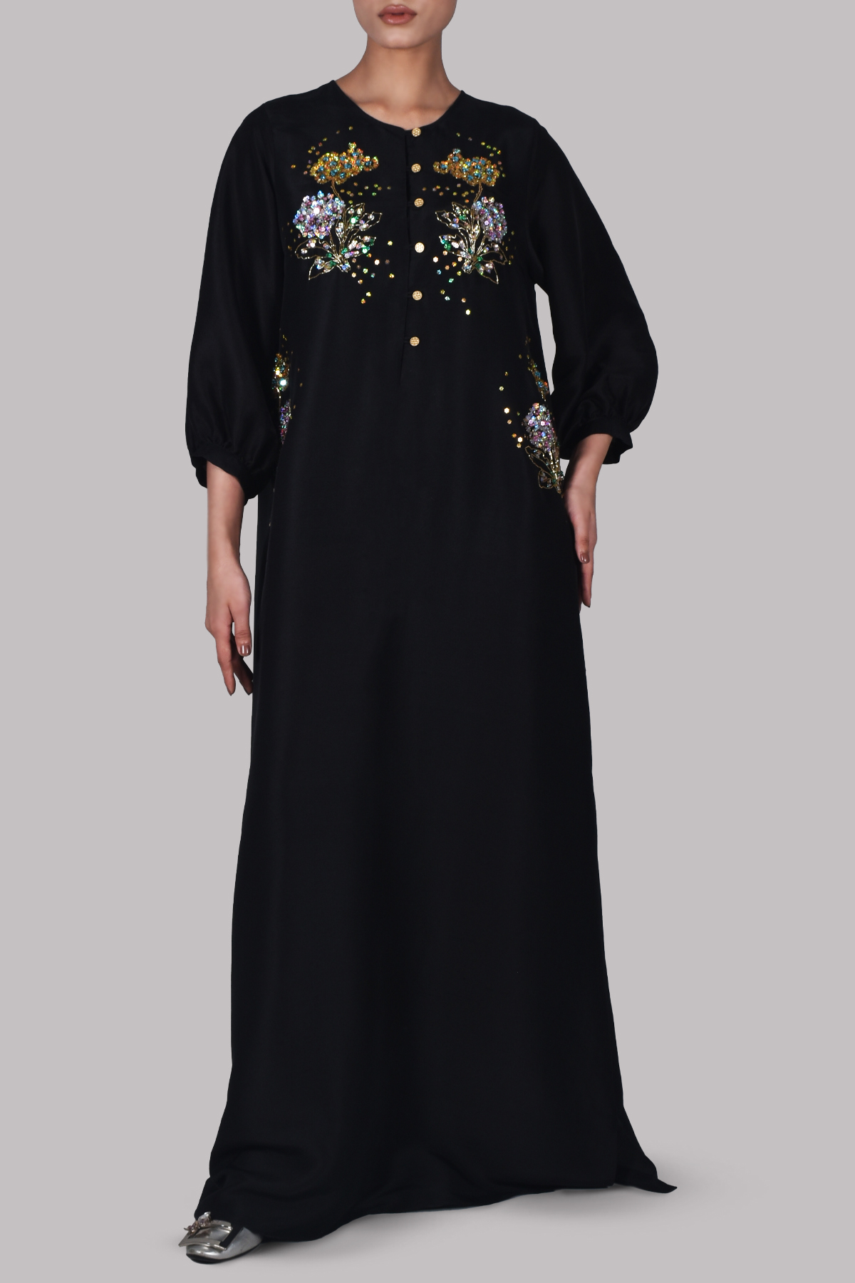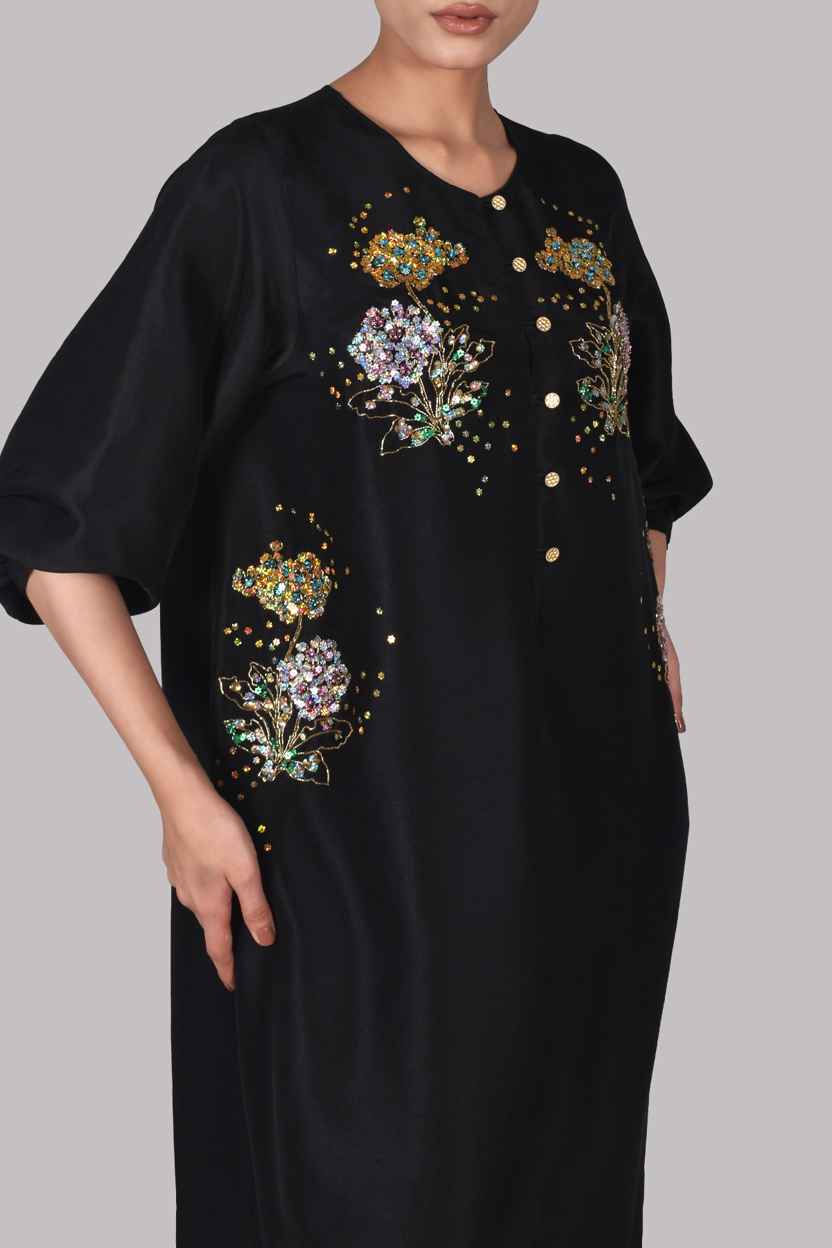 Crafted from luxurious black raw silk, this maxi exudes timeless elegance with its fluid silhouette. The design is elevated with delicate sequin flower bunches, intricately hand-embellished to add dimension and a subtle sparkle with French buttons.