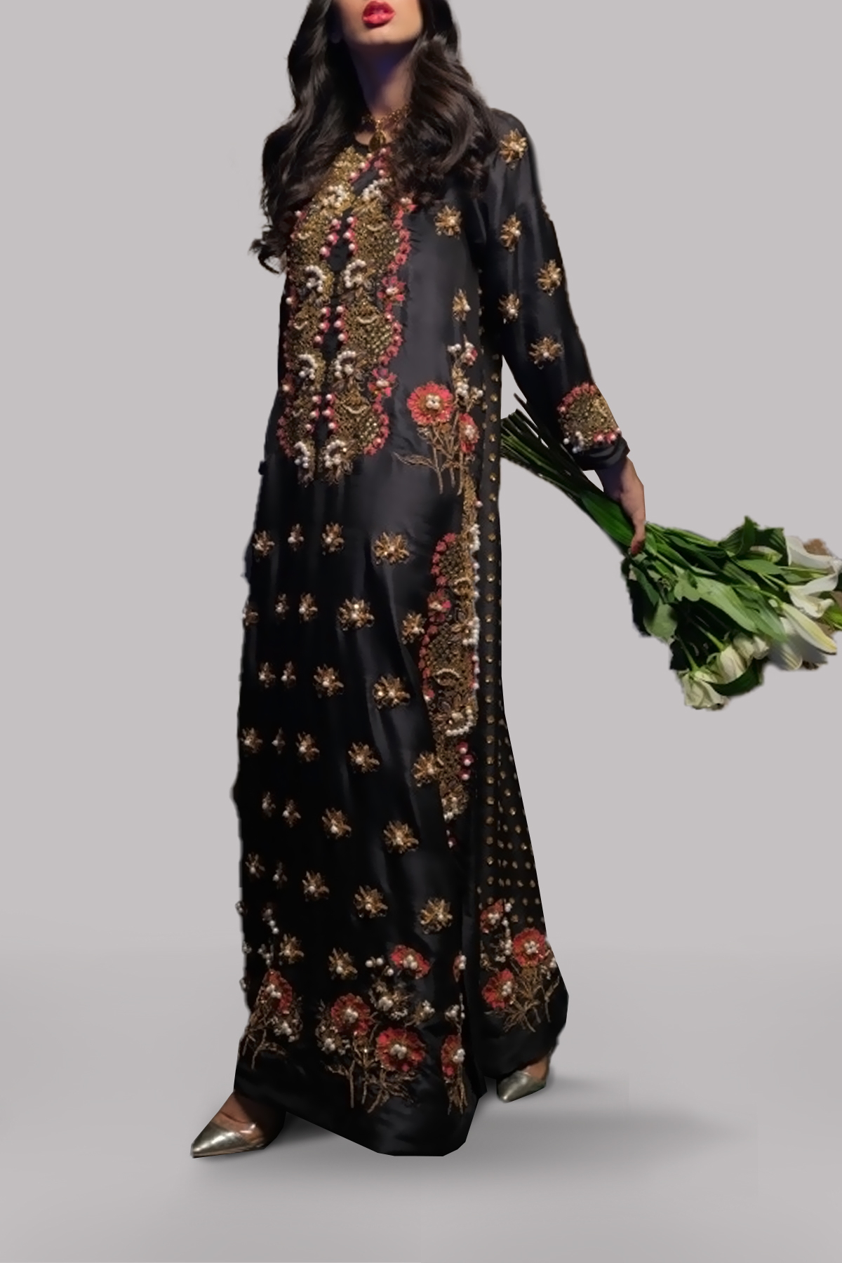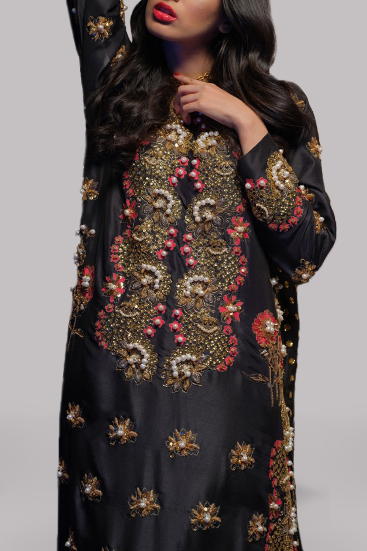 Elegance meets tradition in this black raw silk maxi, featuring a heavily embellished neckline and slits, accented with bold red floral motifs. The back is subtly adorned with light sequin work, adding just the right touch of shimmer. Perfect for festive occasions or formal events.