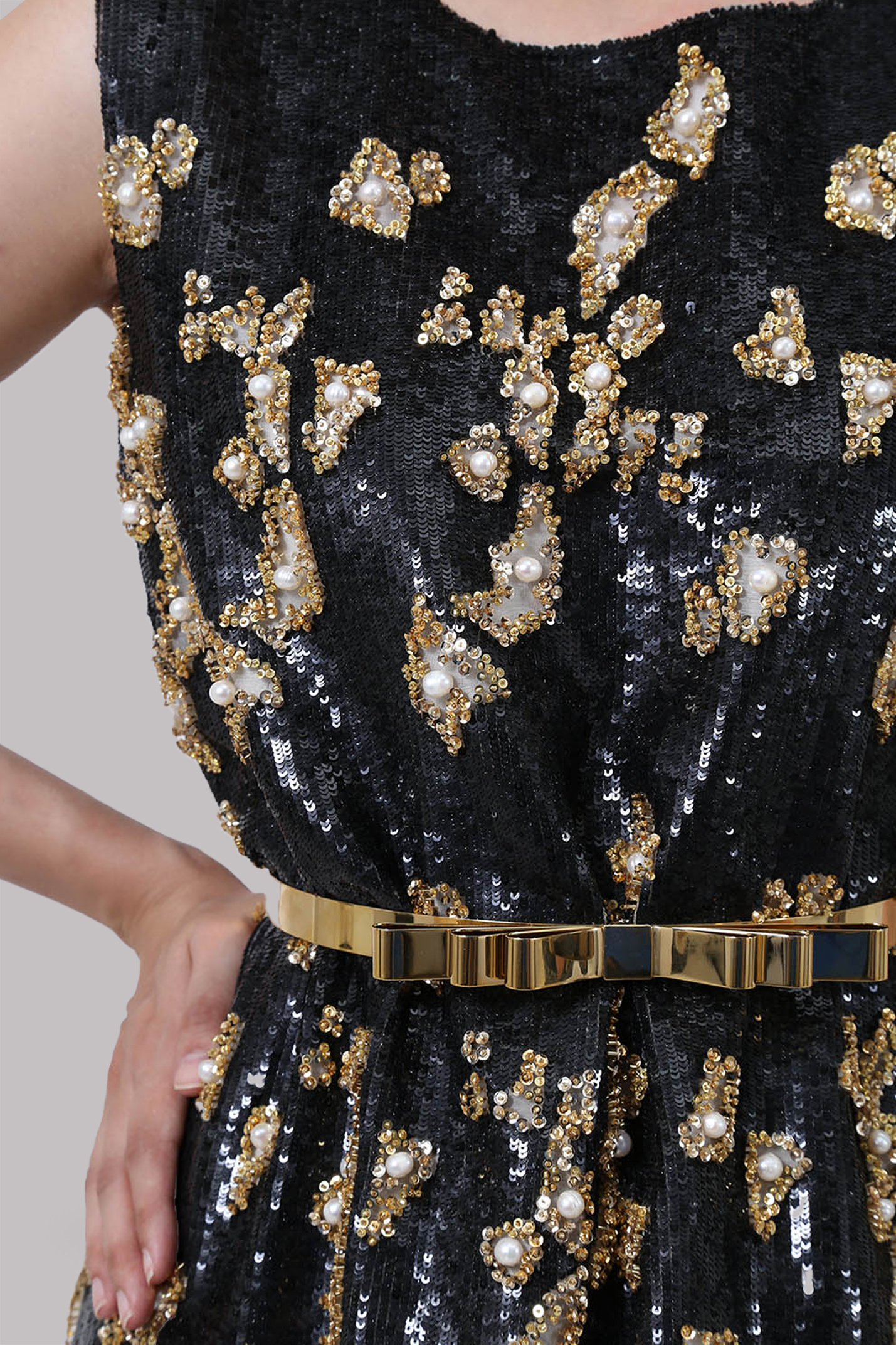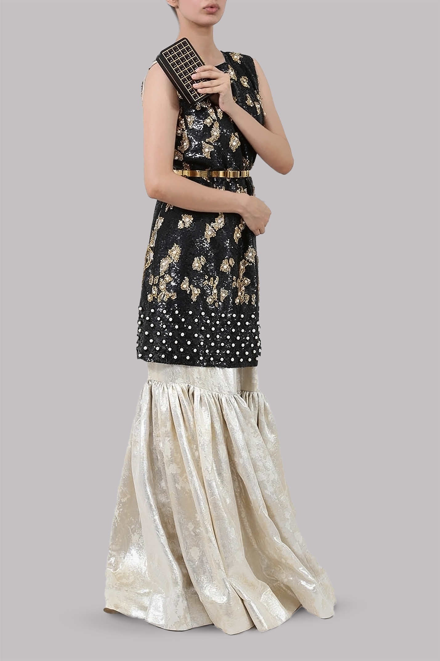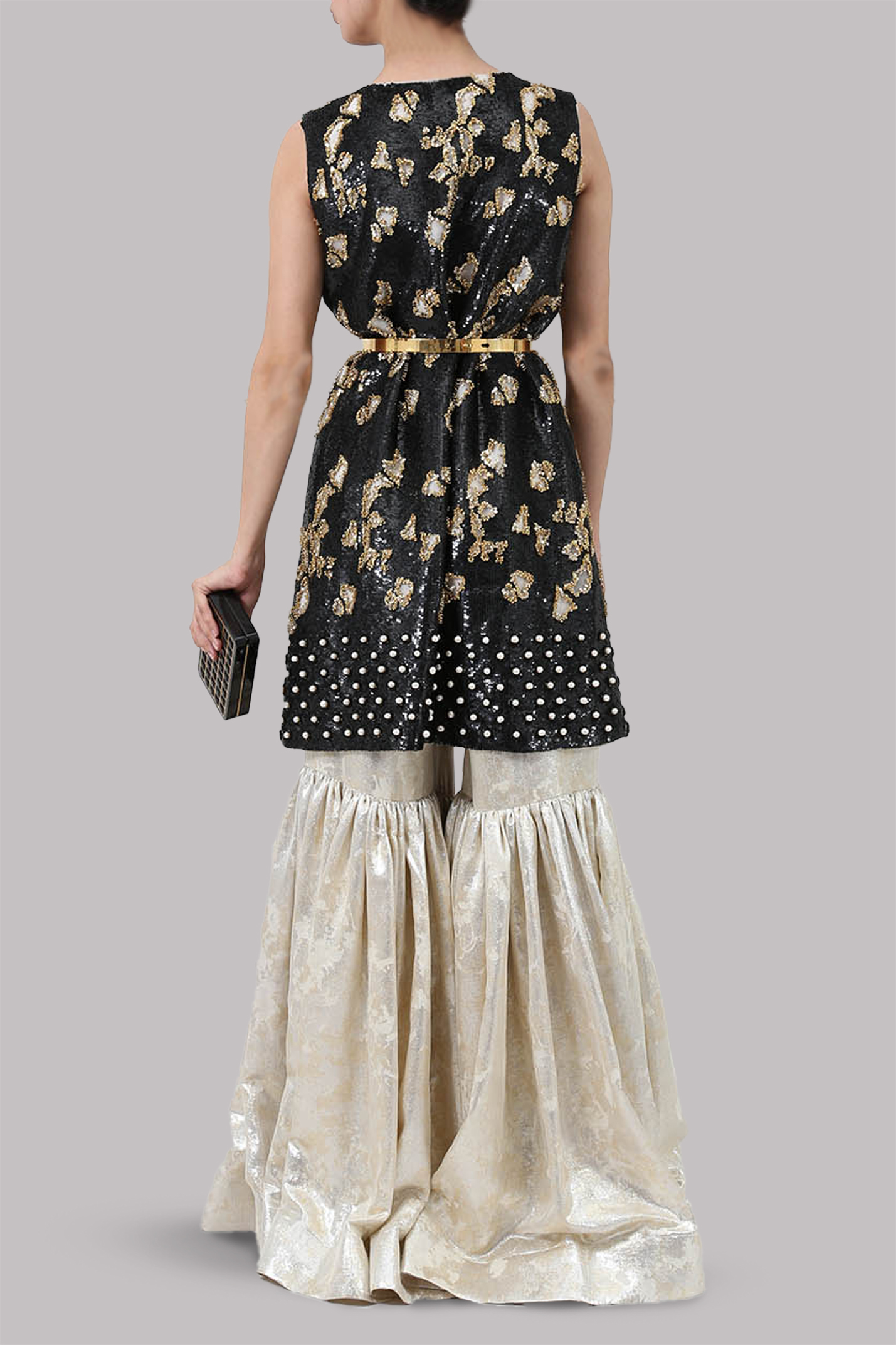 Make a statement in this fully embellished black tunic, adorned with intricate black and gold sequins and delicate pearls for a luxurious, radiant look. Paired with a rich brocade gharara, this ensemble blends traditional elegance with contemporary glamour.