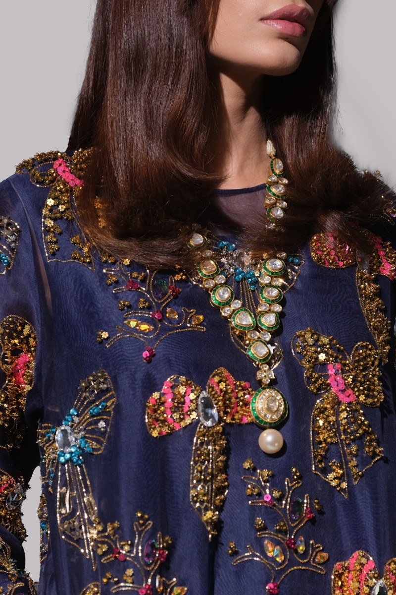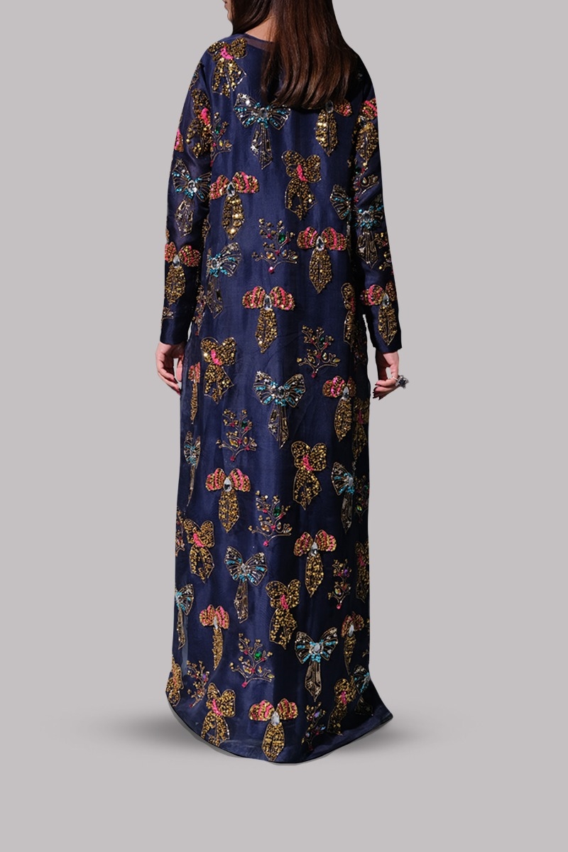 Black Iris organza maxi dress hand embellished with sparkling crystals and gold, neon, and multi-coloured sequins.