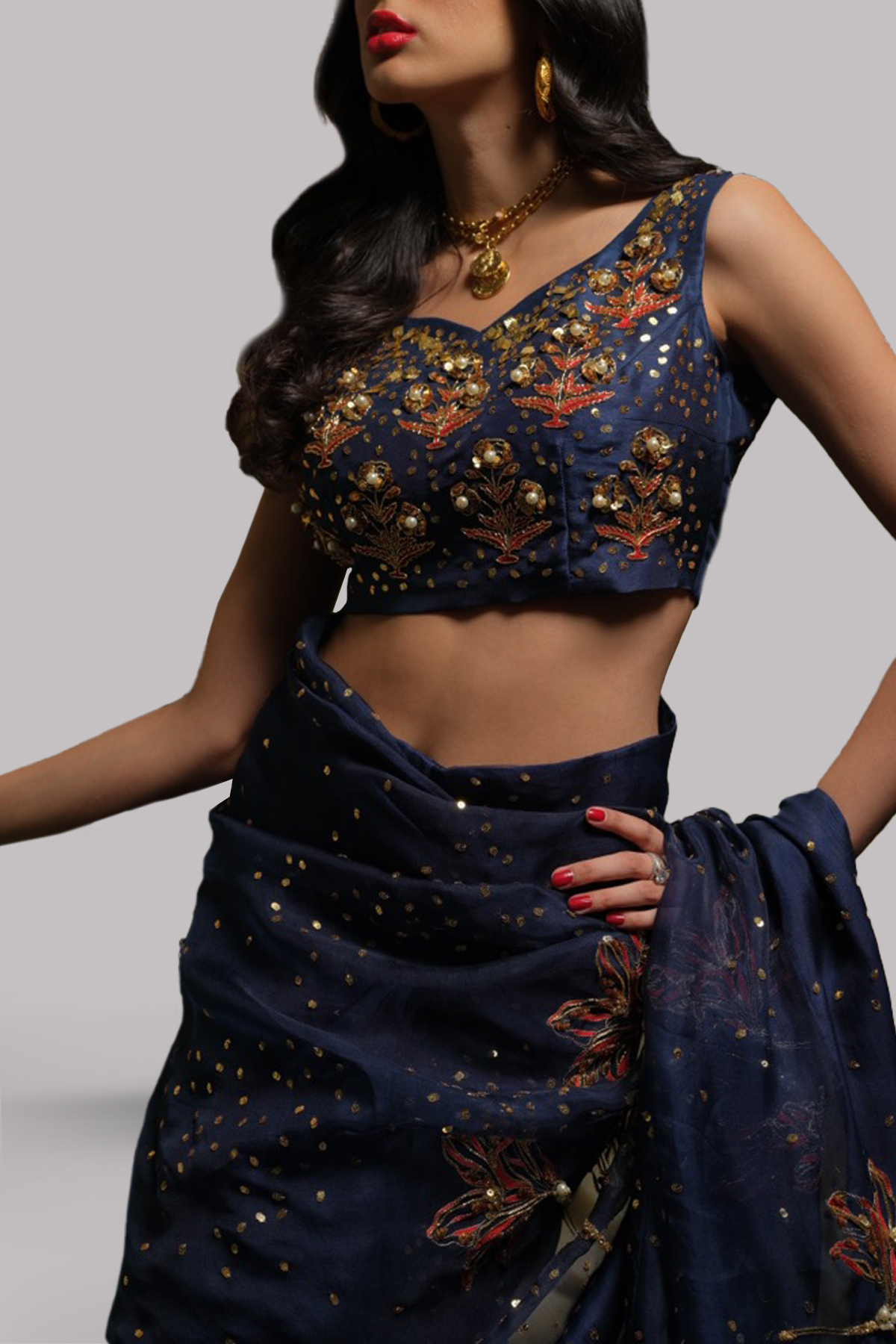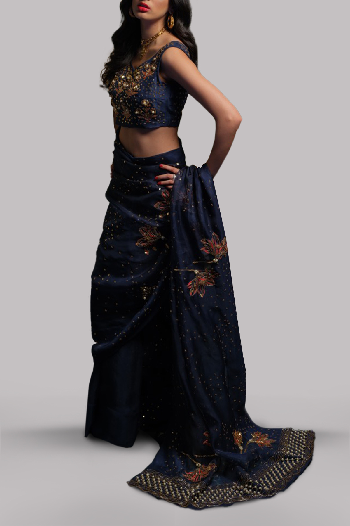 This Black Iris embellished sari is crafted from lightweight fabric for an elegant drape. Paired with a richly adorned raw silk blouse, featuring intricate embroidery, sequin and pearls.