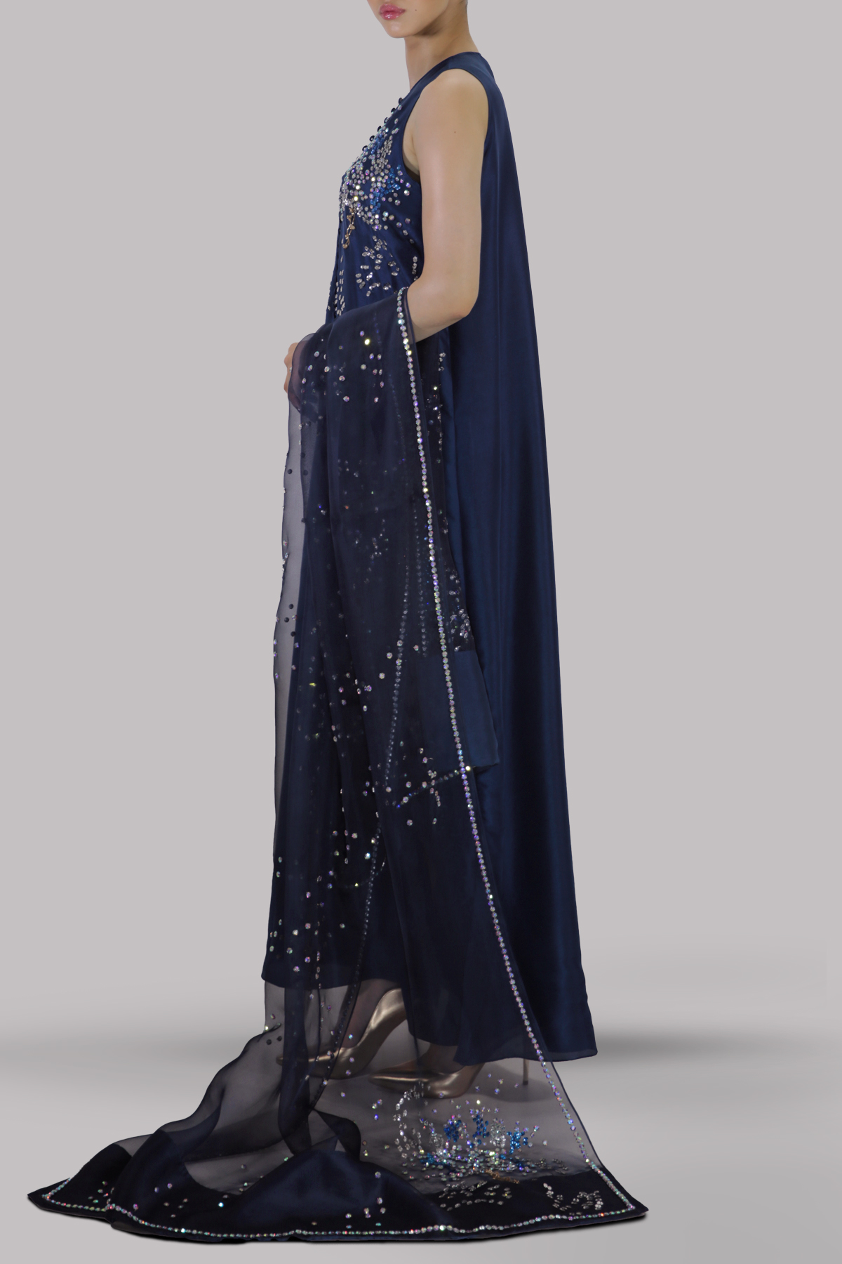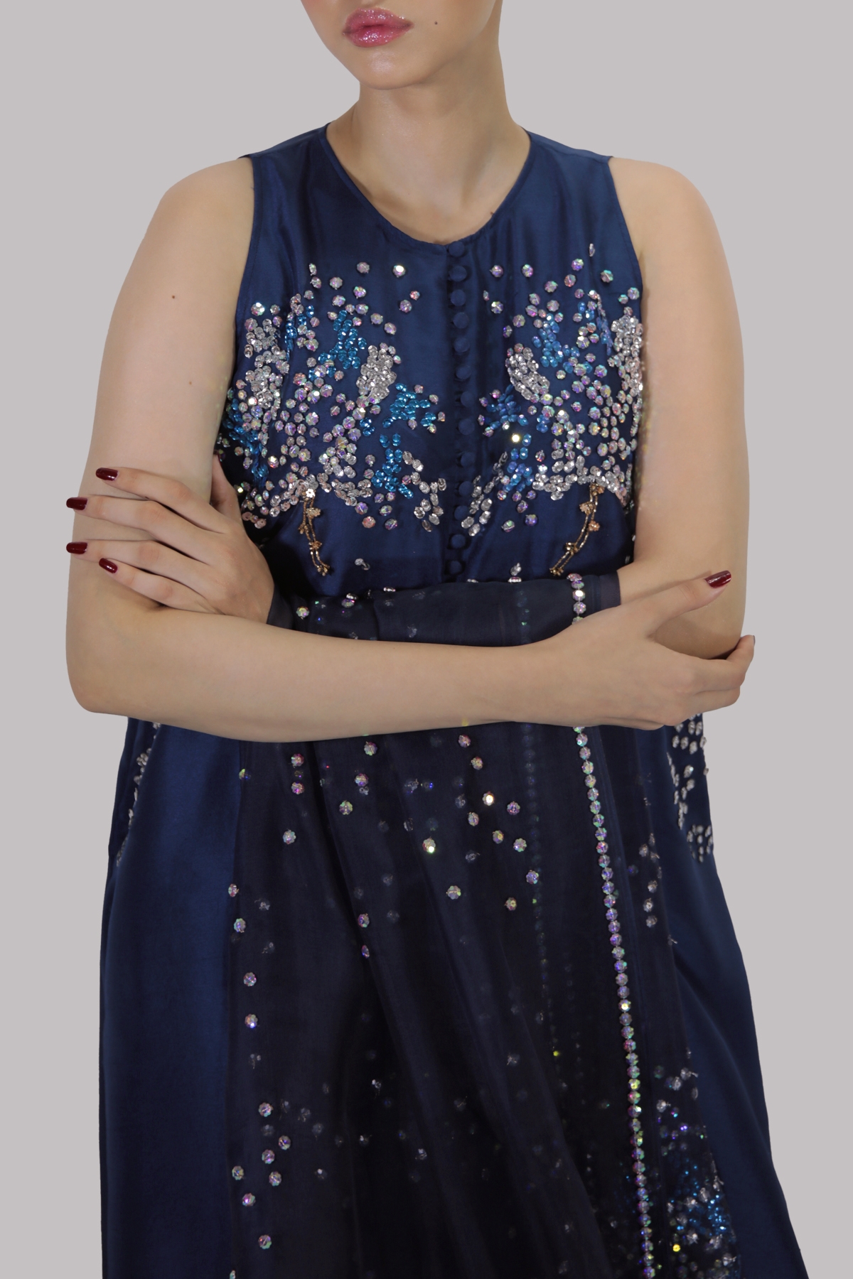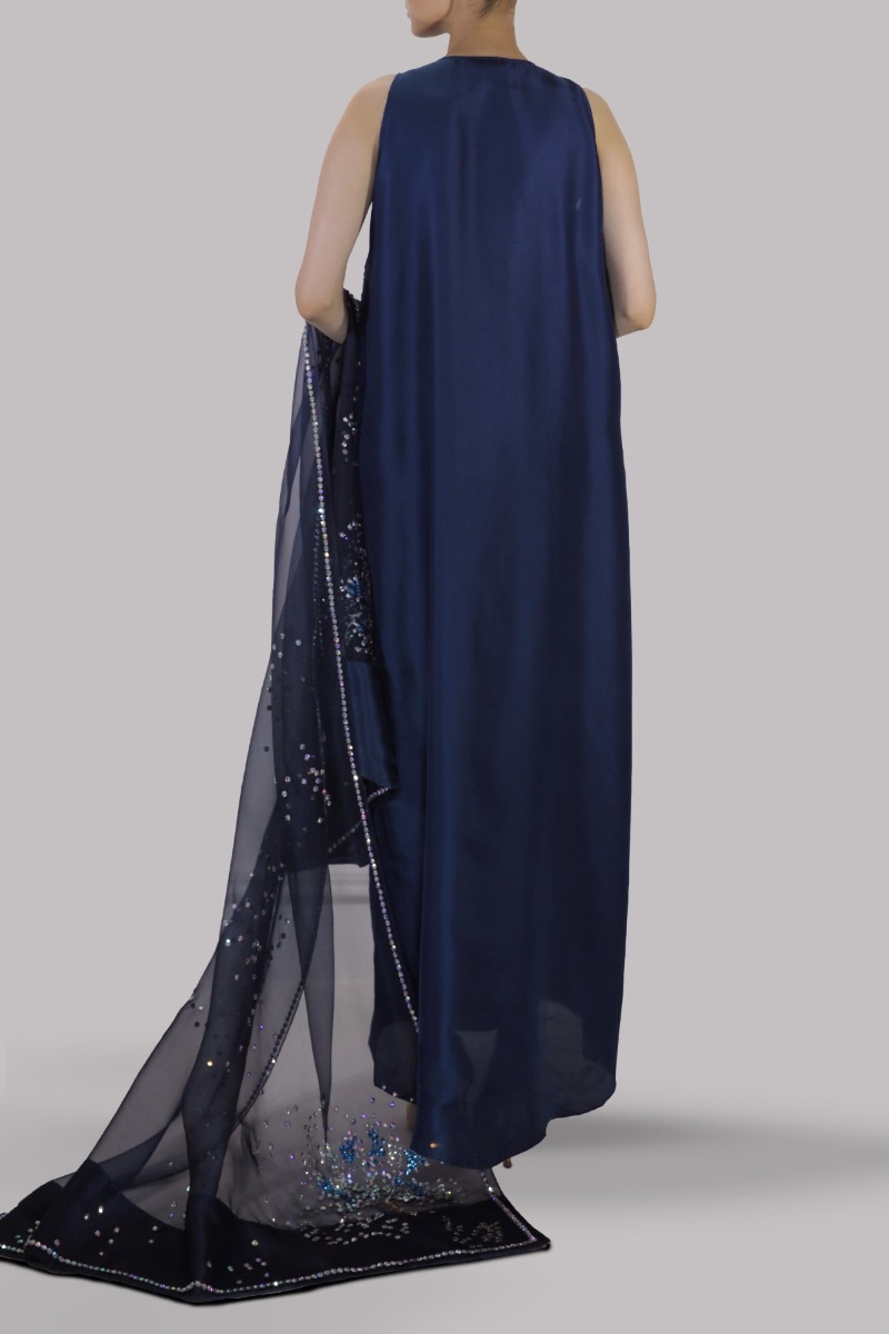 Black Iris, Straight raw silk maxi dress, hand embellished with gold coloured French and Italian sequins. It’s designed in a slim silhouette with bold side slit. Matching organza embellished dupatta.