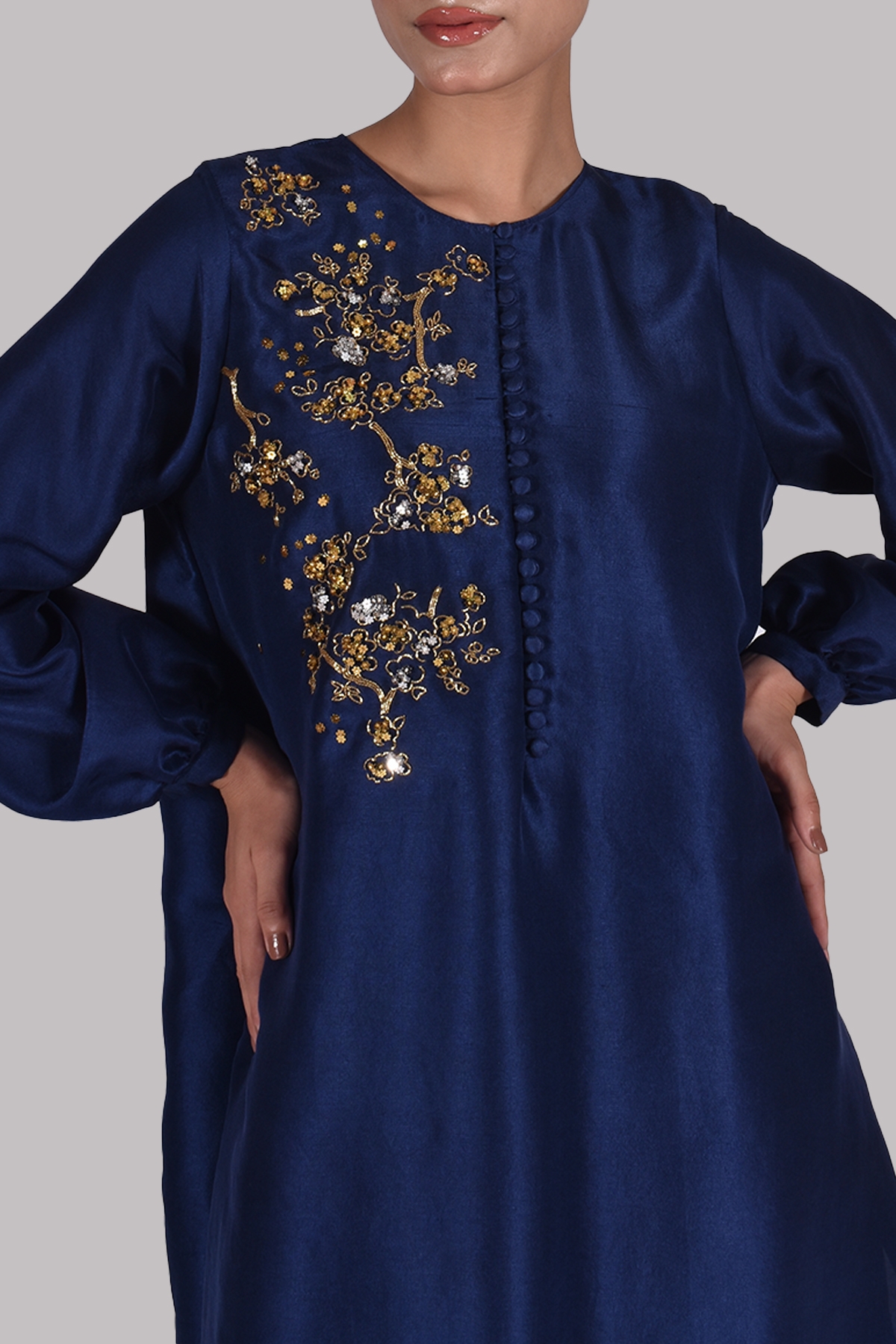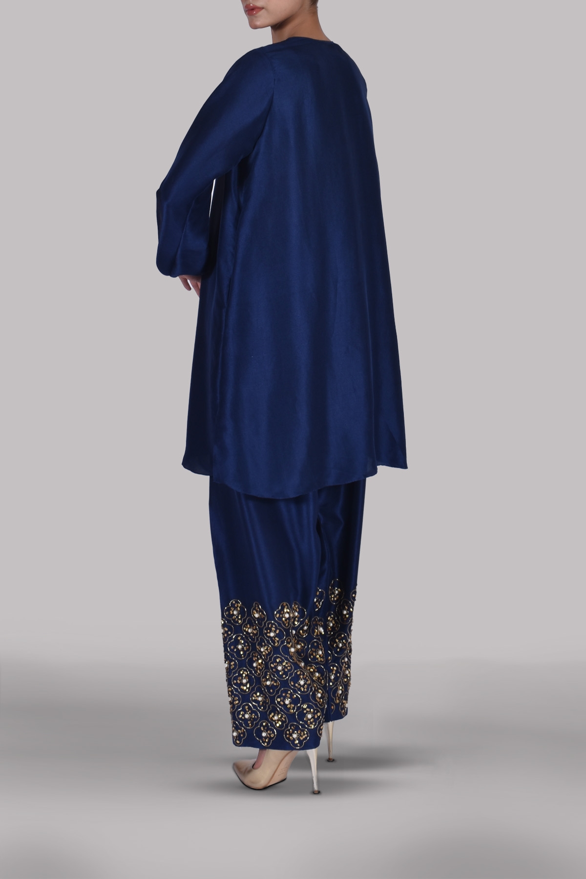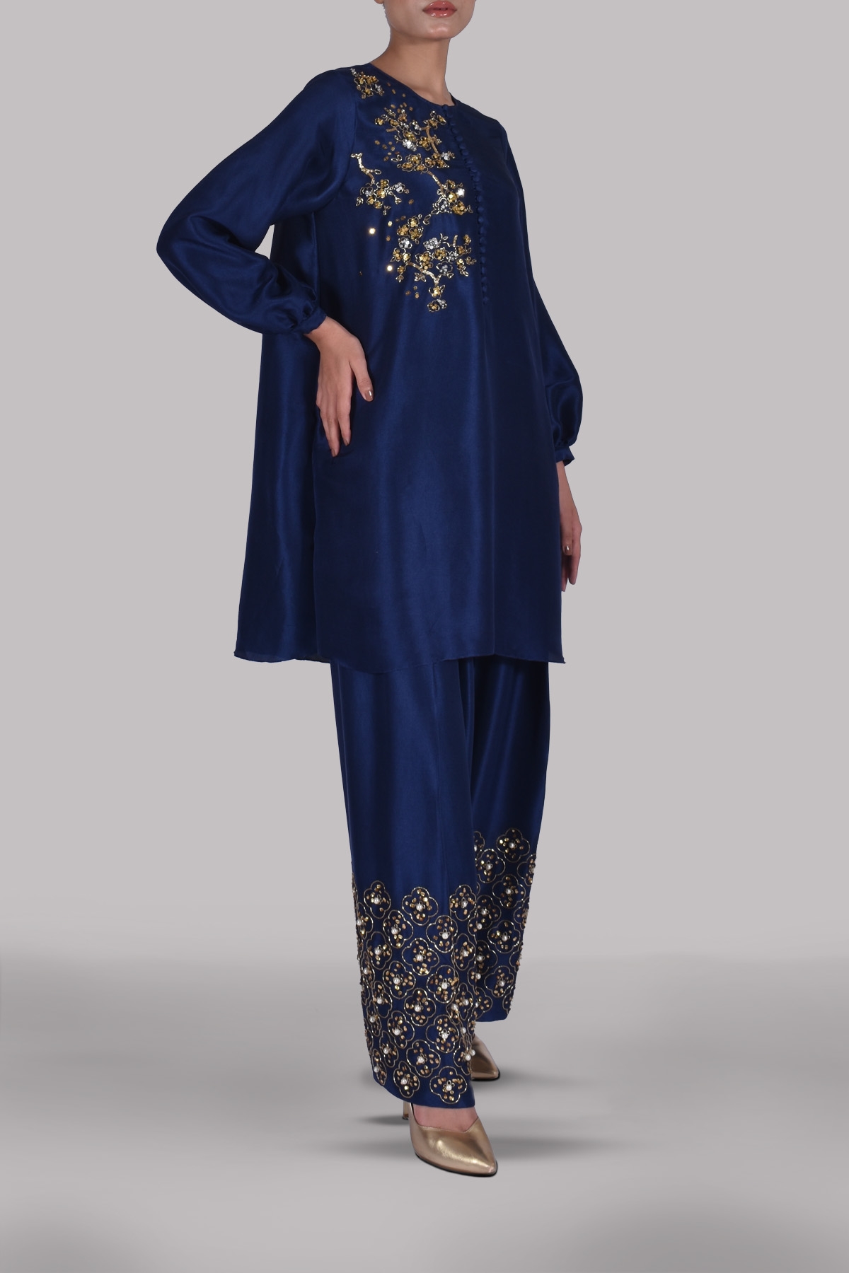 Black Iris close neck raw silk shirt adorned with front button opening with perfect cut and extravagant details. It’s impeccably tailored with matching embellished raw silk shalwar pants with glittering sequins.