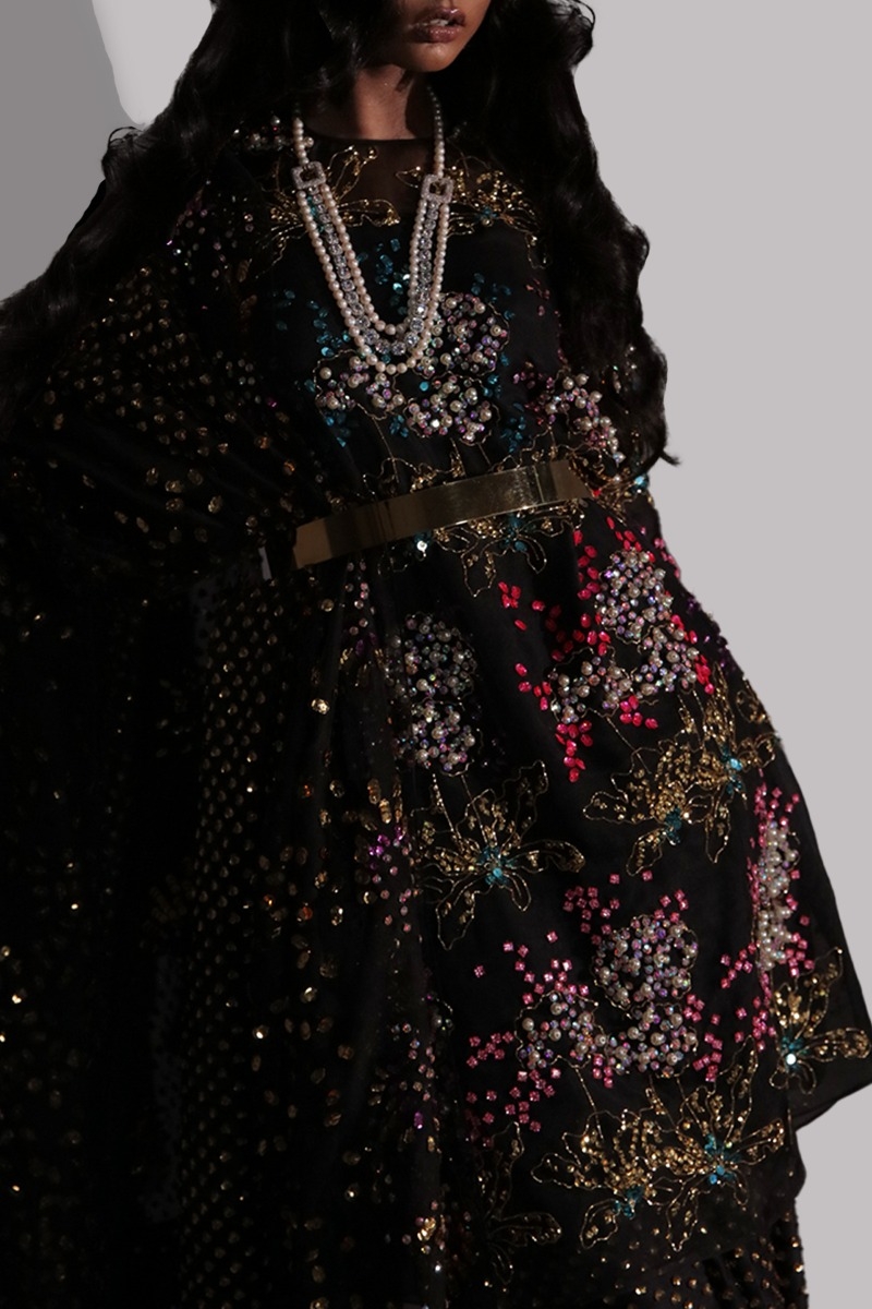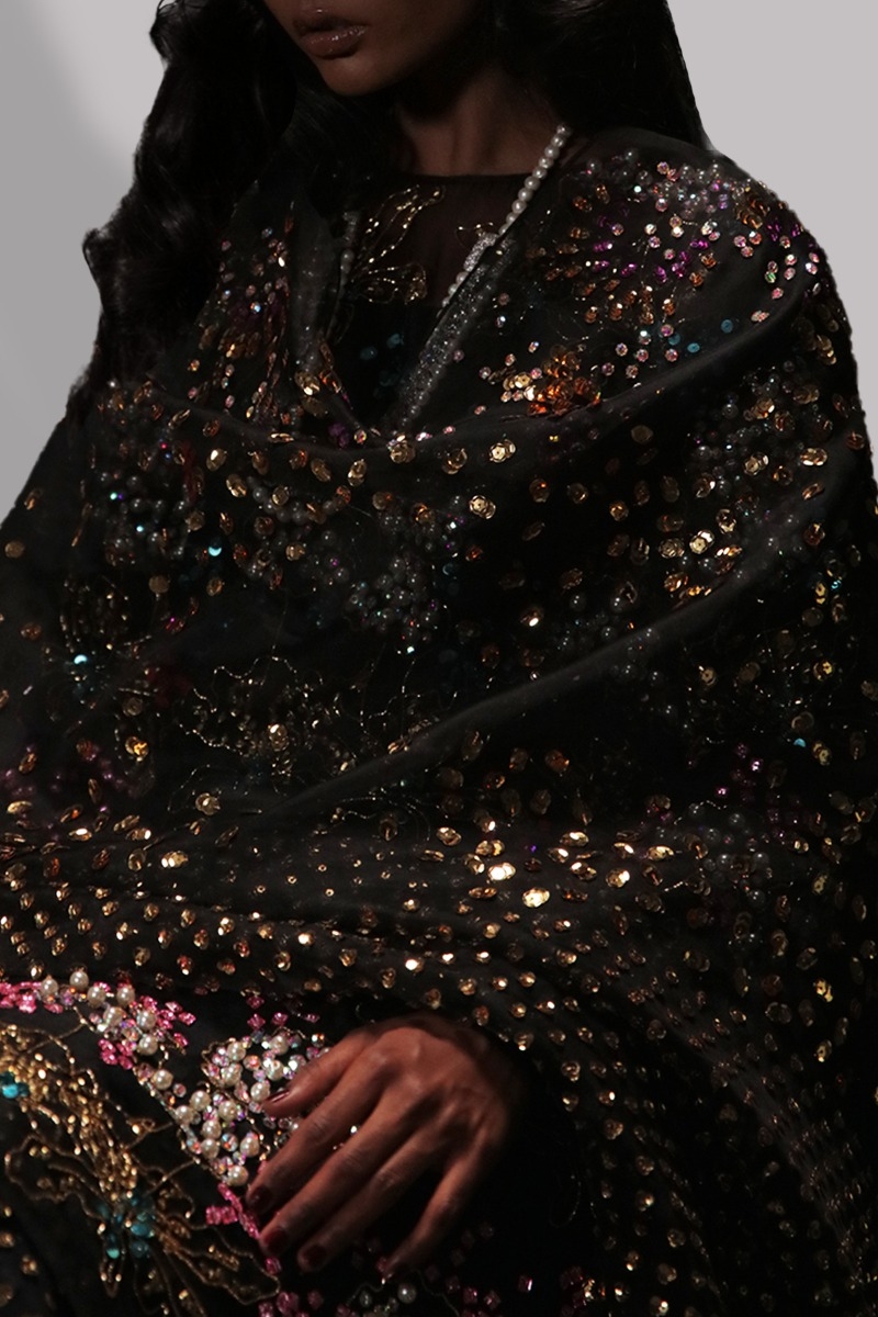 Black, oversized organza straight shirt, heavily hand embellished with multi-coloured French and Italian sequins. Matching embellished raw silk shalwar pants and embellished organza dupatta.