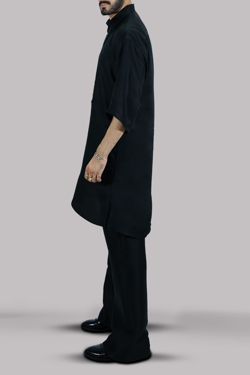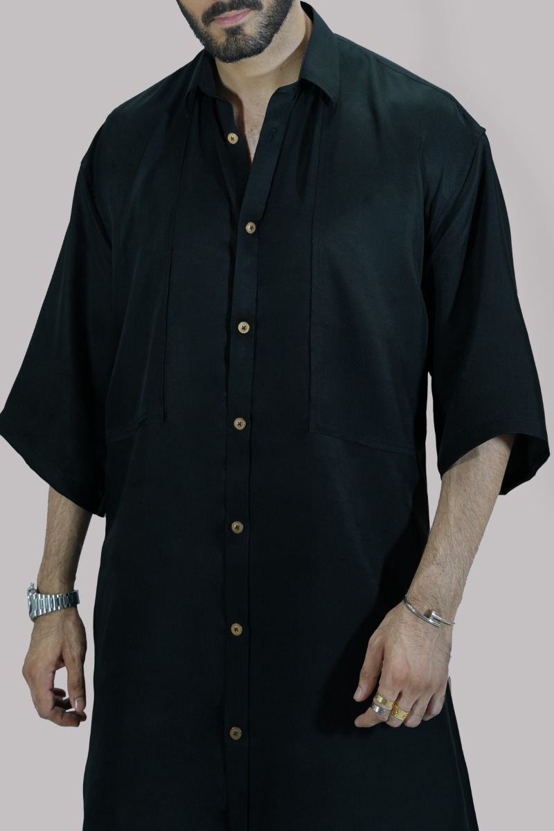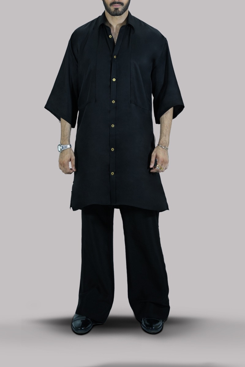 Oversized raw silk shirt adorned with gold french buttons appealingly shiny and smooth, elevated with perfect cut and extravagant details. Paired with impeccably tailored trousers made from silk feels so luxurious.