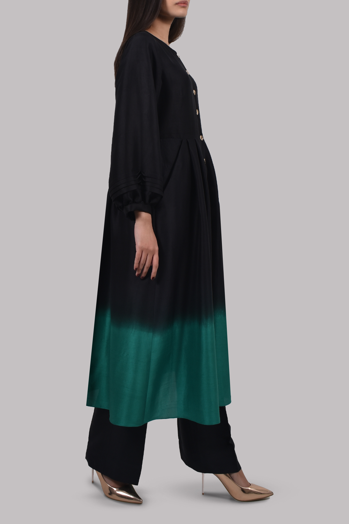 Black and ultramarine green Ombre panelled raw silk tunic. Matching full length bootcut trousers.