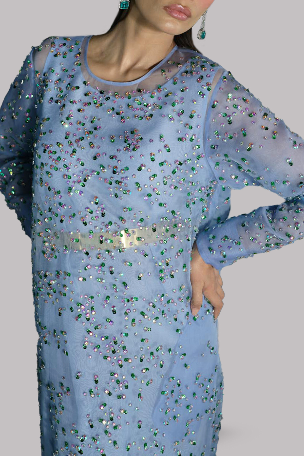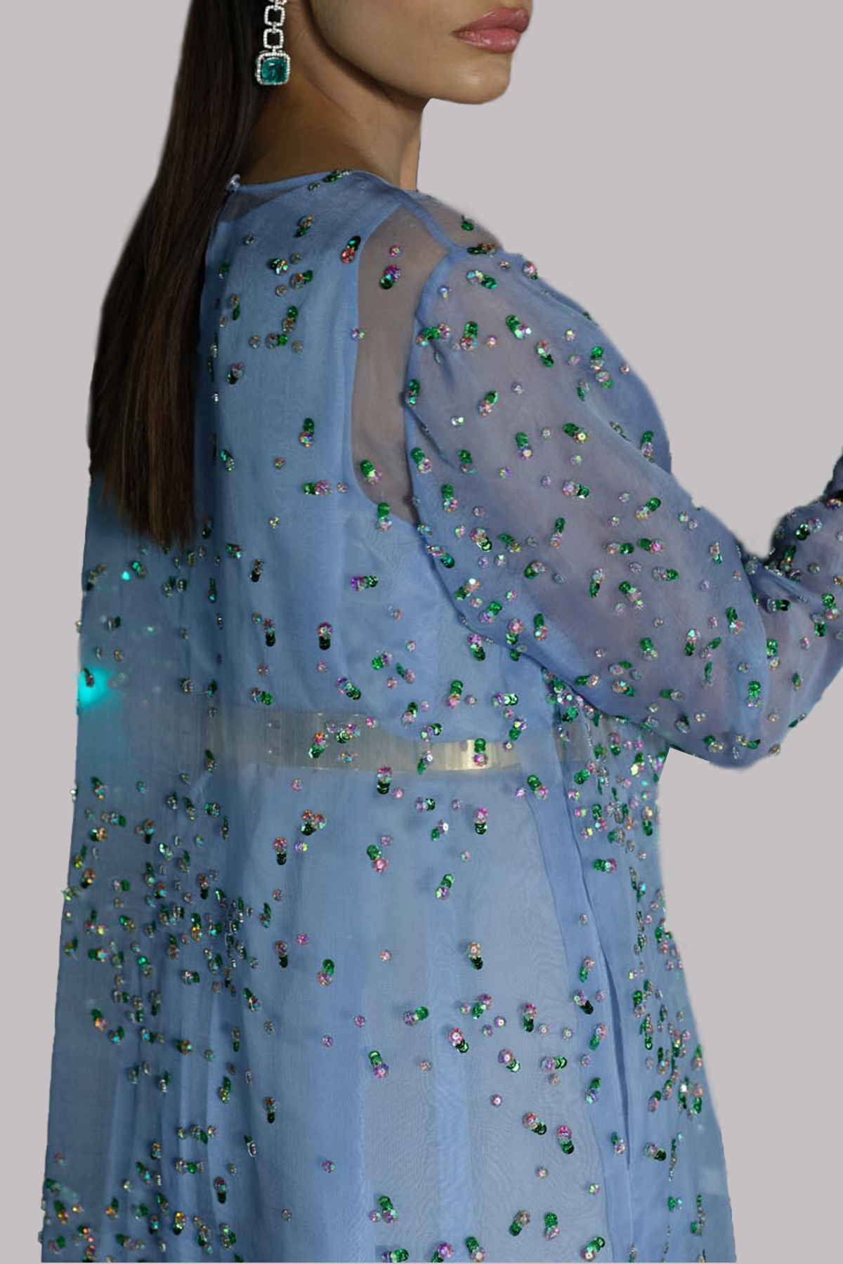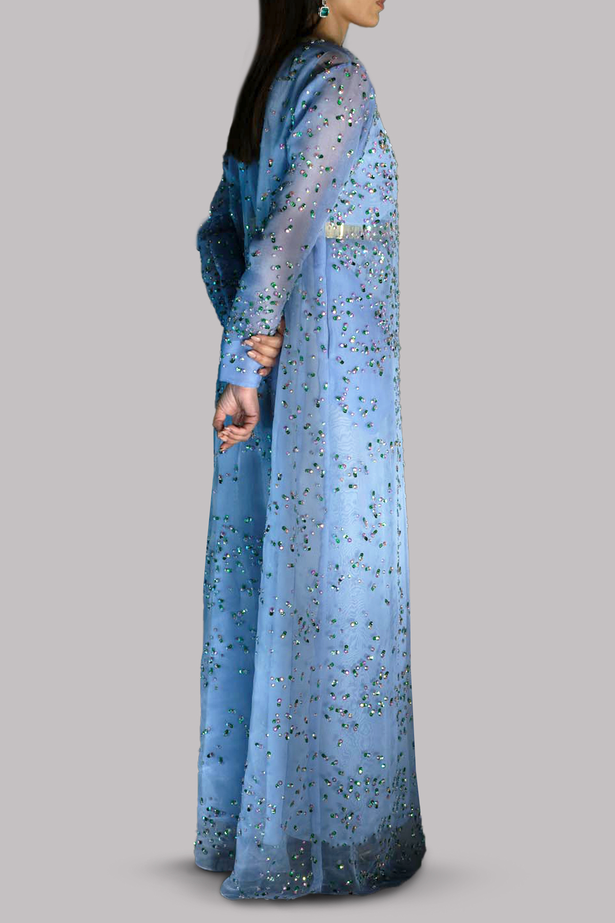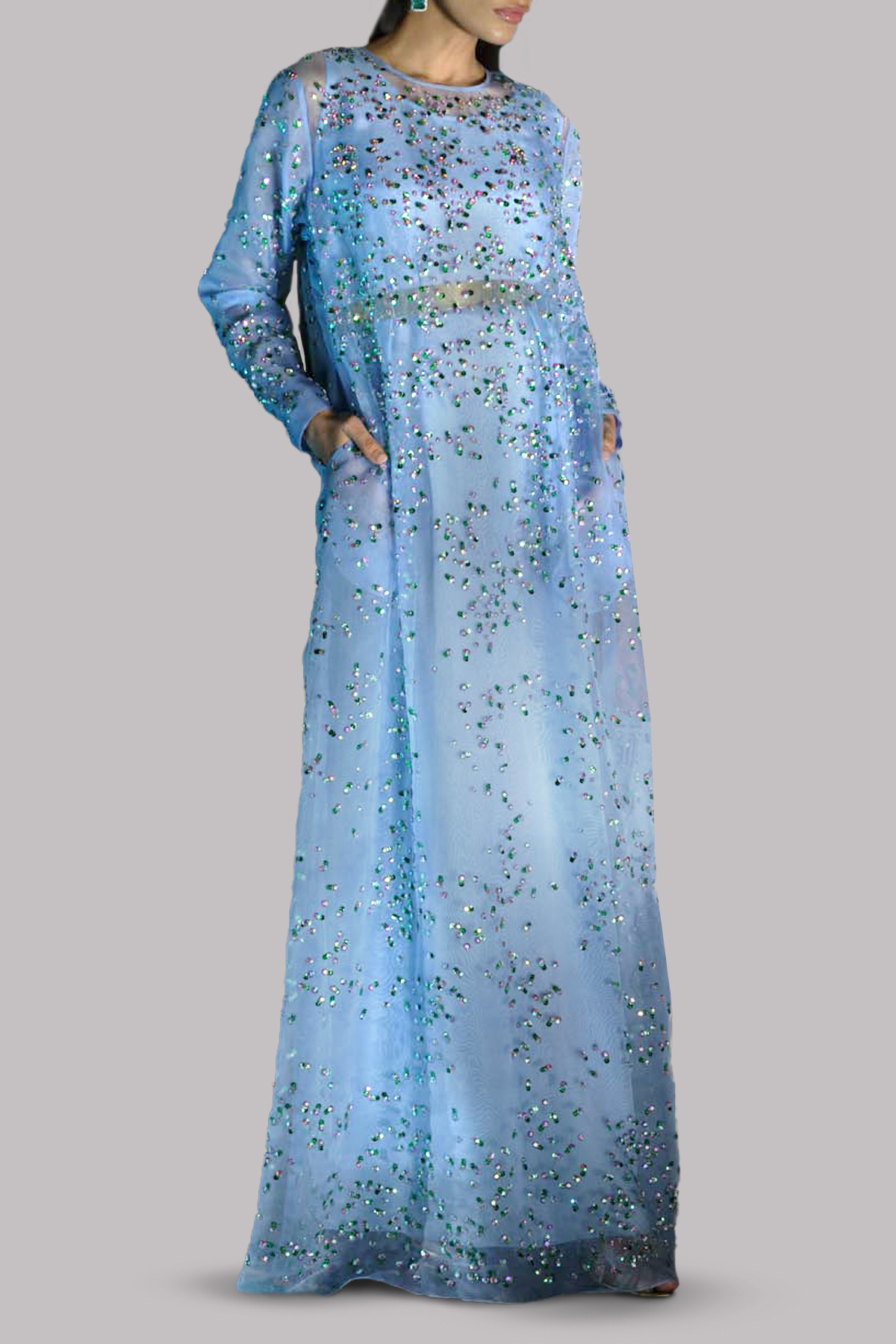 Graceful and luminous, the Blue Bell organza maxi features exquisite multicolor embellishments that bring vibrancy and depth to its ethereal silhouette. Crafted with fine detailing and delicate artistry, this statement piece captures the essence of modern elegance.
