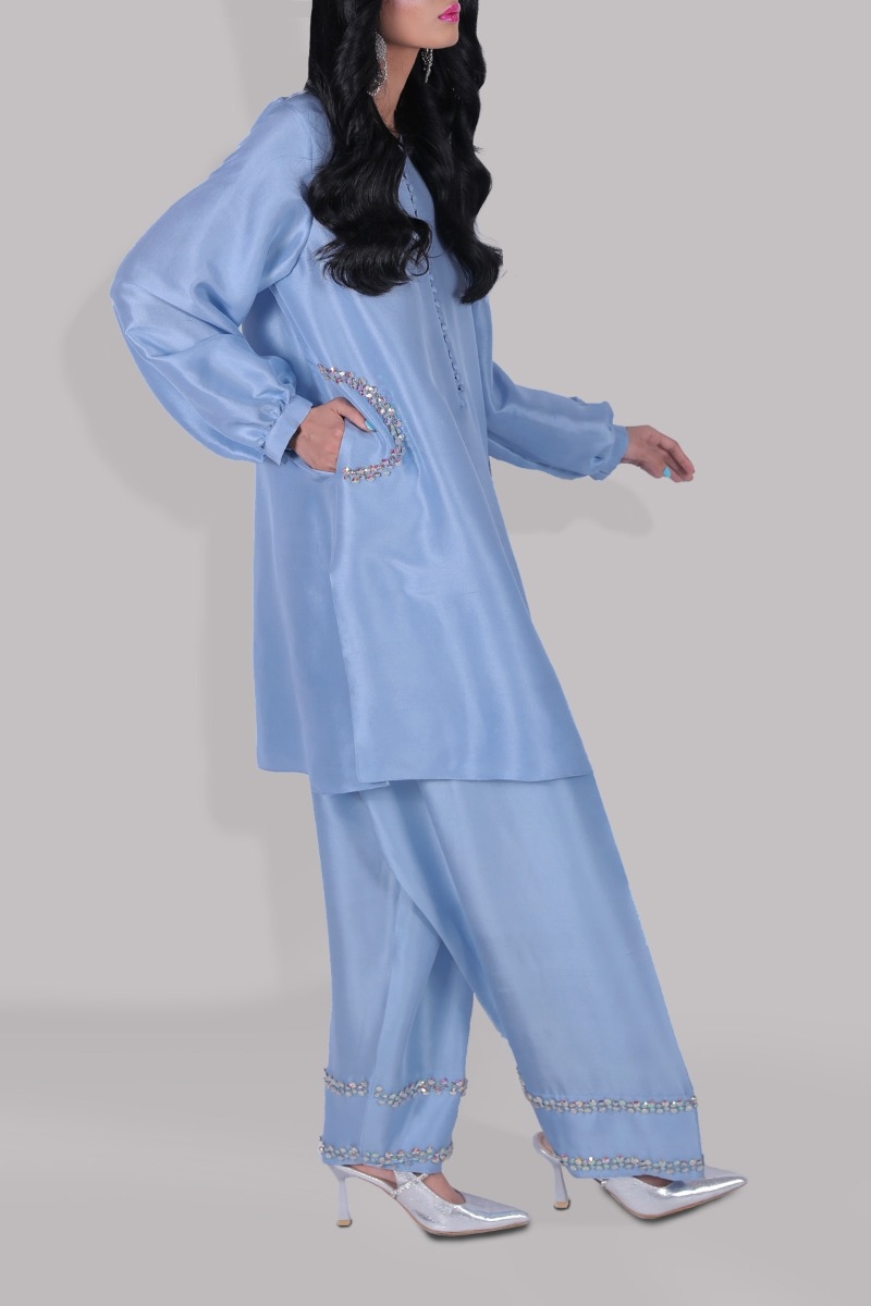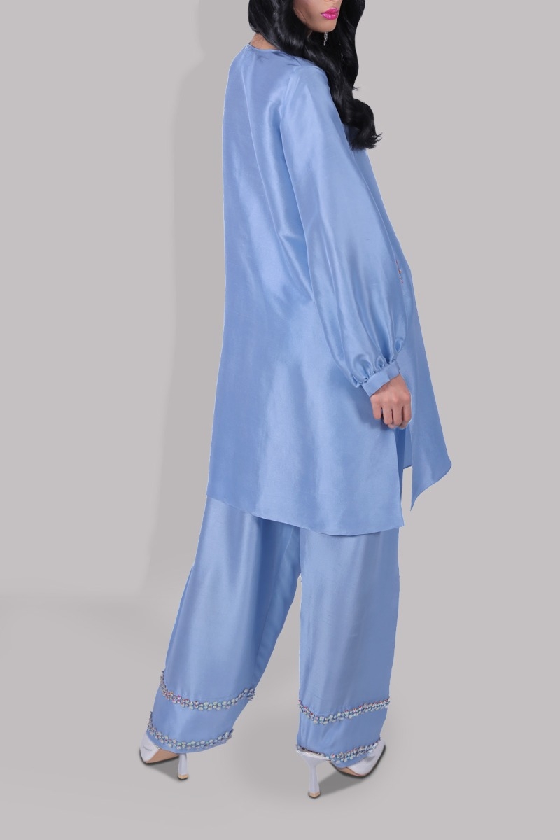 Blue Bell oversized close neck raw silk shirt effortless and chic, it’s impeccably tailored with matching raw silk shalwar pants. This loose breezy vibrant set is flawless for balmy days.