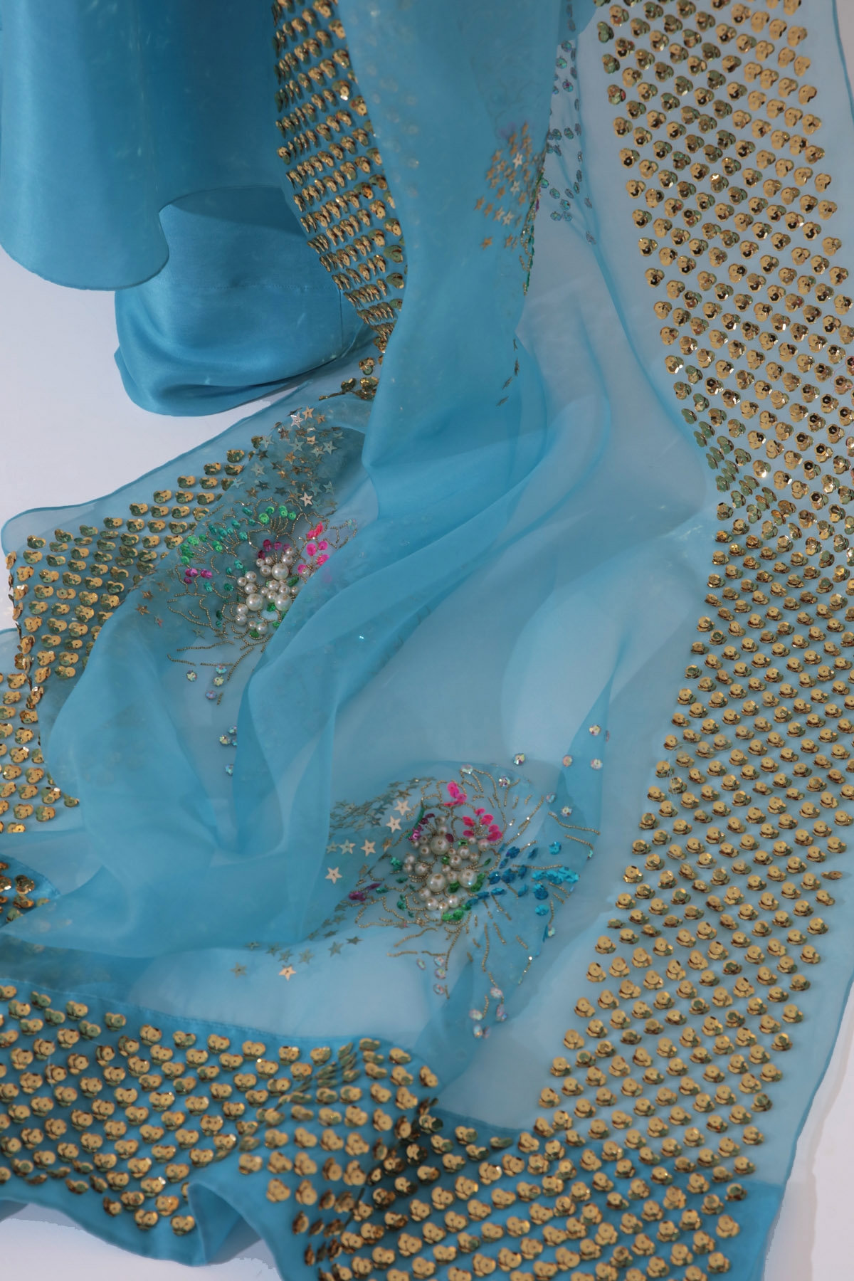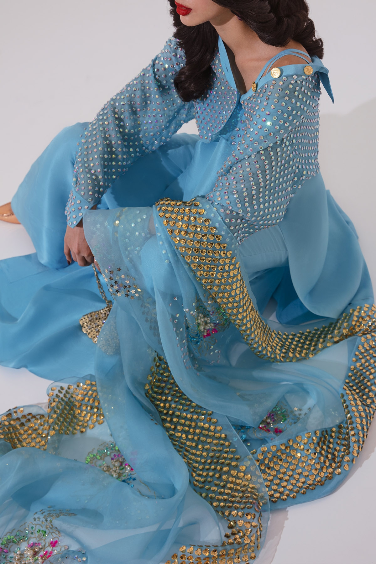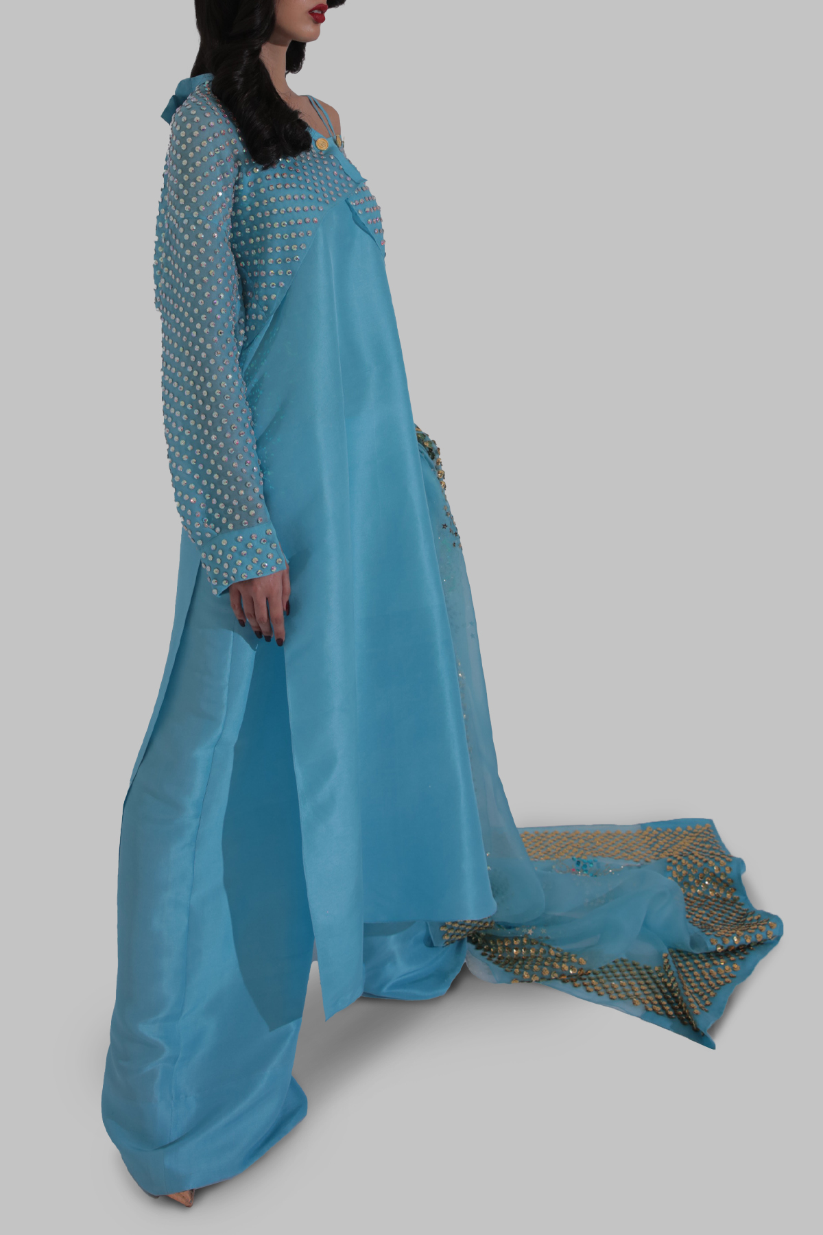 Blue topaz raw silk top with spaghetti straps and high side slits, styled with a crystal embellished cropped oversized organza jacket. Matching raw silk wide legged pants and organza dupatta hand embellished with multi-coloured sequins and crystals.