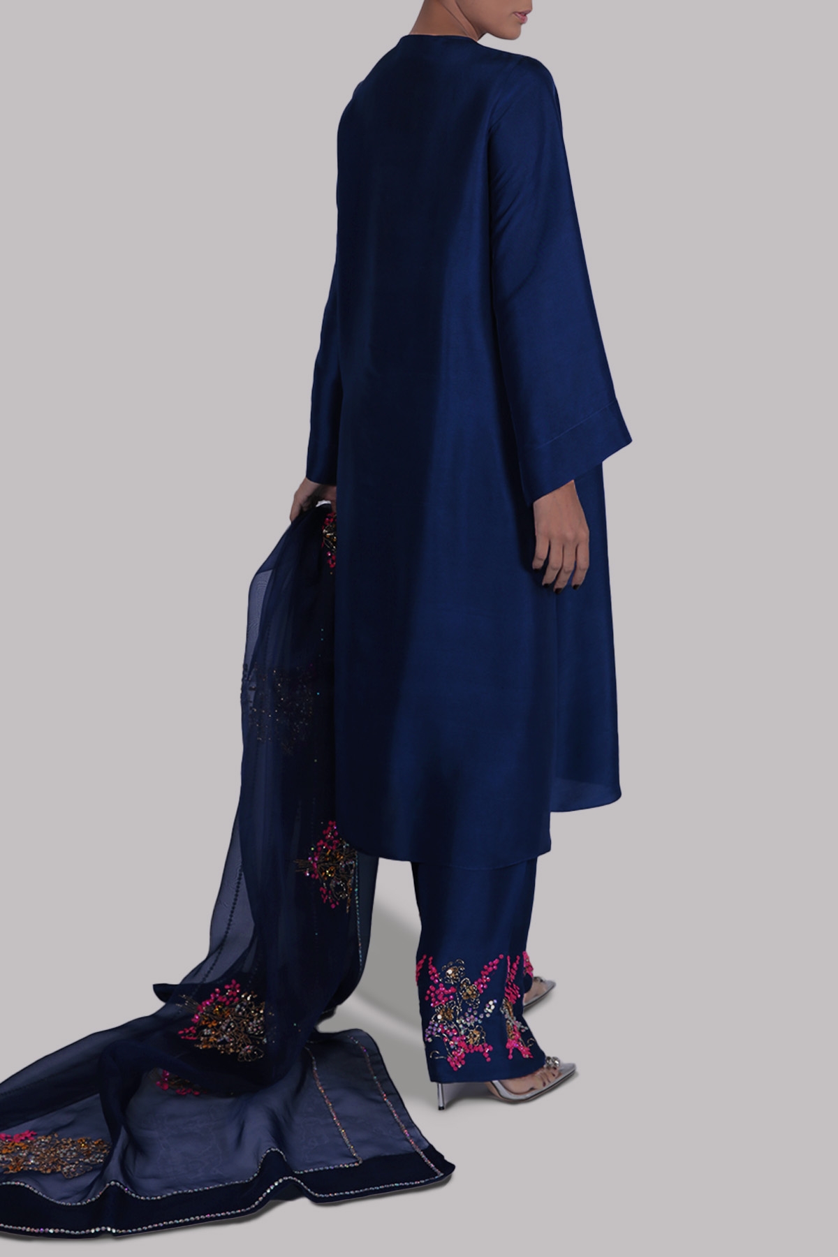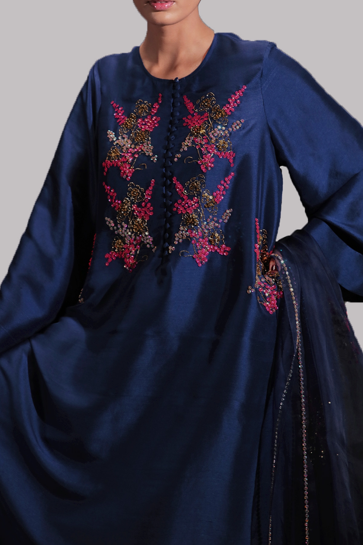 Blueprint oversized raw silk top, hand embellished with multi-coloured French and Italian sequins with matching embellished raw silk shalwar and embellished organza dupatta.