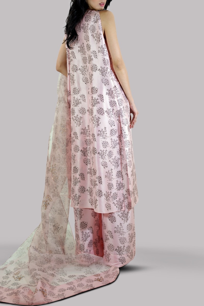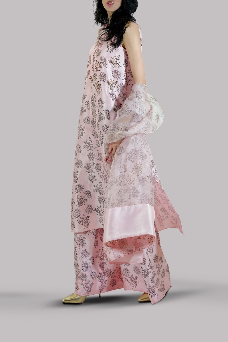 Blushing Bride close neck raw silk block printed shirt decorated with gold sparkling sequins. It has perfect cuts and extravagant details, It’s impeccably tailored with matching block printed raw silk palazzo pants, paired with block printed organza dupatta.