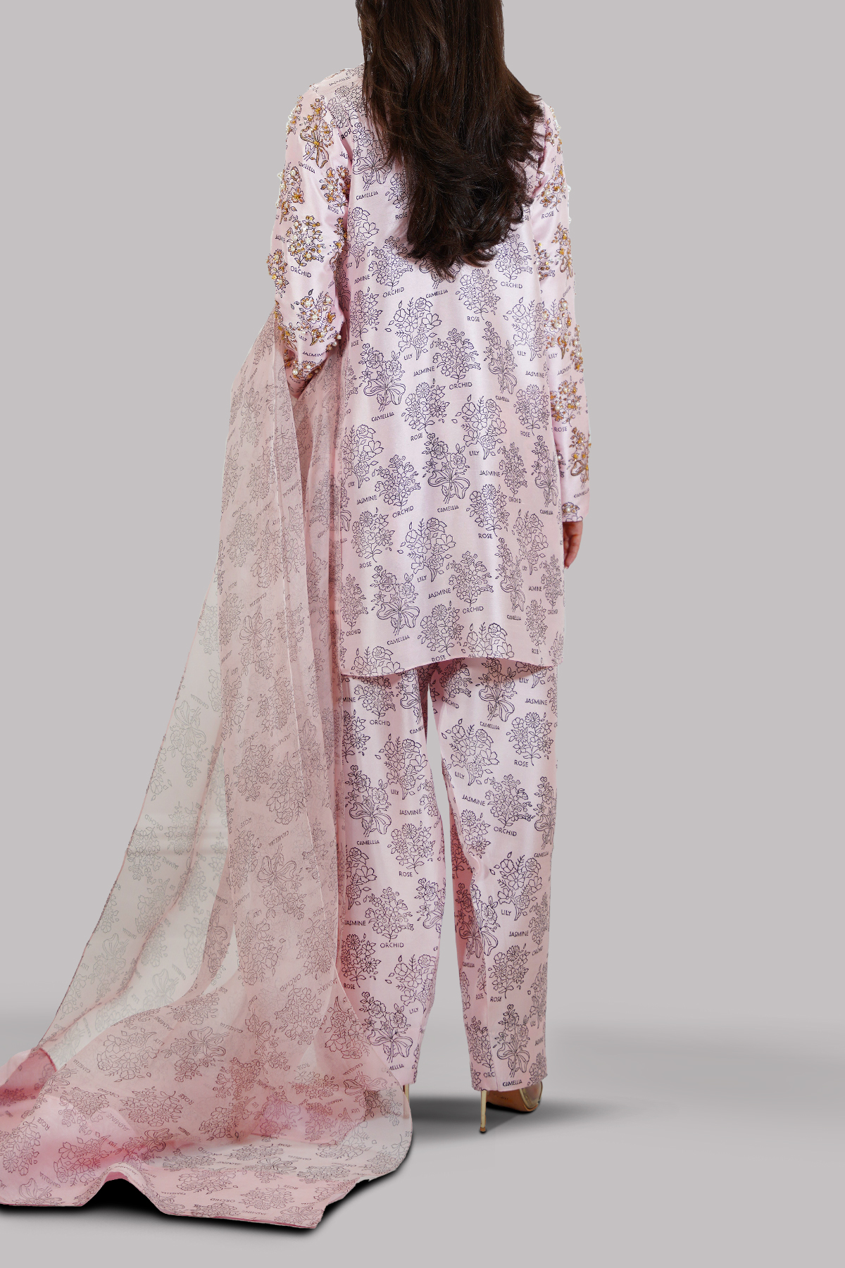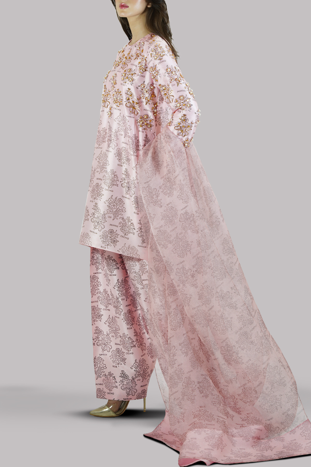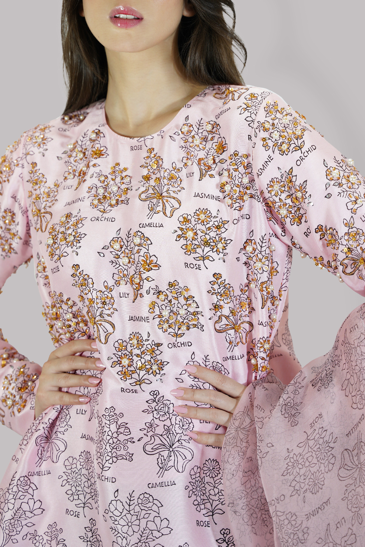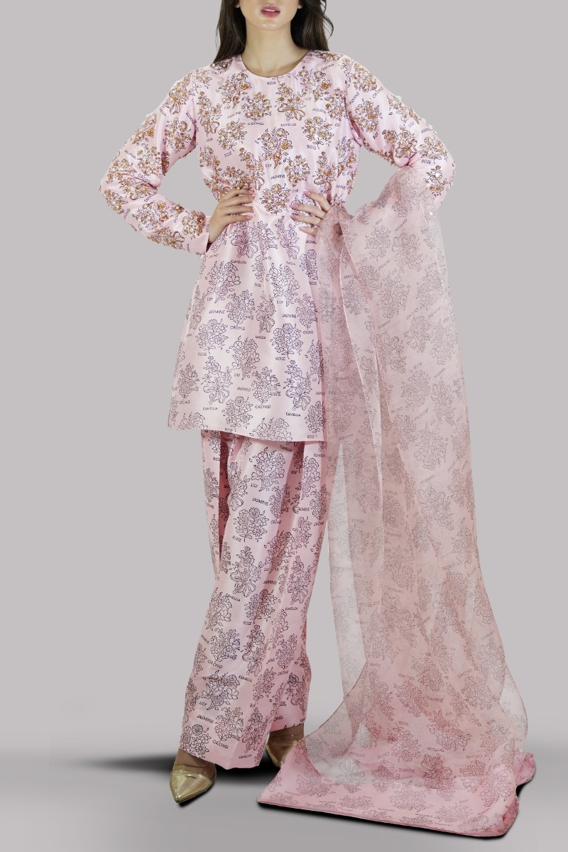 Blushing Bride close neck raw silk shirt decorated with white pearls gold sparkling sequins. It has perfect cuts and extravagant details, It’s impeccably tailored with matching block printed raw silk shalwar pants, paired with block printed organza dupatta.