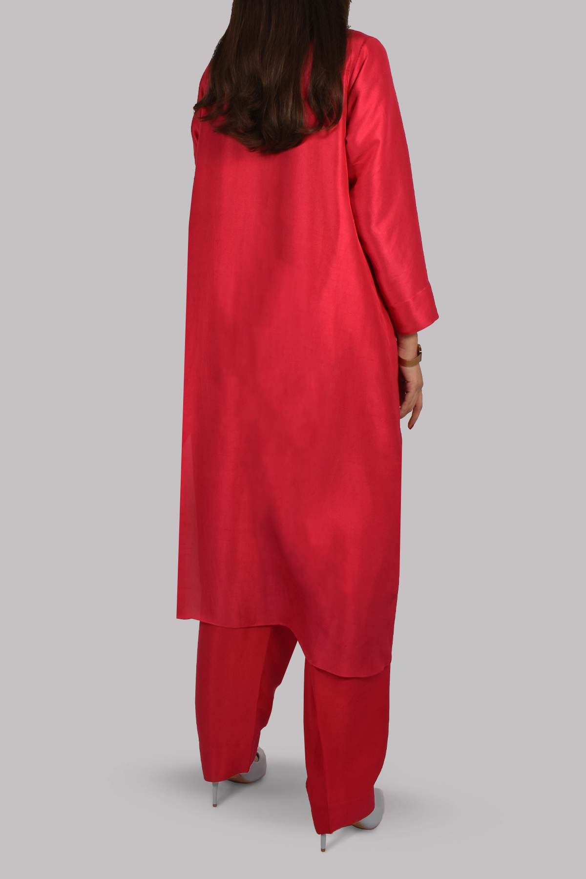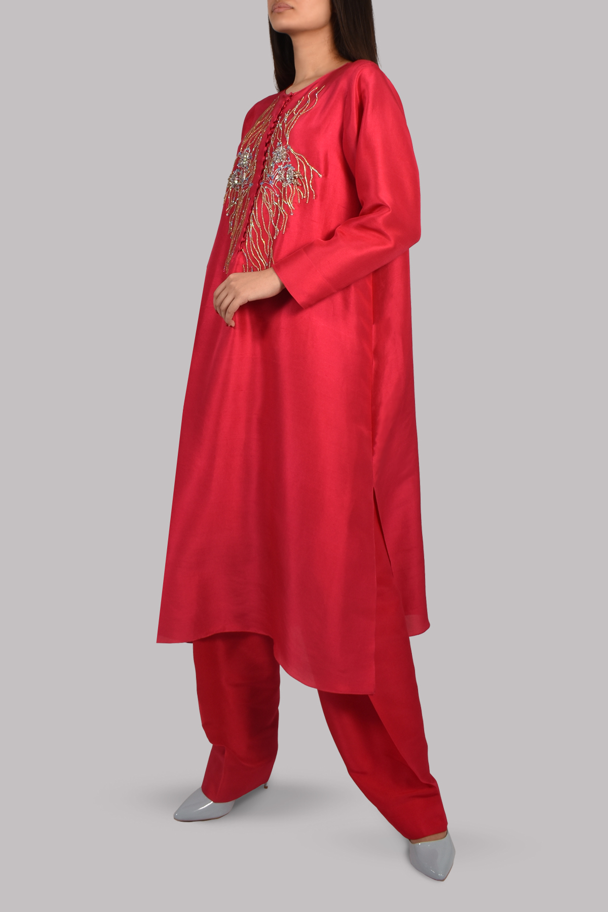 Bright rose dupion dress hand, embellished with sequins and crystals. Contrasting crystal embellished shalwar pants and a gold sequin embellished organza dupatta.