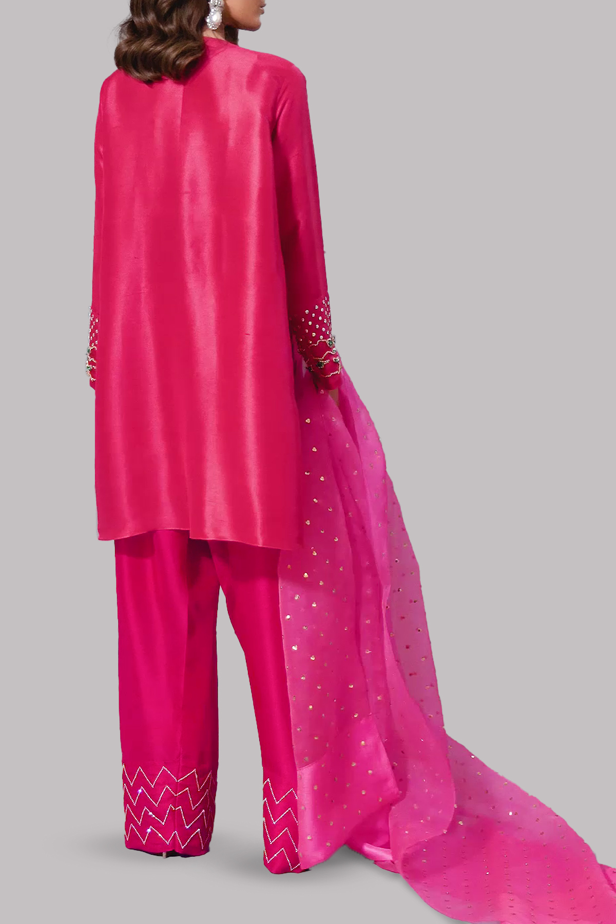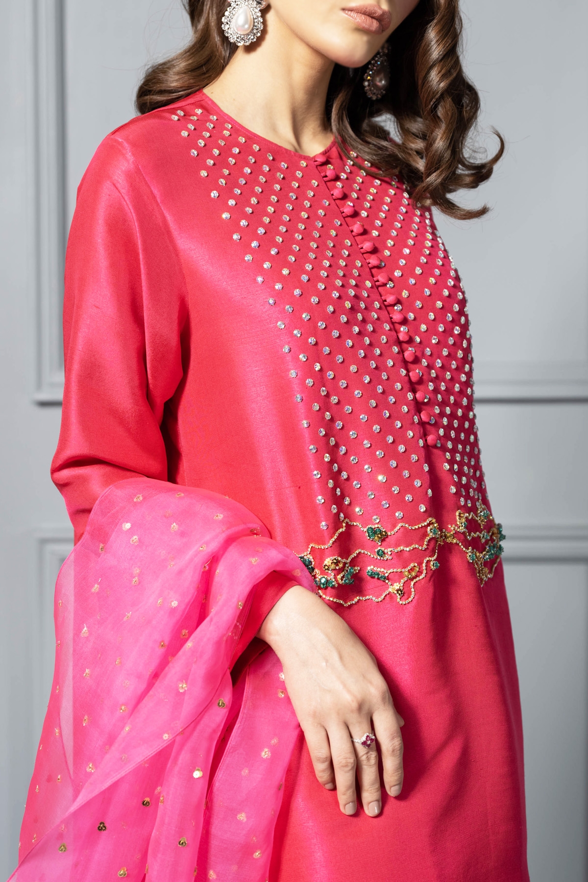 Bright Rose slightly oversized dupion silk top, hand embellished with crystals, sequins and glass beads with matching embellished raw silk shalwar pants and Azalea Pink sequin embellished organza dupatta.