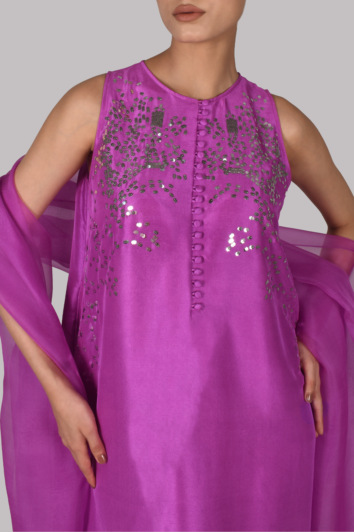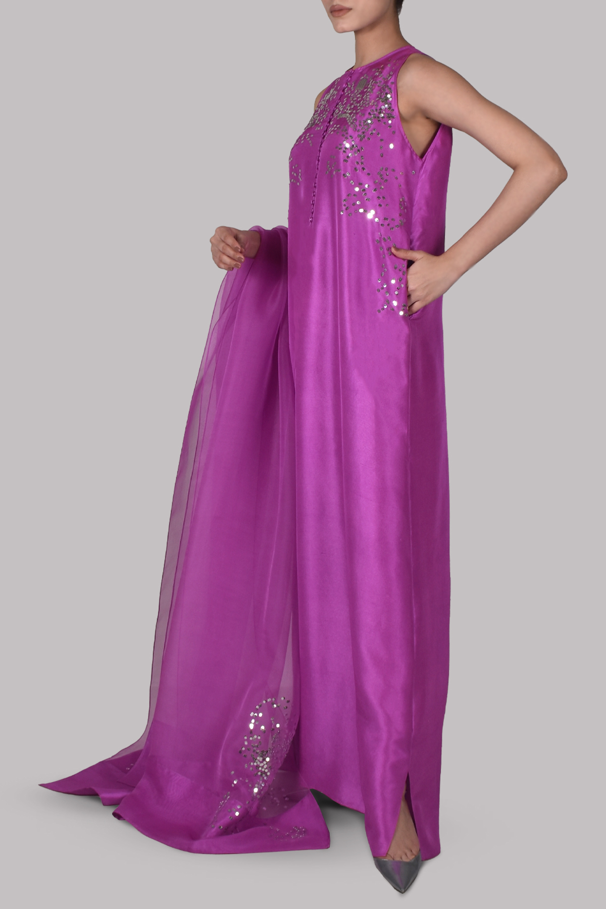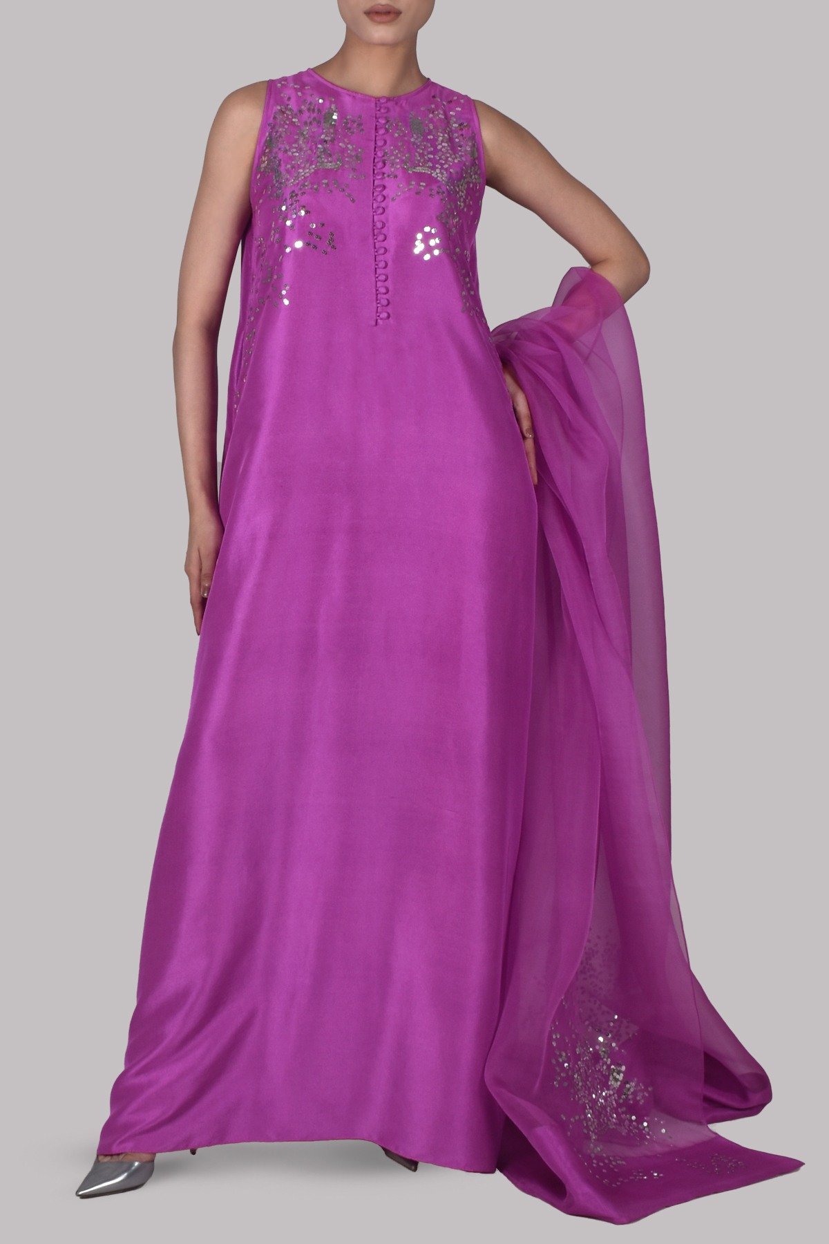 In a regal shade of Byzantium, this raw silk maxi is adorned with intricate embellishments that shimmer with refined artistry. Its flowing silhouette offers effortless grace, while the matching organza dupatta, delicately embellished to mirror the maxi, adds a sheer layer of elegance.