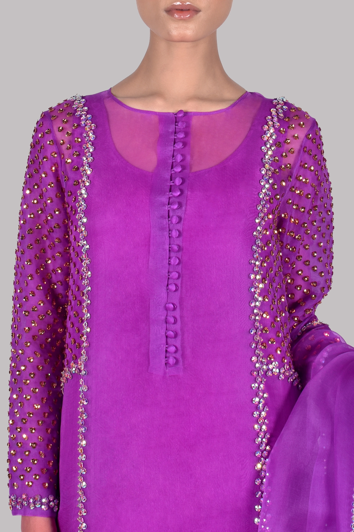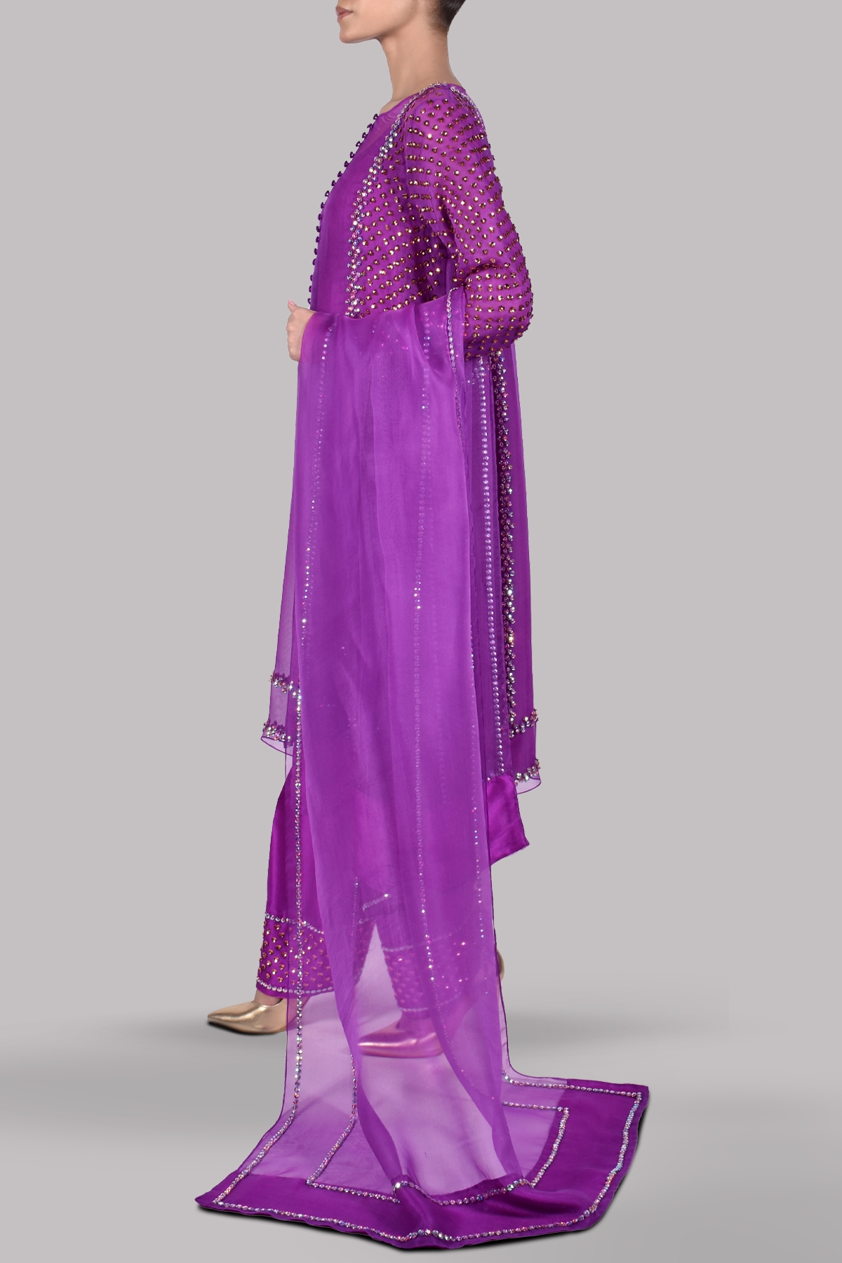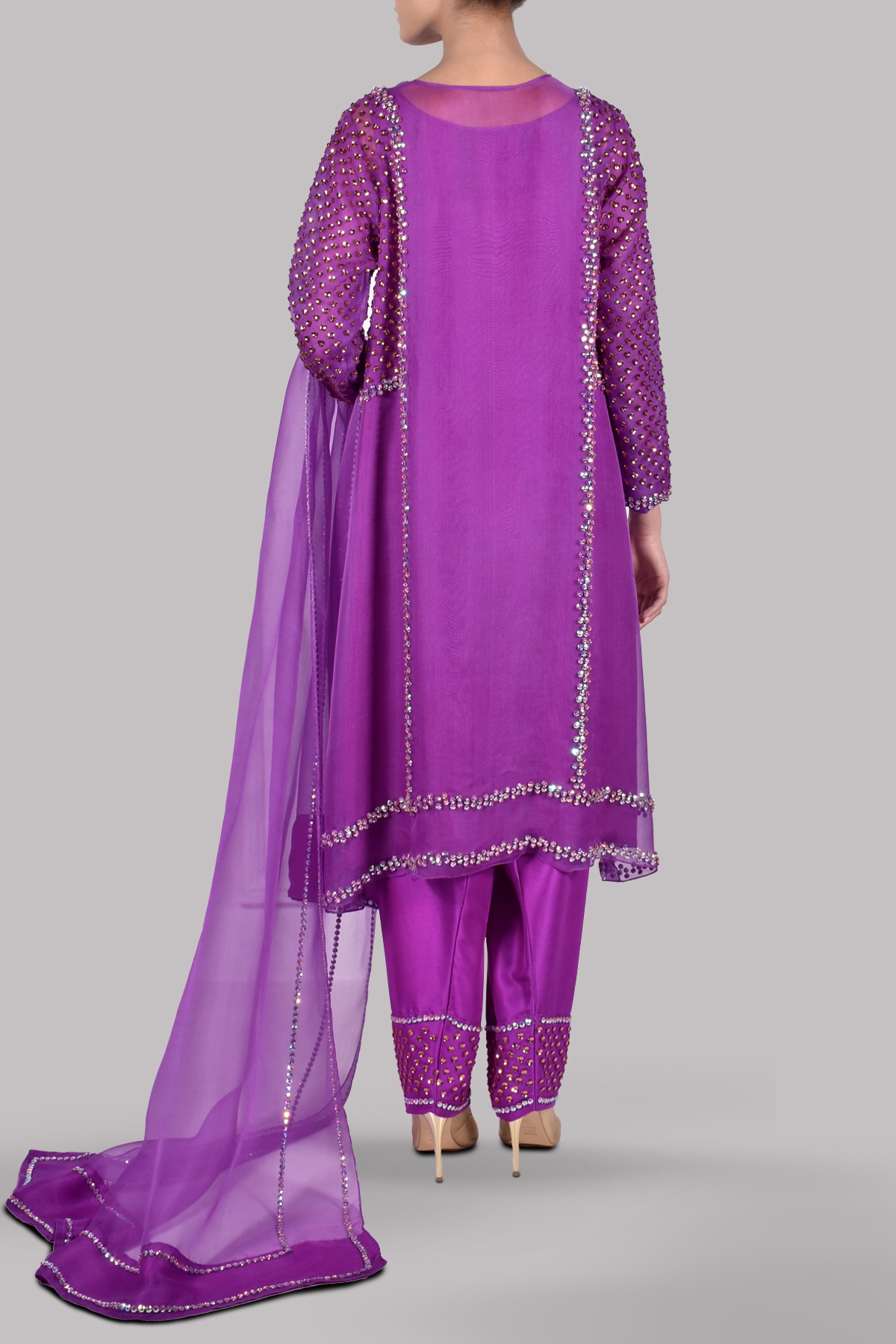 Byzantium close neck organza shirt decorated with sparkling crystals with perfect cut and extravagant details, It’s impeccably tailored with matching embellished raw silk shalwar pants.