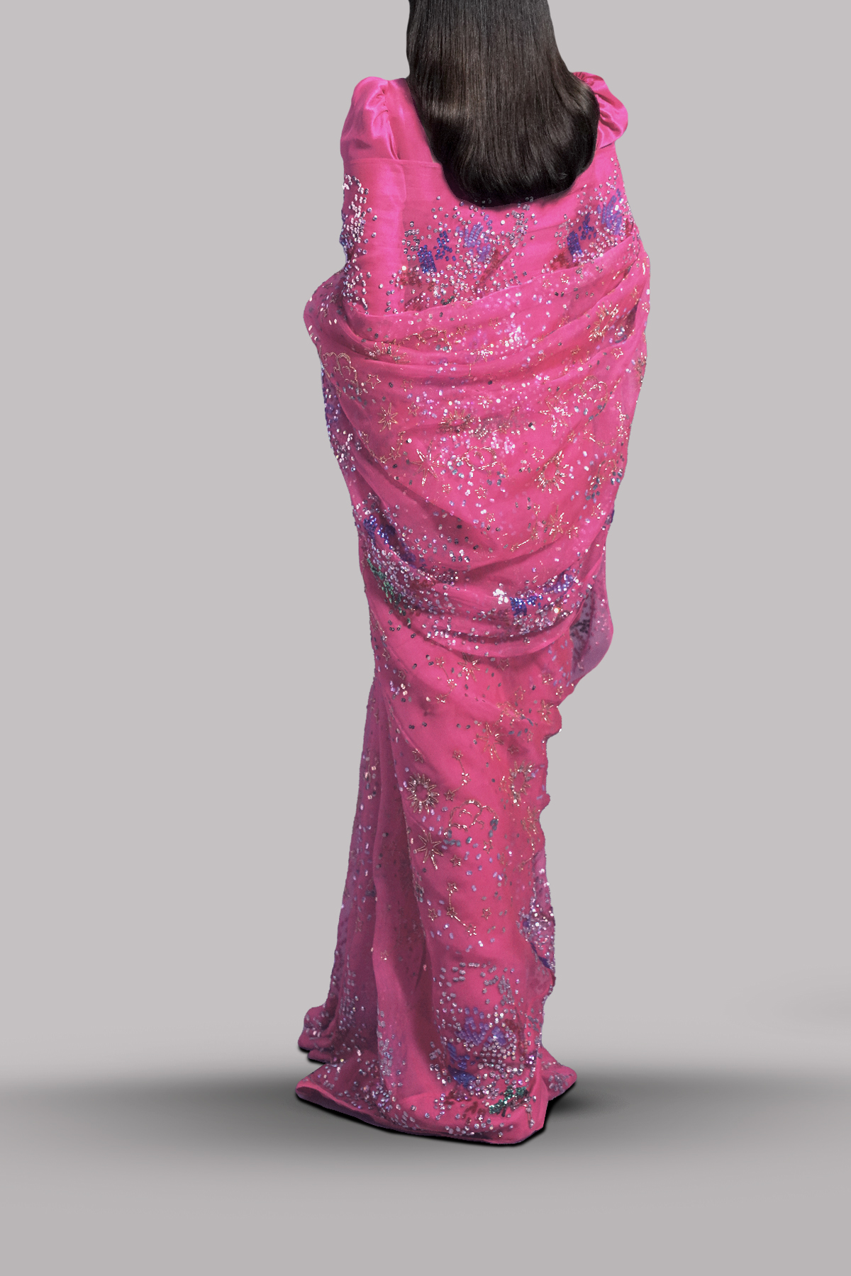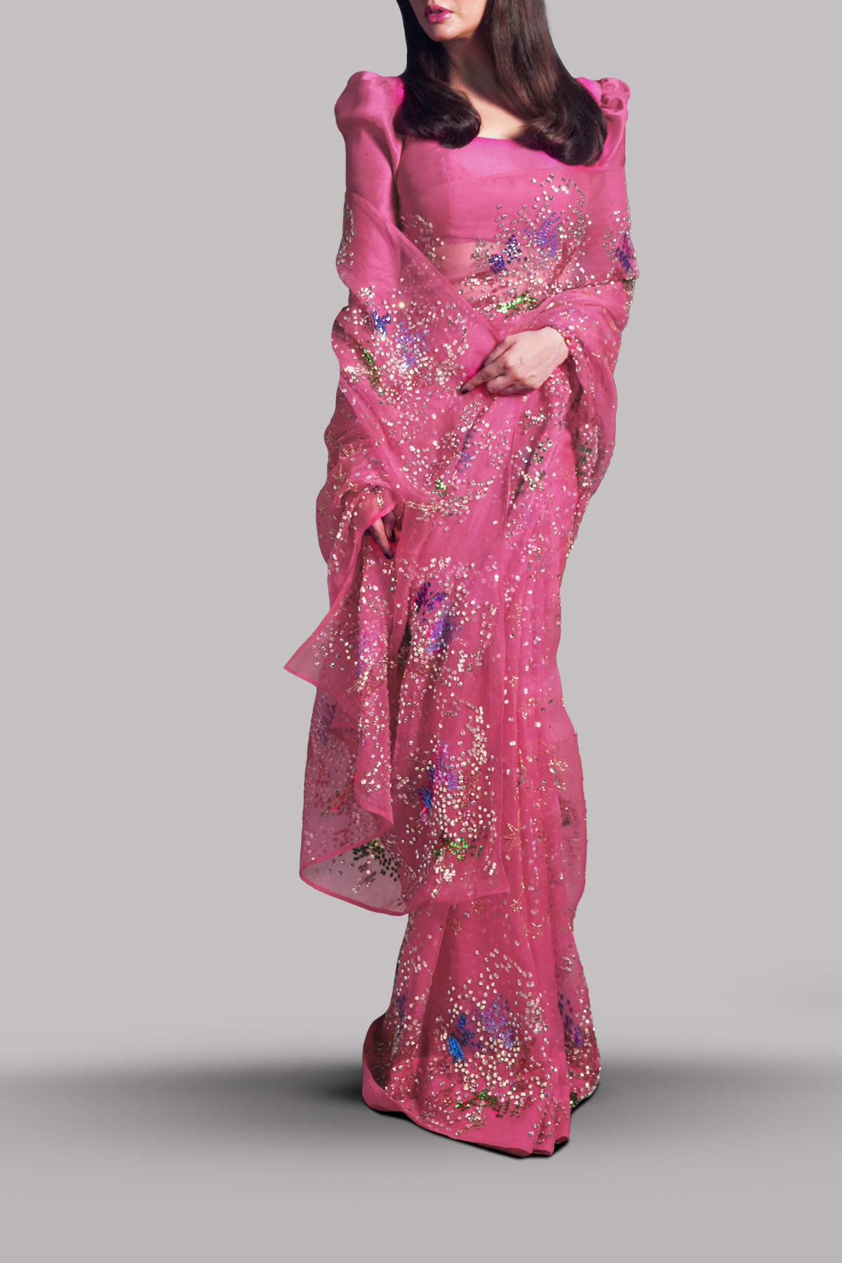 Camellia Pink organza sari hand embellished with our intricate embellishments of dazzling crystals and multi coloured glistening sequins. Matching cropped blouse hand embellished with French and Italian glittering sequins. This sensational sari is no exception. The sari has stitched pleats for ease of wearing. Matching stitched underskirt included.
