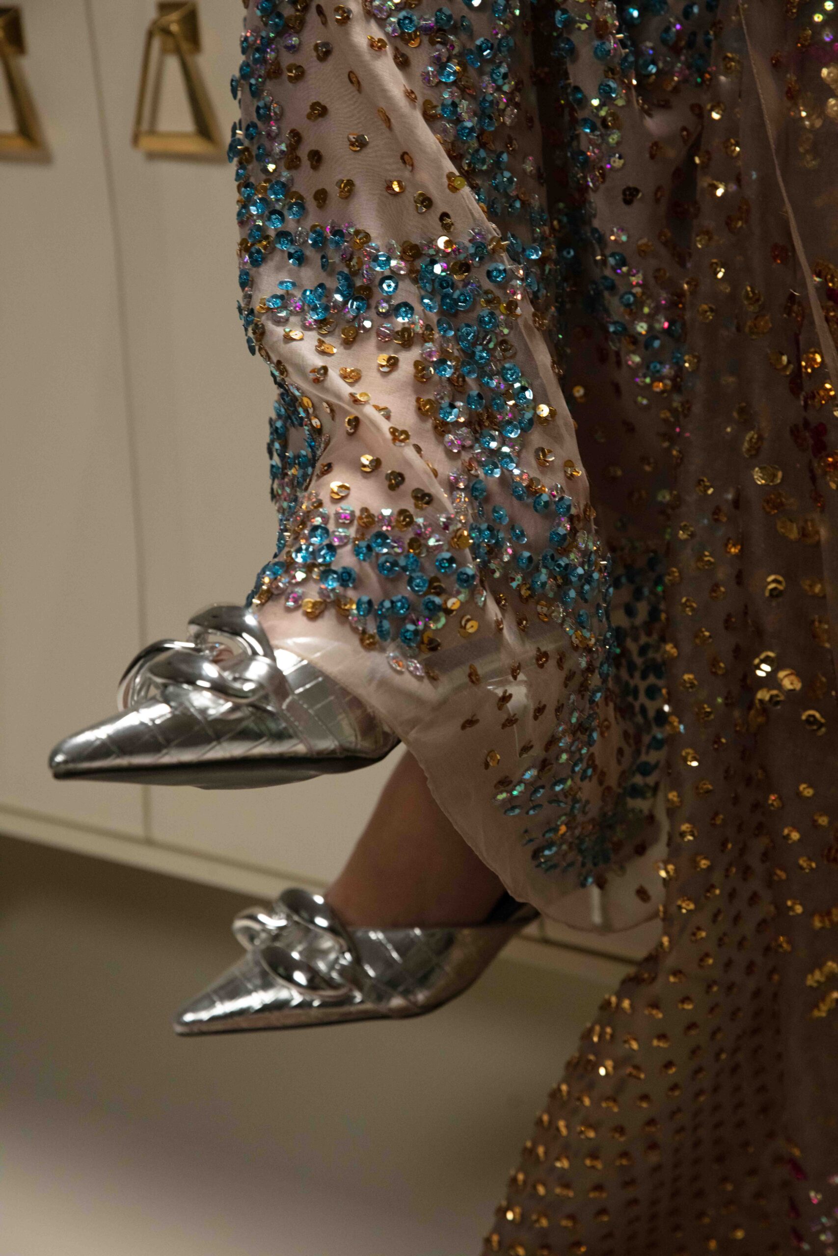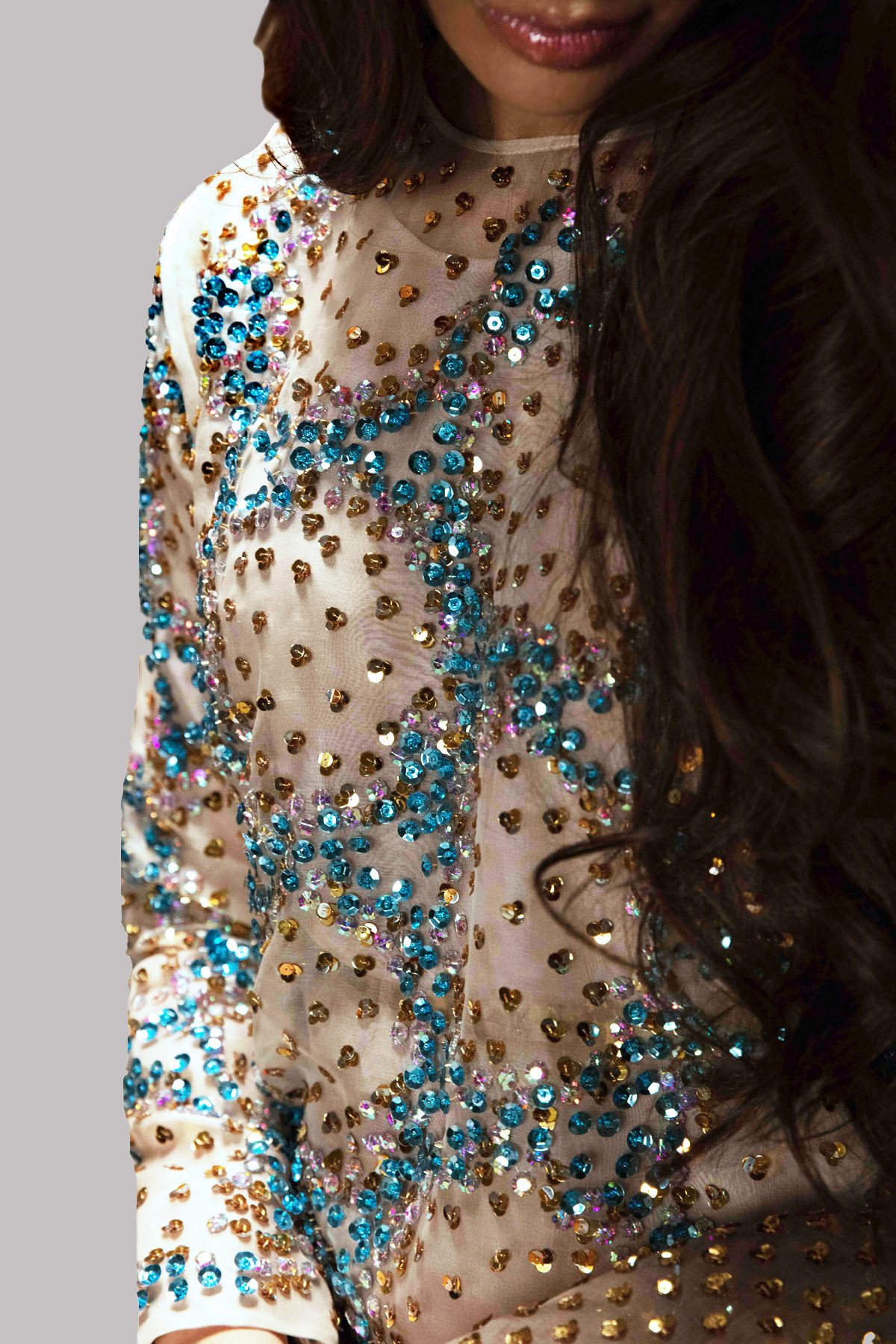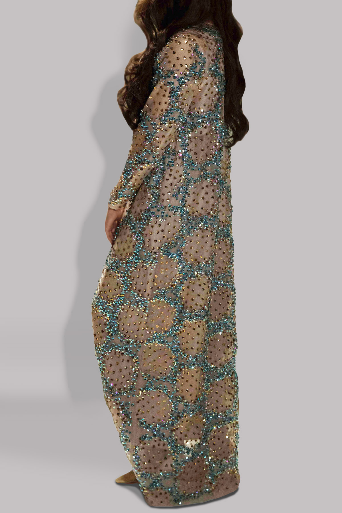 Cameo rose organza maxi dress hand embellished with sparkling crystals and metallic gold, neon, and multi-coloured sequins.