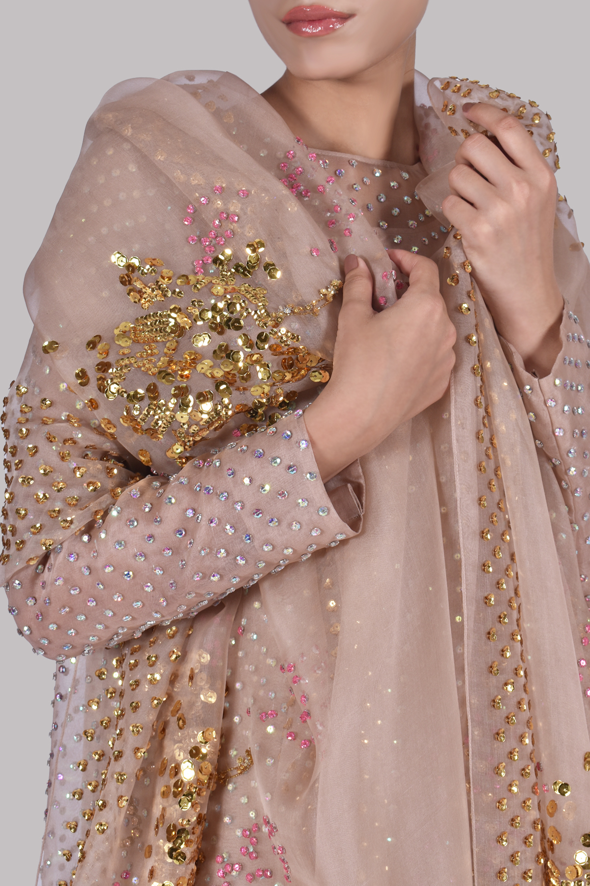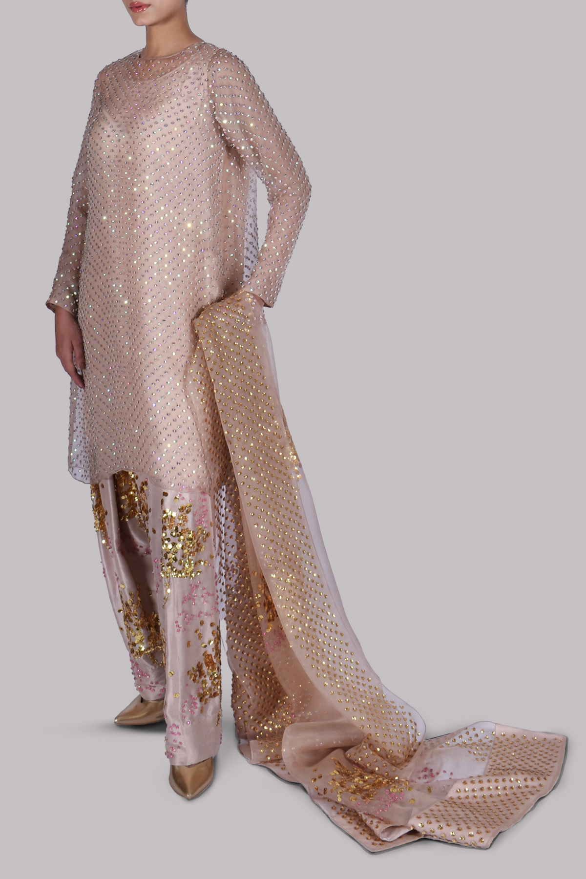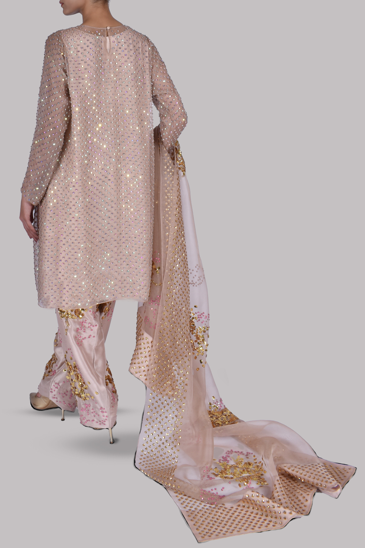 Cameo Rose close neck organza silk tunic hand embellished with sparkling crystals. Impeccably tailored with matching raw silk shalwar pants and an embellished dupatta. Perfect for a glamorous evening out.