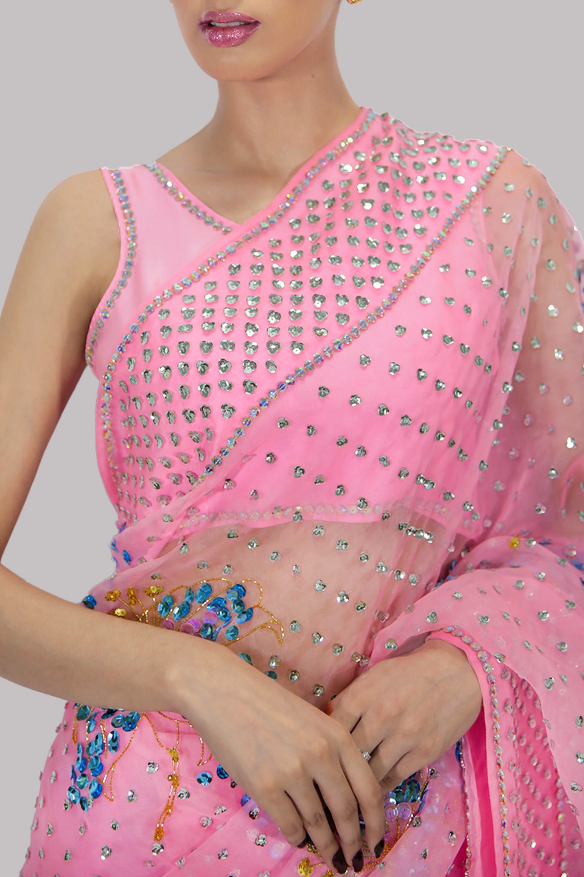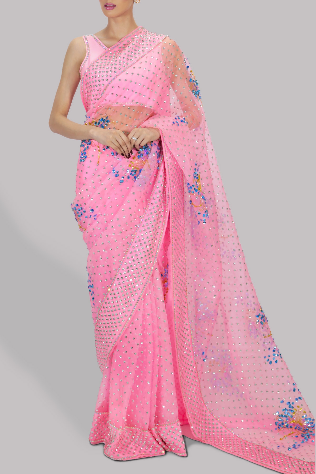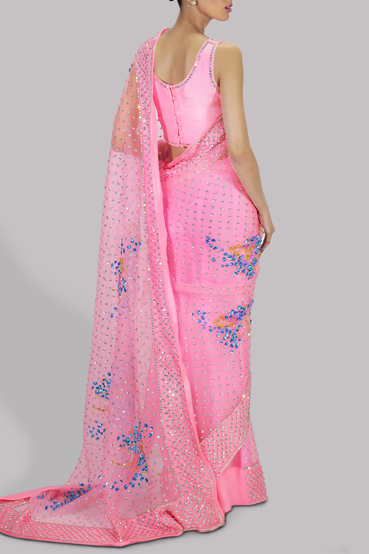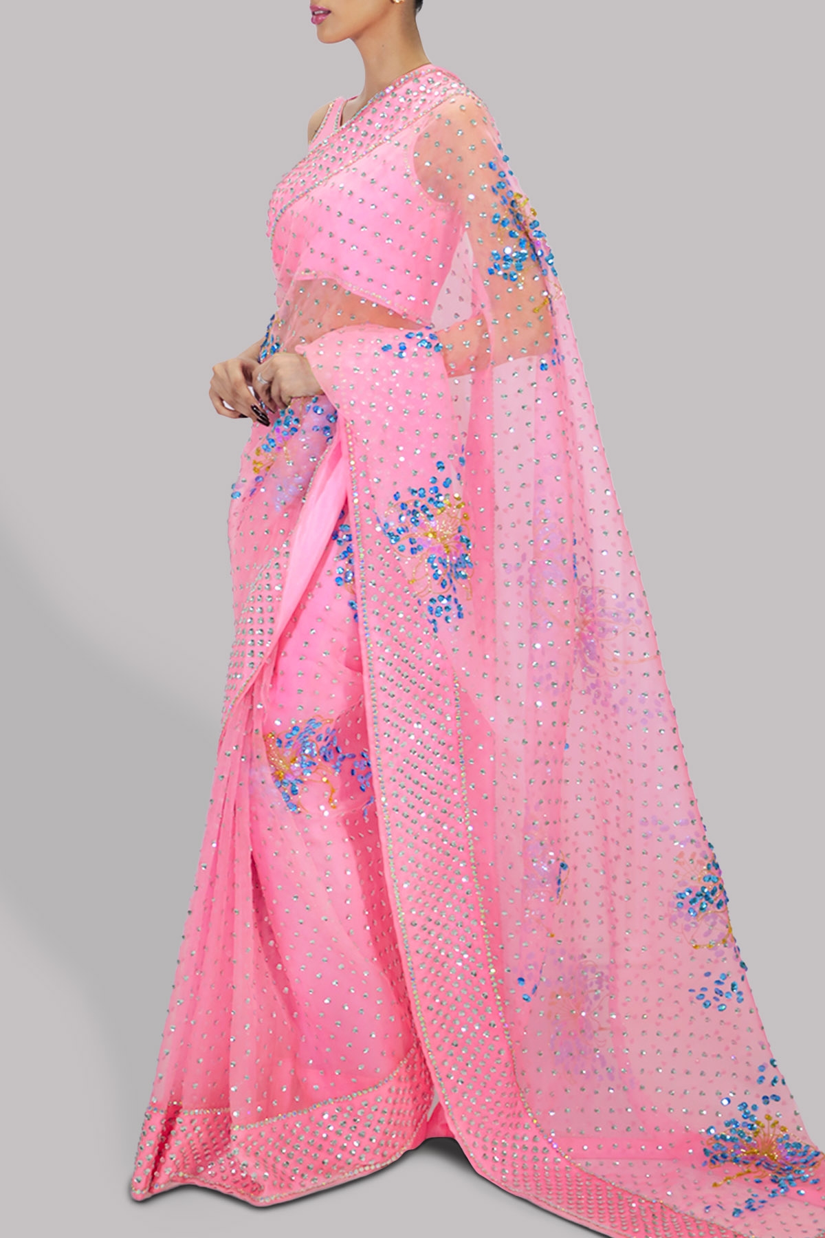 Candy Pink organza sari with matching embellished cropped blouse. Hand embellished with freshwater pearls, Intricate glistening sequin work, dazzling crystals and gold beads. This sensational sari is no exception. This is a three piece look. The sari has stitched pleats for ease of wearing. Matching stitched underskirt included.