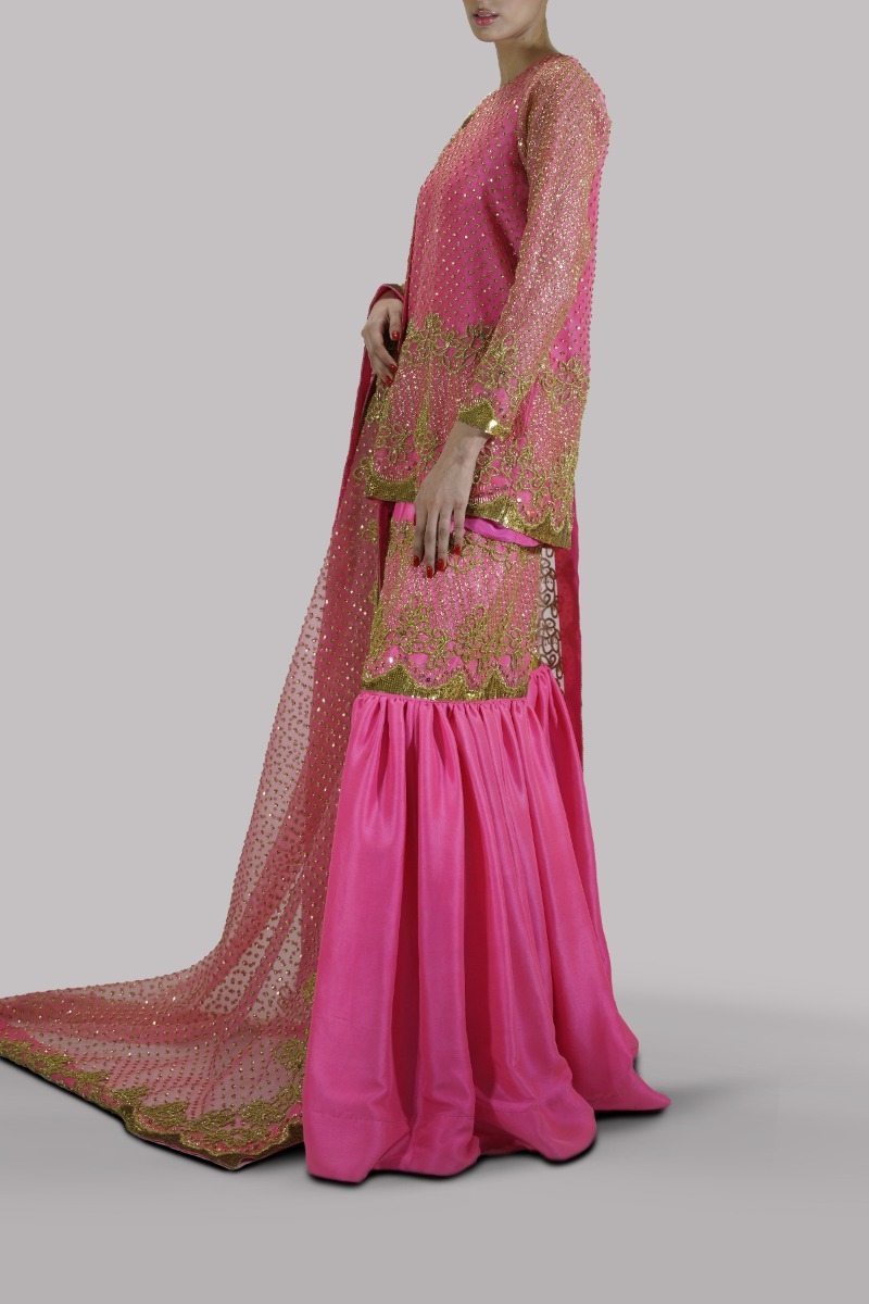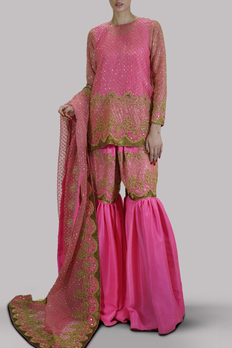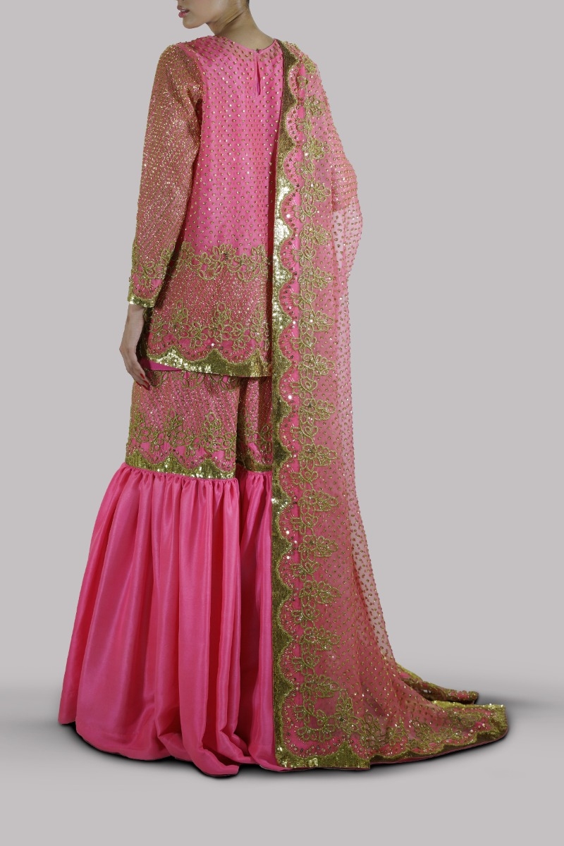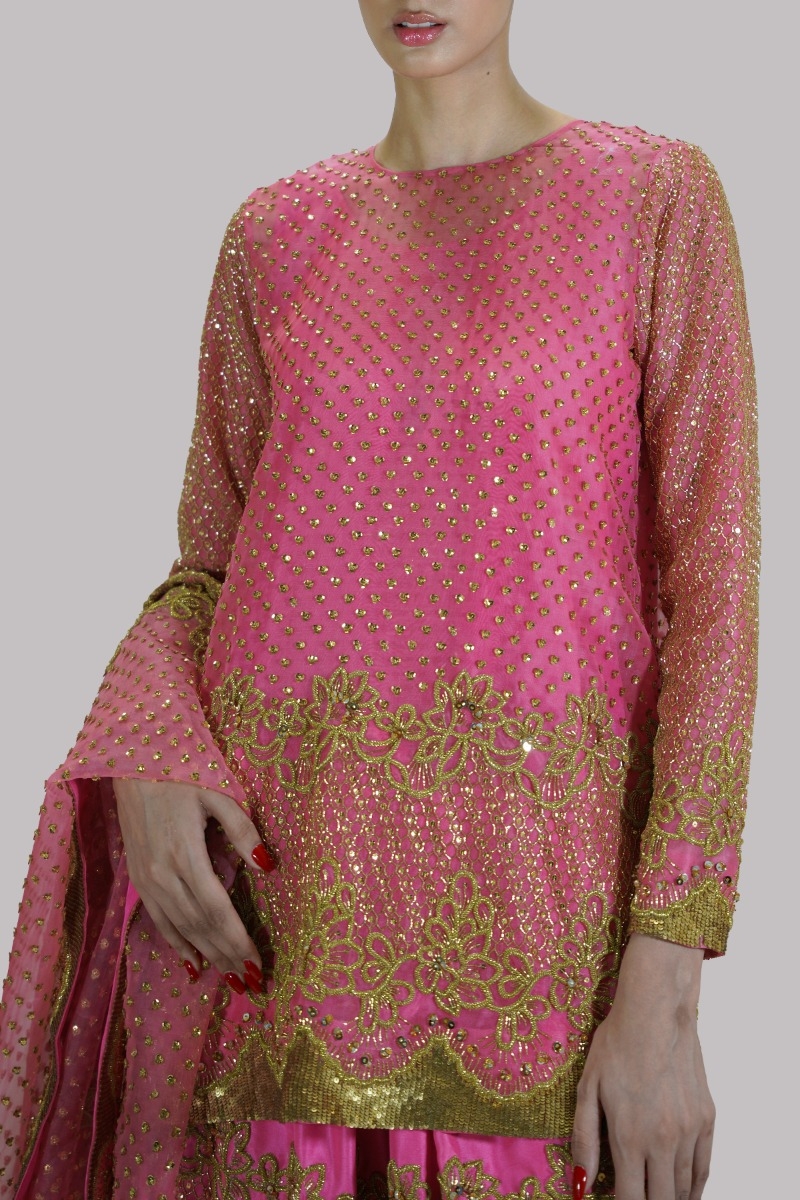 Carmine Rose, close neck raw silk shirt, heavily hand embellished with gold French and Italian sequins with perfect cut and extravagant details. Impeccably tailored with matching heavily hand embellished raw silk gharara and embellished organza dupatta.