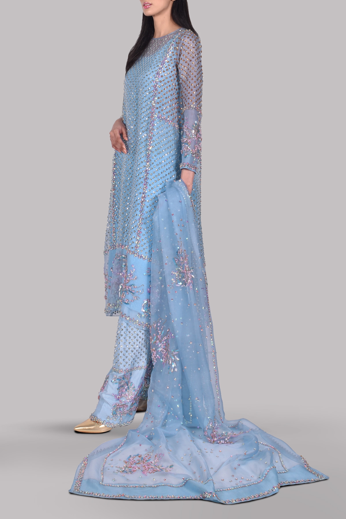 Cashmere Blue close neck organza shirt heavily embellished and decorated with shimmering and sparkling crystals with multi coloured glazed sequins with perfect cut and extravagant details on front and back, It’s impeccably tailored with matching raw silk shalwar pants and organza dupatta.
