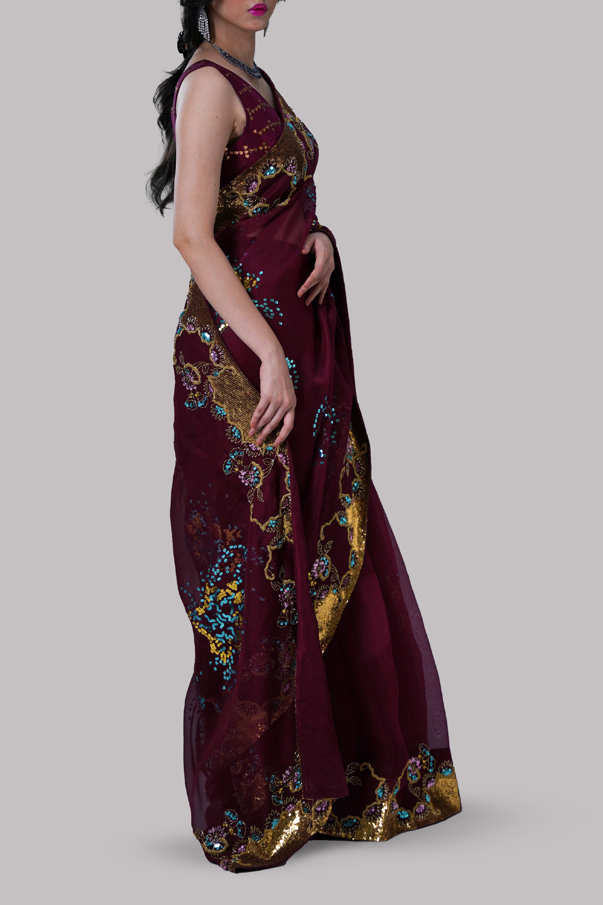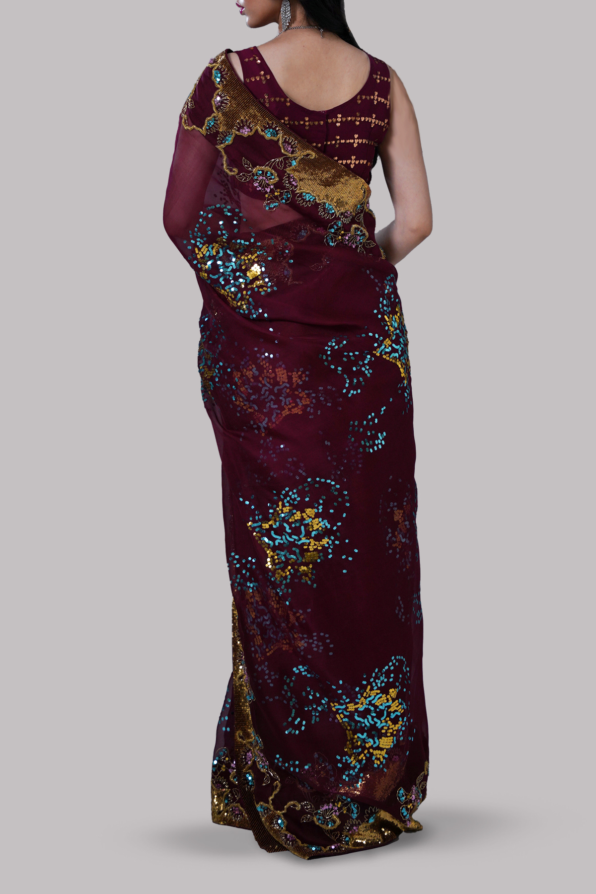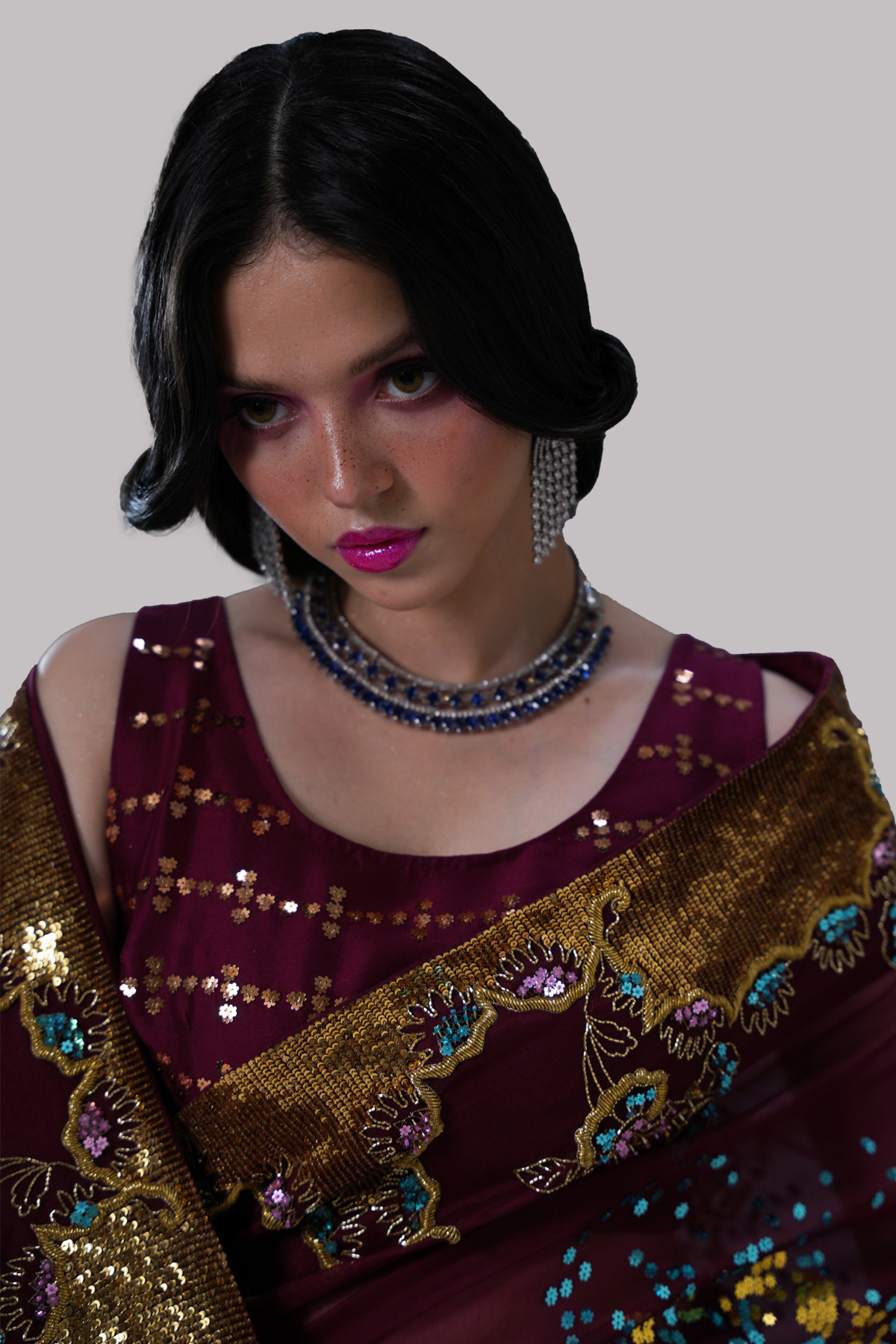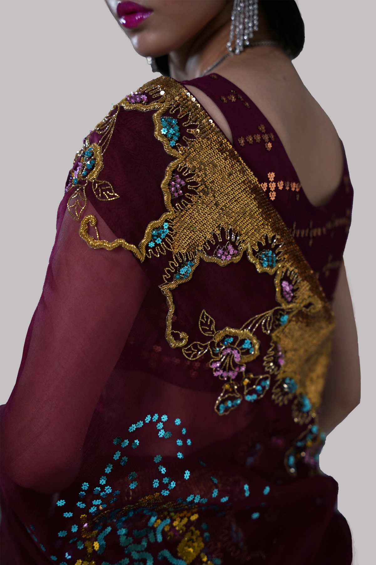 A graceful blend of modern allure and traditional elegance, this Cloqué Maroon-coloured sari layered with gold flowers in sheer organza drapes like a dream. Paired with a richly embellished raw silk blouse, the set offers a striking contrast of textures.