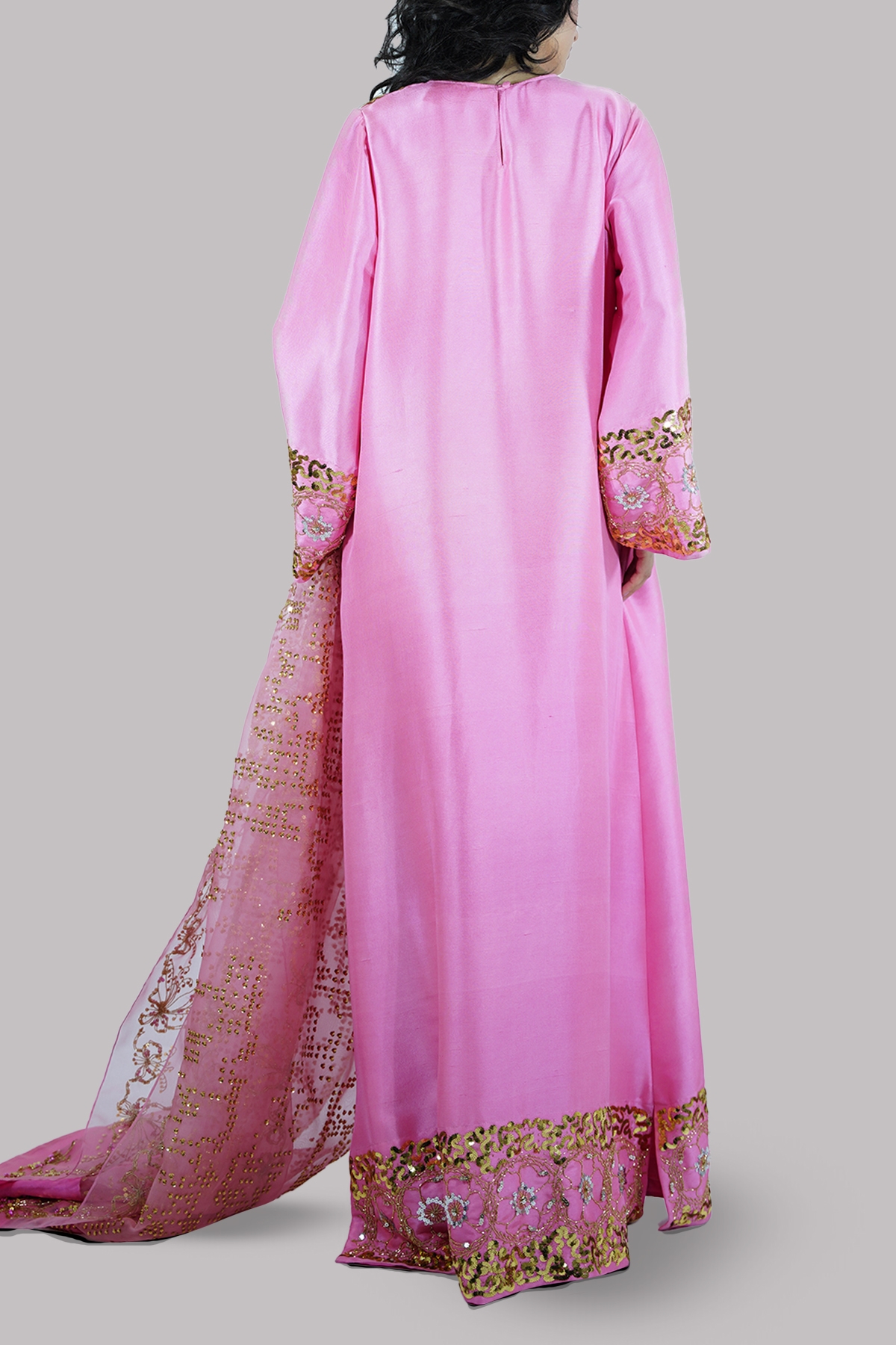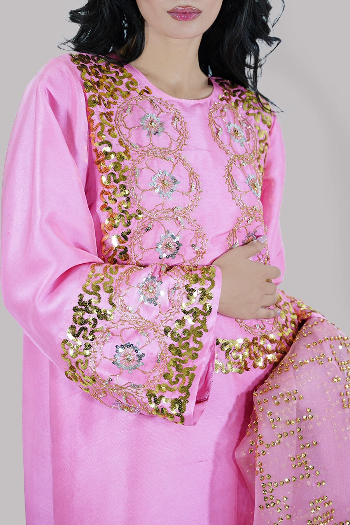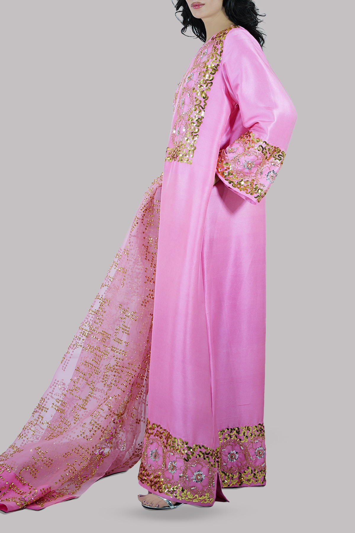 Confetti Pink embellished raw silk maxi paired with impeccably detailed embellished organza dupatta.