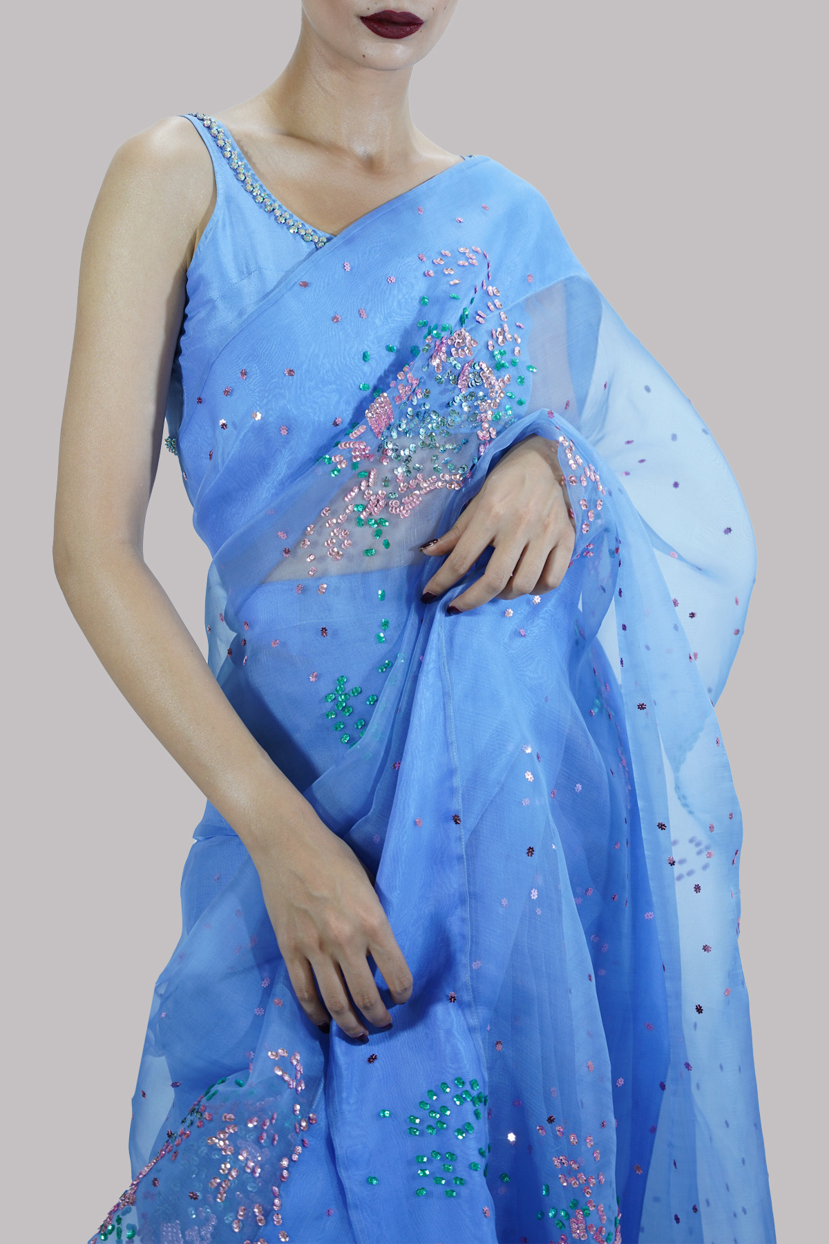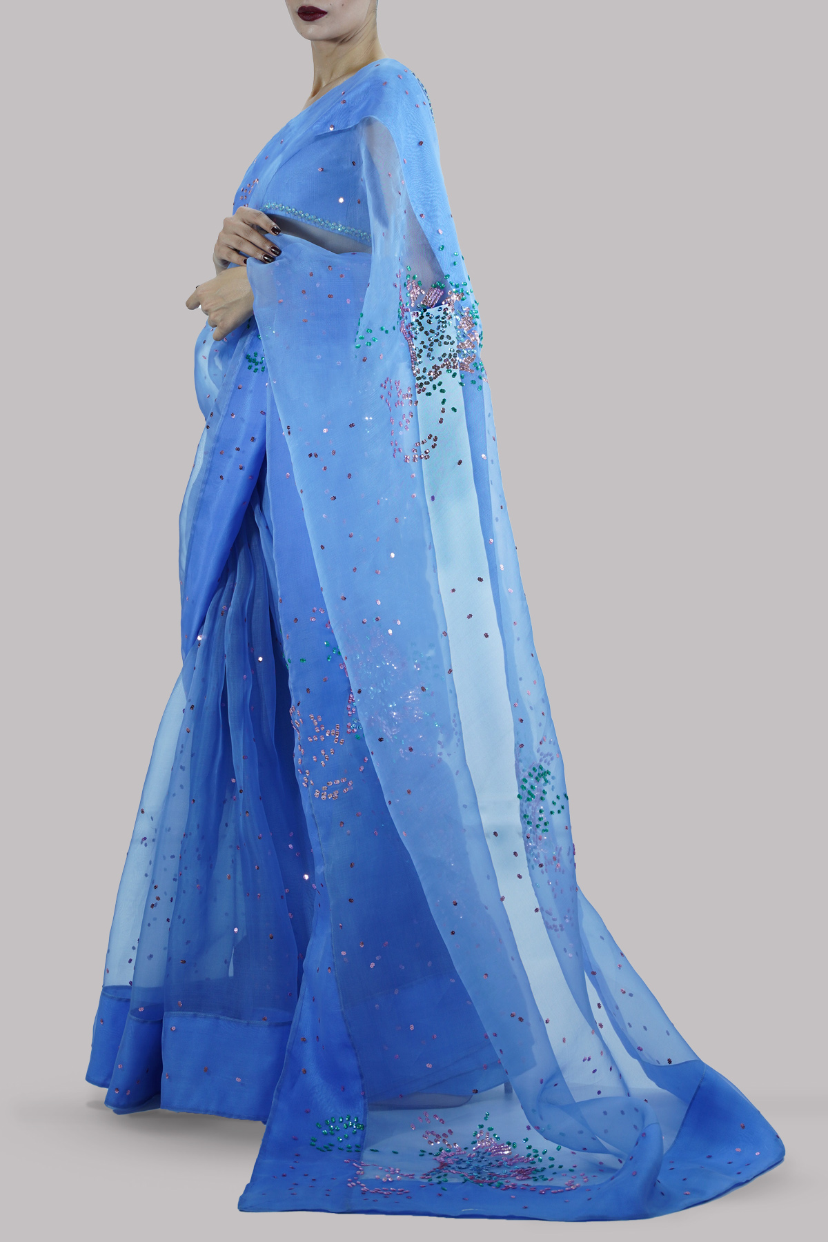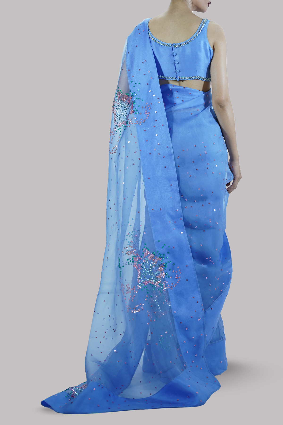 Cornflower Blue embellished organza sari adorned with multi-coloured sequins. Impeccably tailored with a matching raw silk blouse featuring a subtly embellished neckline.