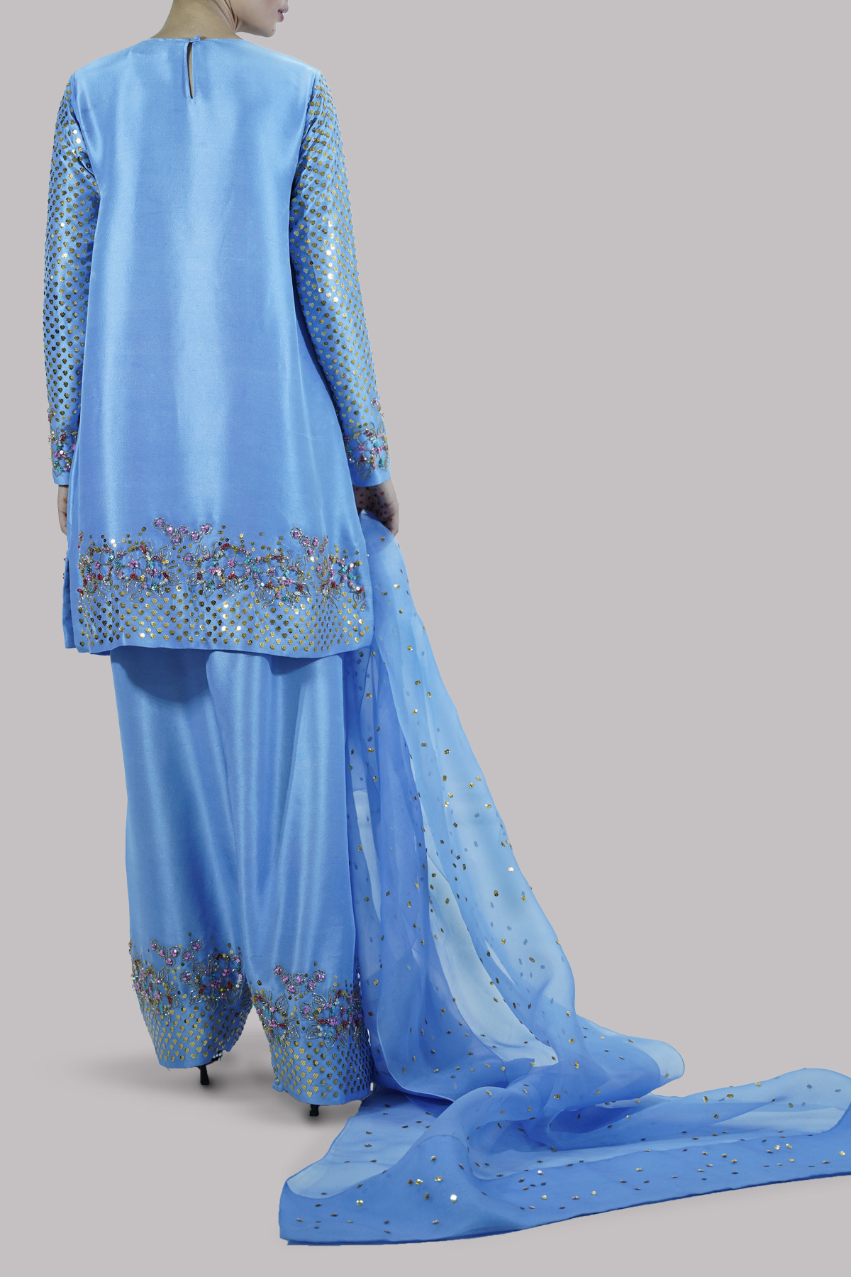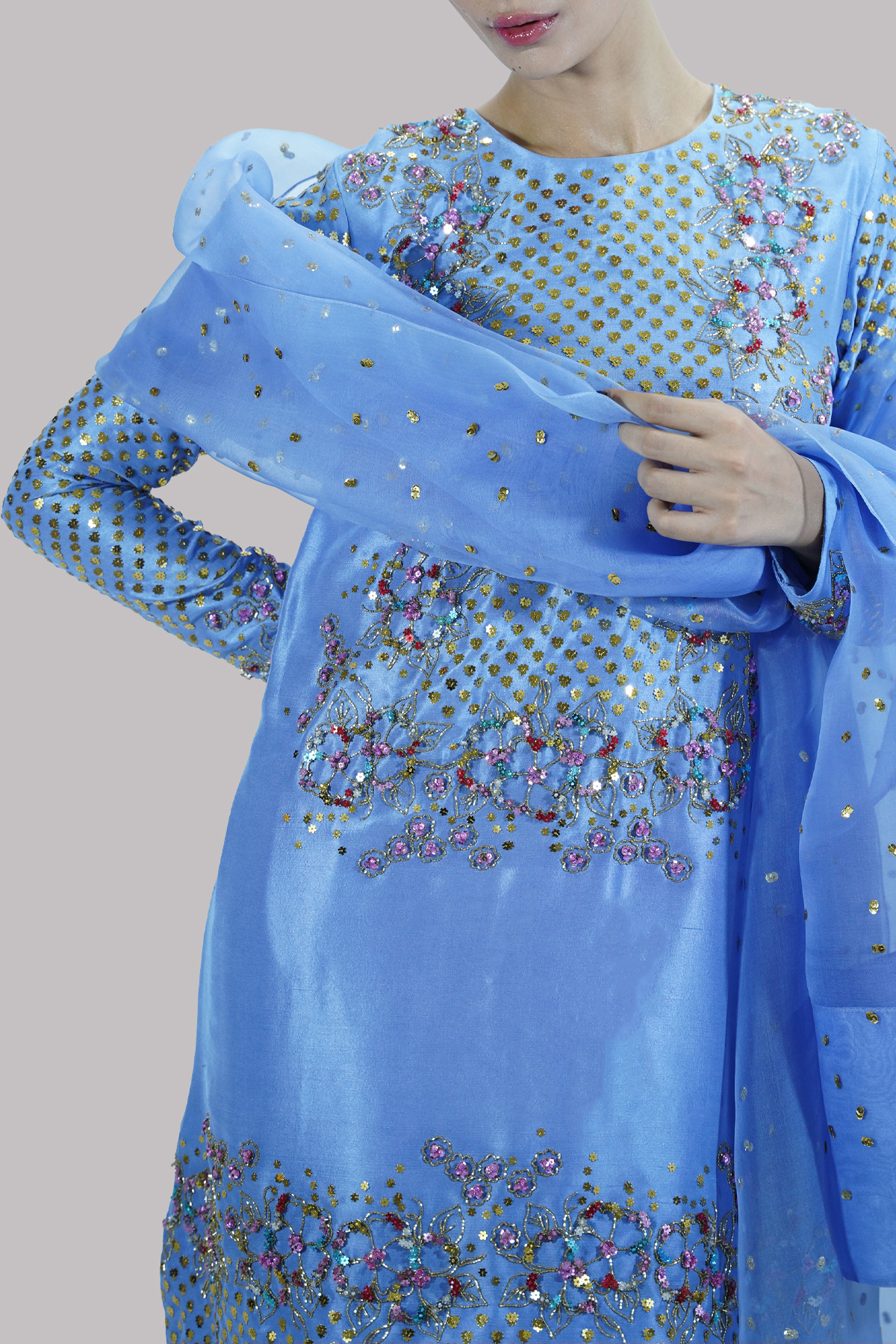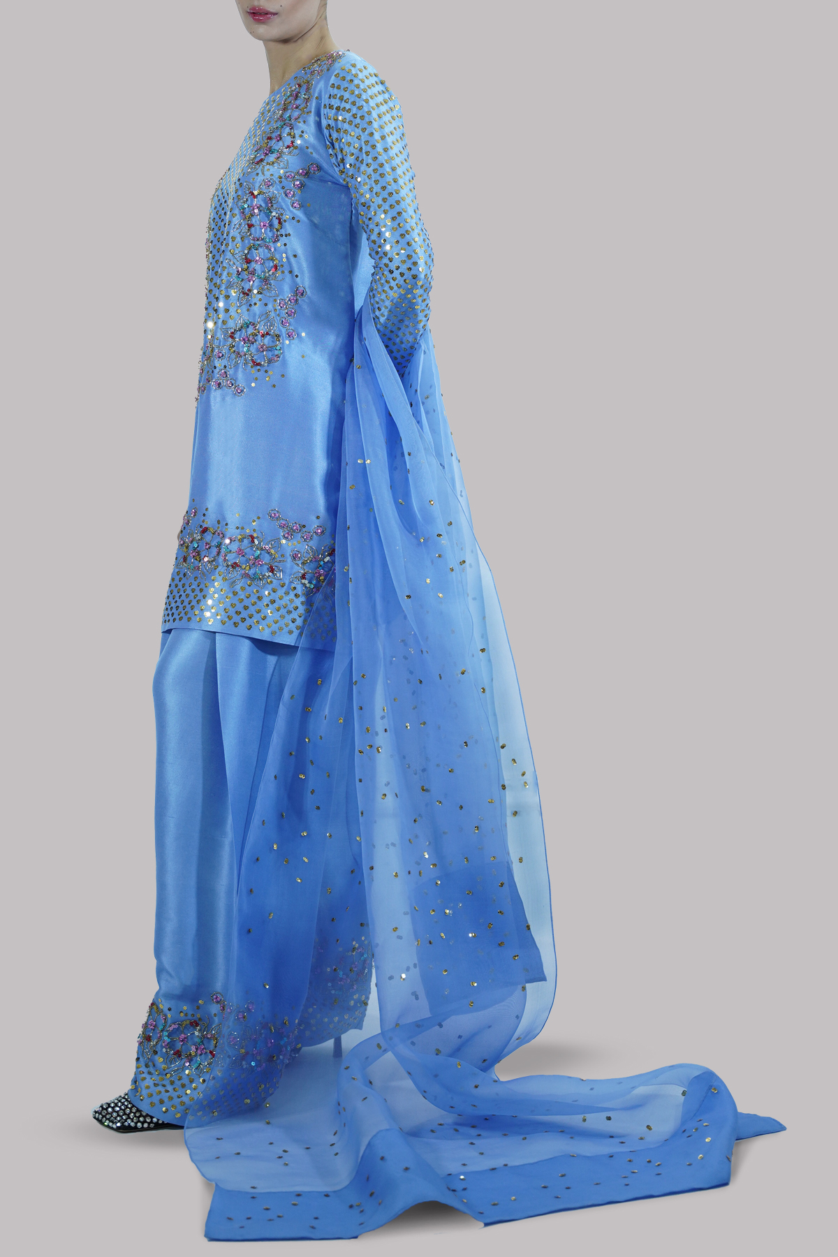 Indulge in the captivating allure of our Cornflower Blue Raw Silk Tunic. Adorned with shimmering crystals and sparkling sequins, this tunic features gracefully fitted sleeves and comes paired with a matching shalwar and a delicately embellished organza dupatta for an ensemble that exudes refined elegance.