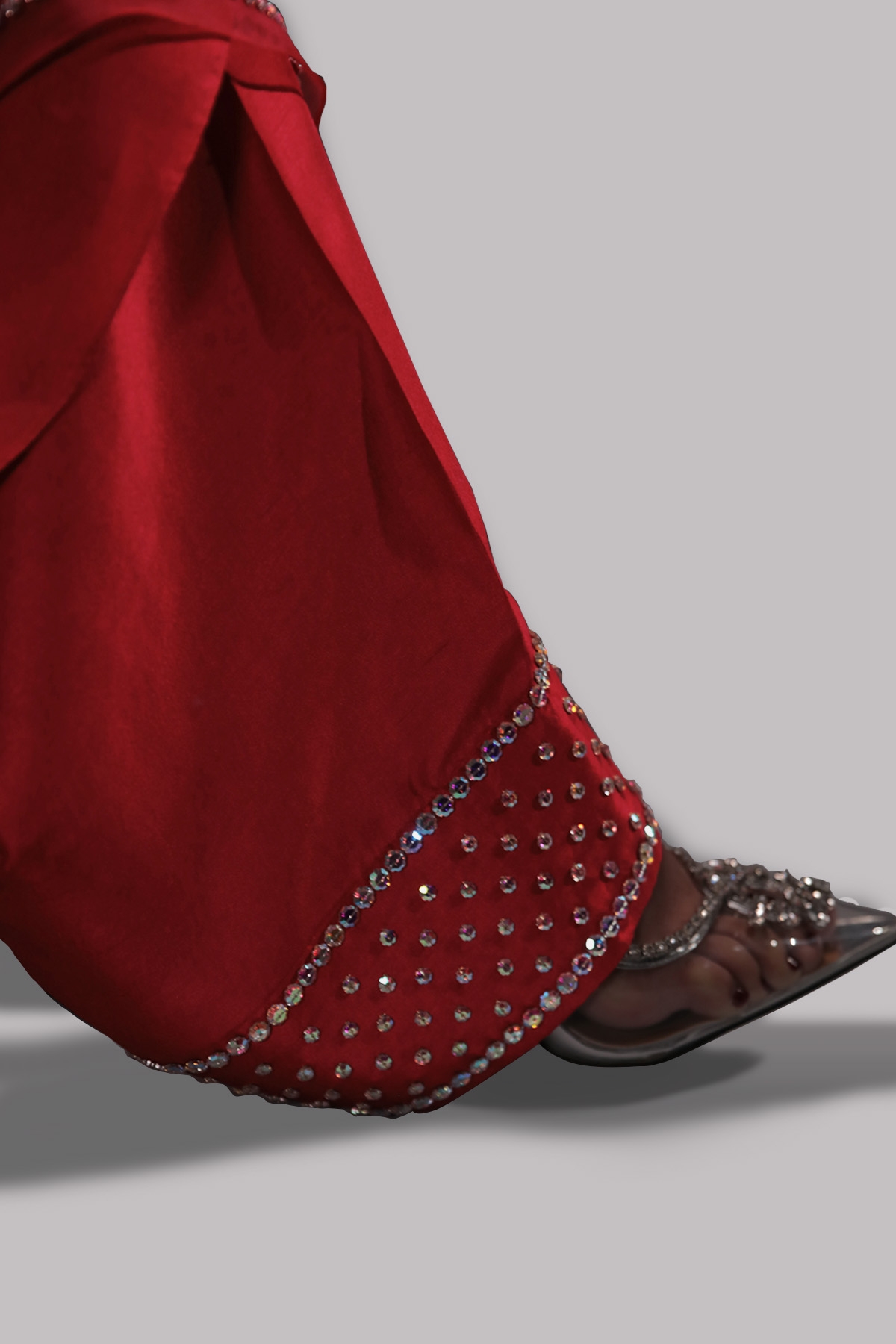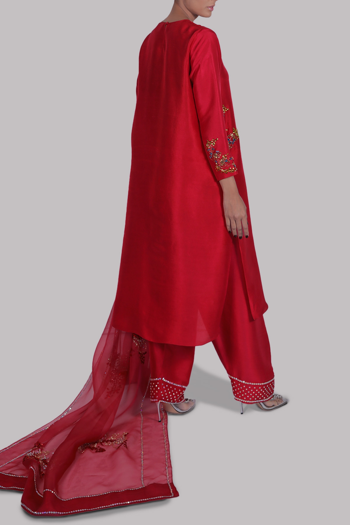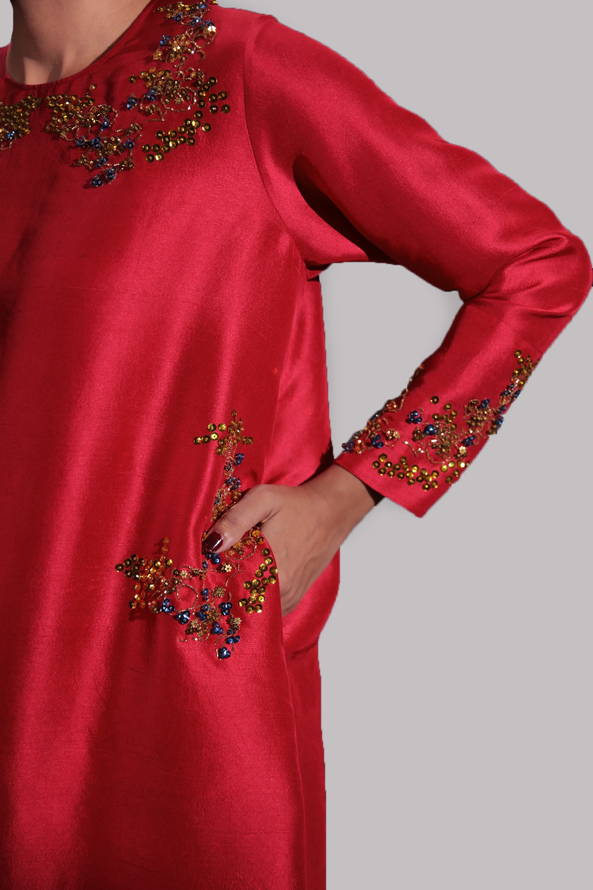 Crimson red, oversized raw silk top, hand embellished with multi-coloured French and Italian sequins. matching embellished raw silk shalwar pants and embellished organza dupatta.