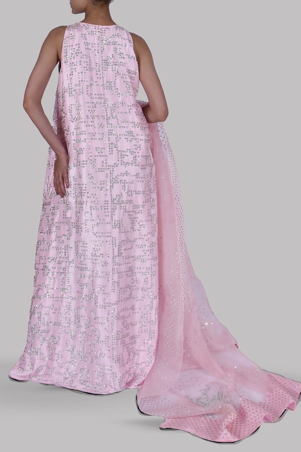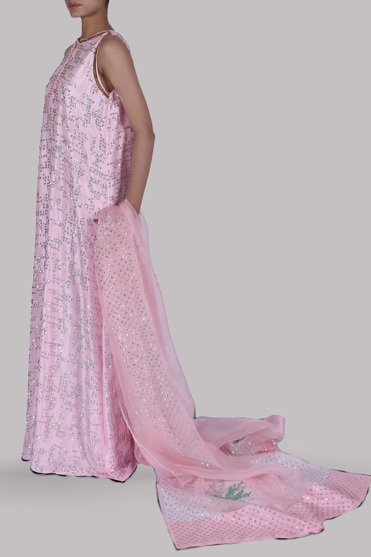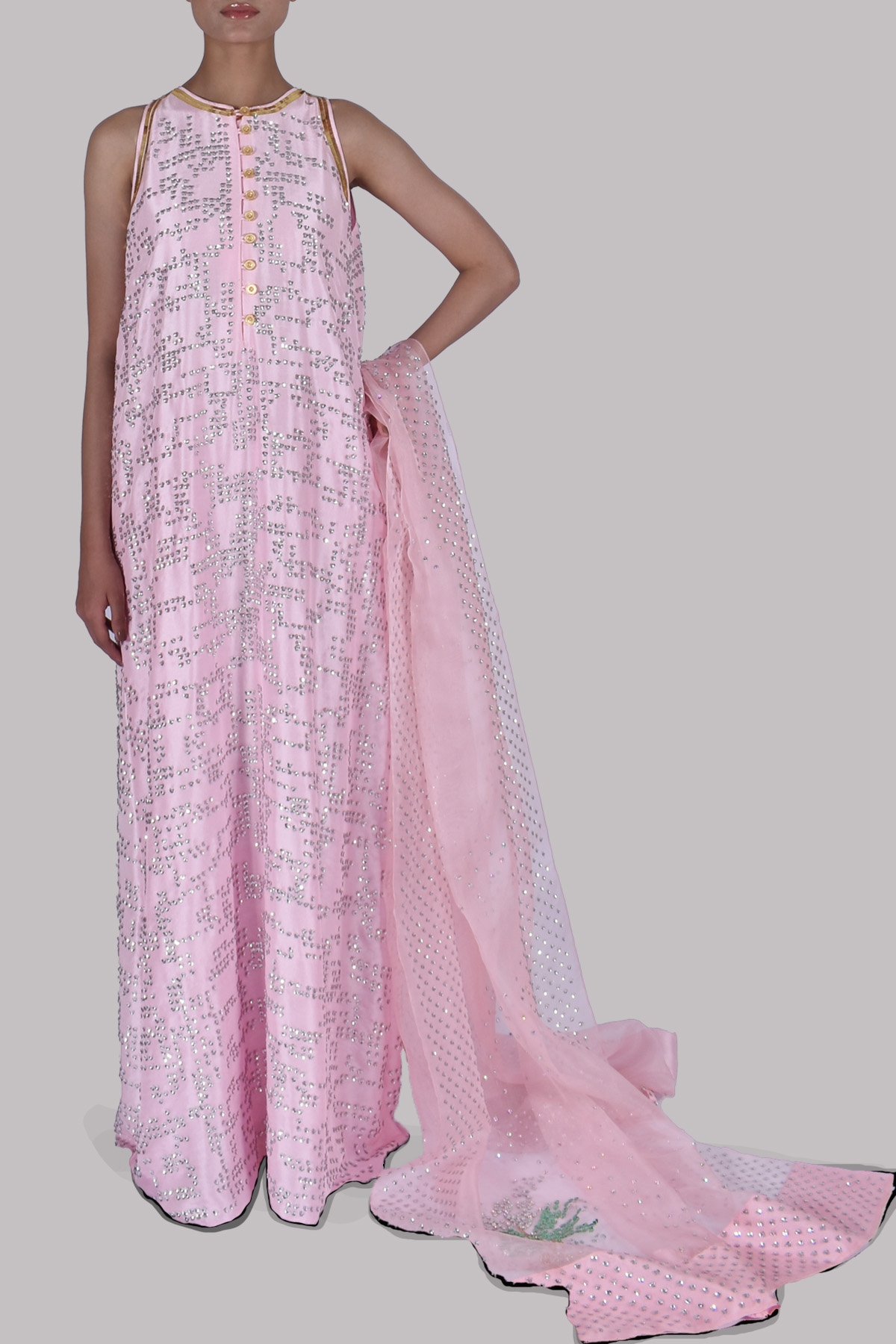 Crystal Rose close neck raw silk maxi with front button detail delicately hand-embellished with gold and silver sequins paired with an detailed embellished organza dupatta.
